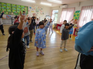 今日は焼き芋の予定でしたが、風が強くてできませんでした。明日できるといいのですが…。 今日は短大生が焼き芋のお手伝いに来てくれましたが、焼き芋ができないので一緒に遊んだり保育を参観したりしました。 きりん組さんはお遊戯会 […]