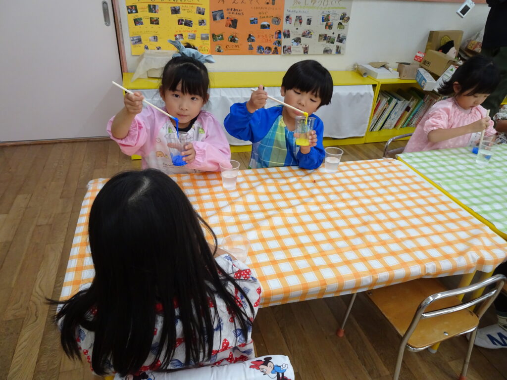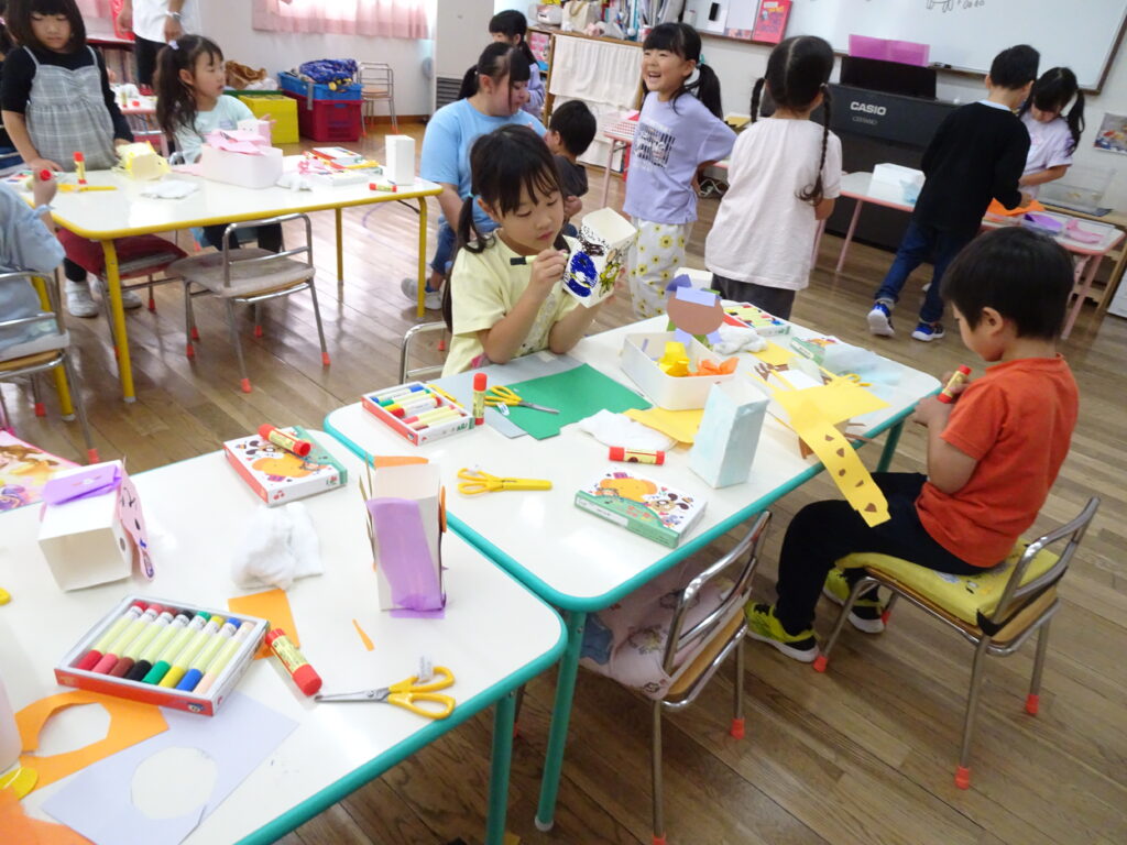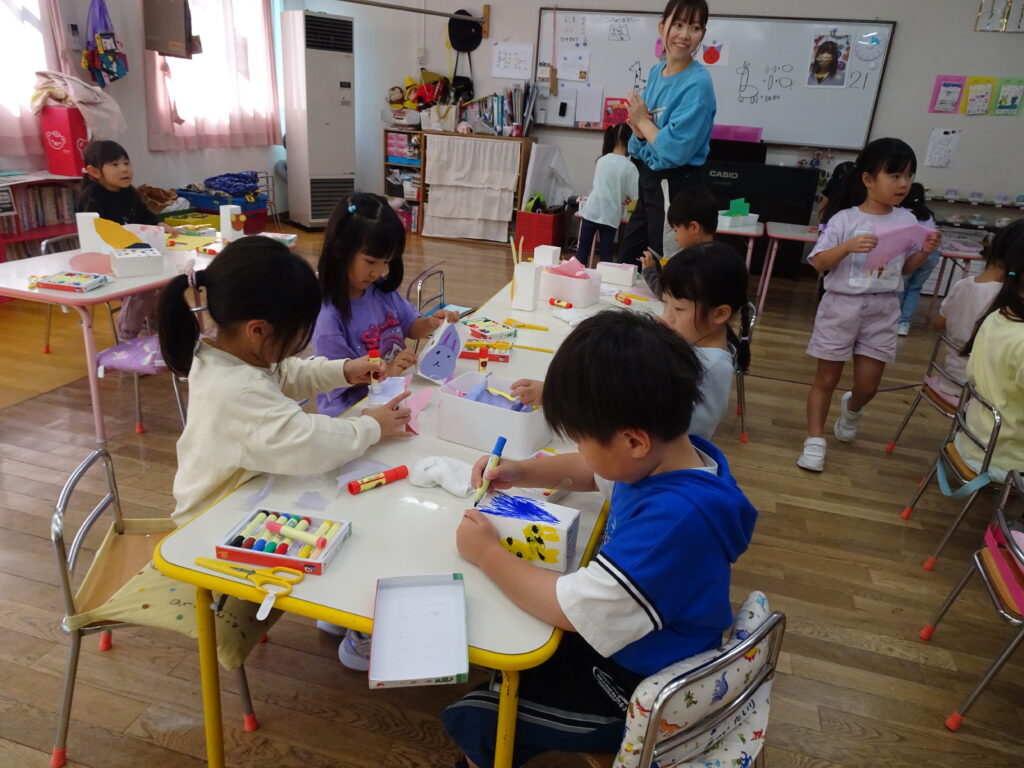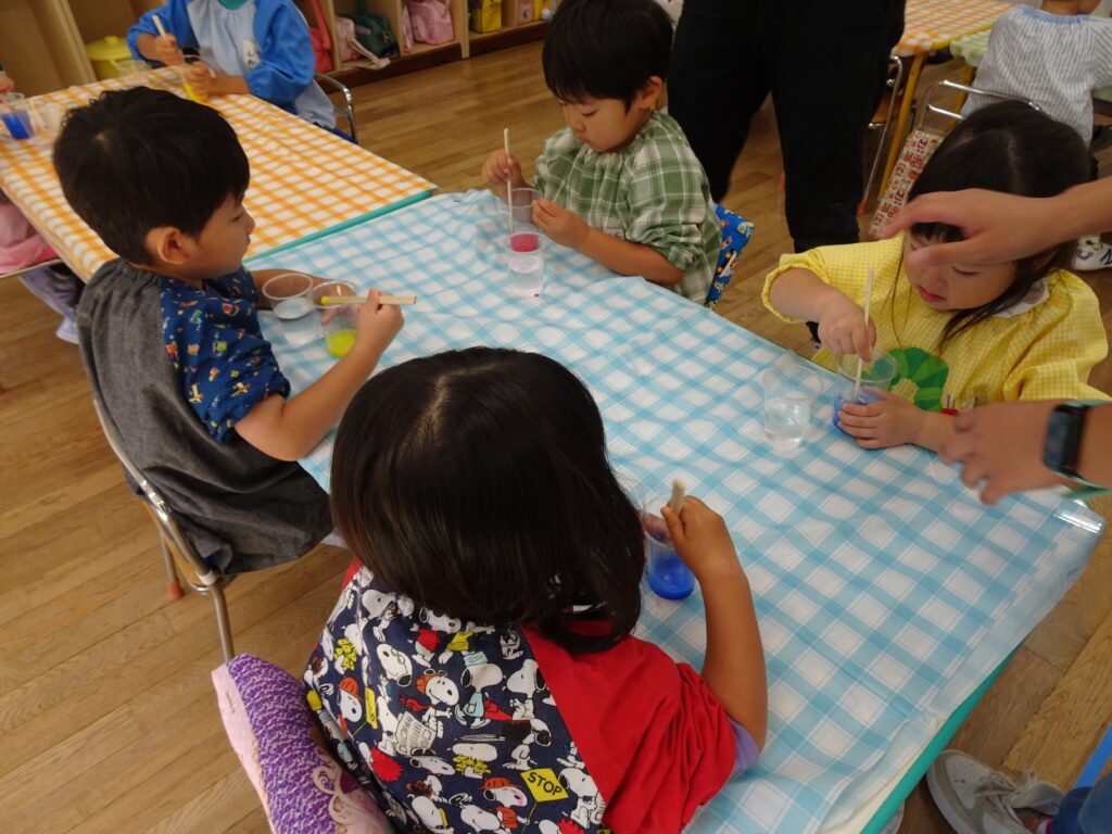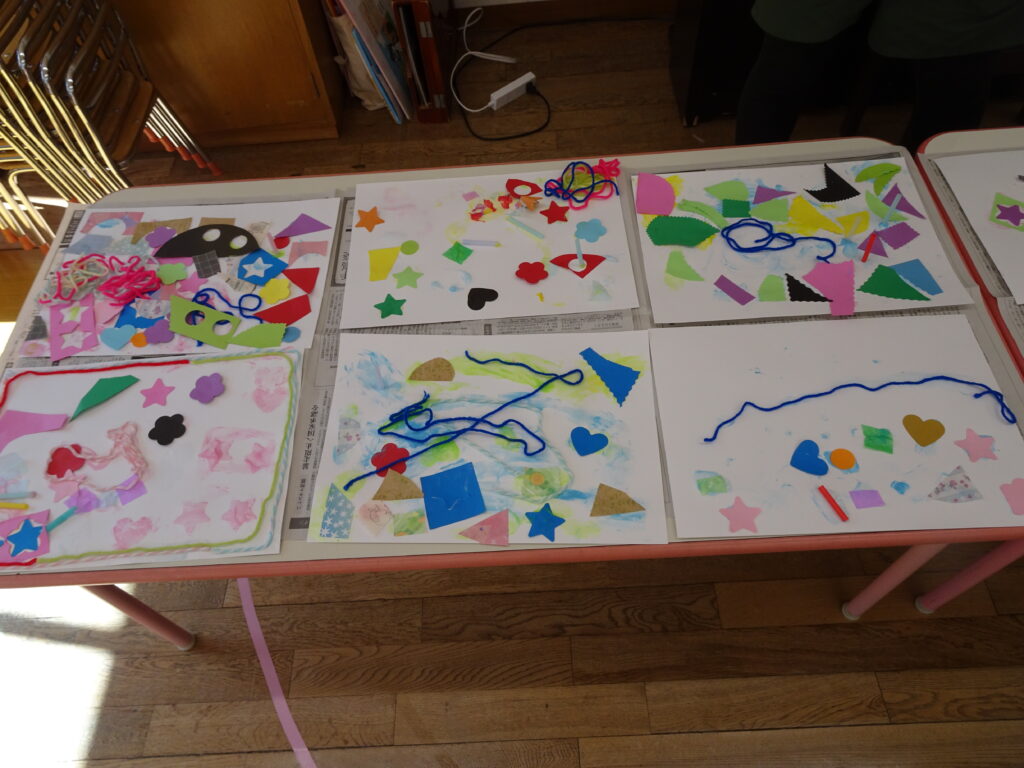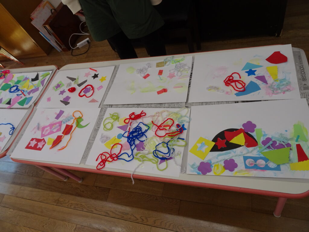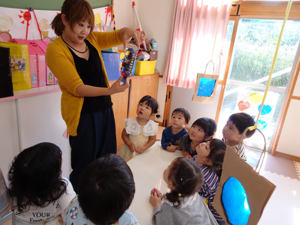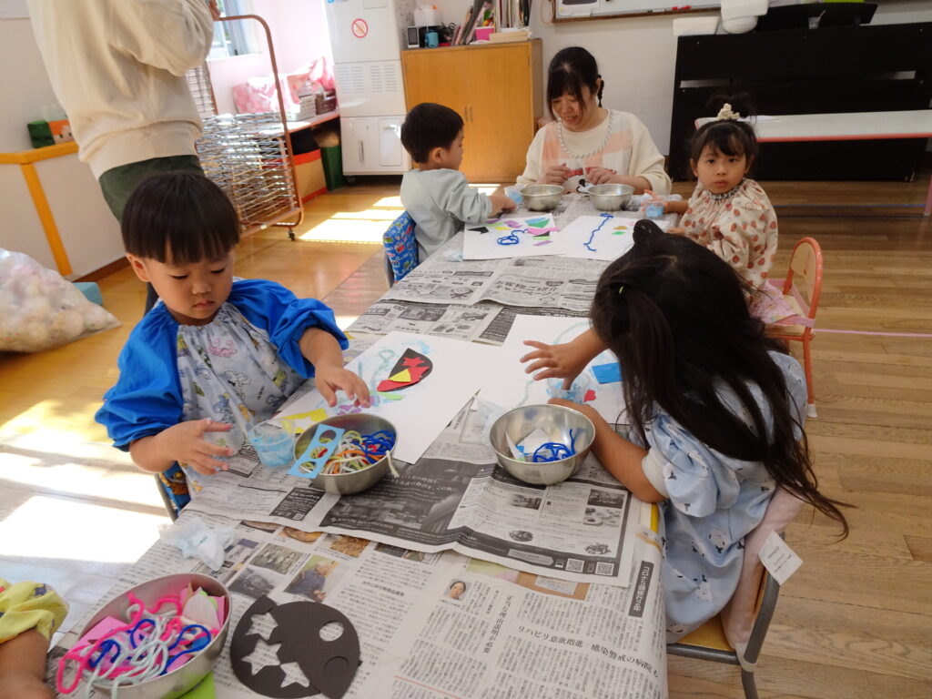 今日は担任交替の1回目でした。きりん組さんはかほ先生と「どうぶつランタン作り」、ぱんだ組さんはまどか先生と「スーパーボール作り」、うさぎ組さんはゆい先生と「コラージュ遊び」をしました。きりん組さんは、ウサギ、きりん、ハリネズミなど好きな動物を貼り付けて素敵なランタンを作りました。ぱんだ組さんは理科の実験の様に液体洗濯ノリとほうしゃ水を理科の実験の様に混ぜ合わせてスーパーボールを作りました。跳ねるボールが嬉しかったぱんだ組さんです。うさぎ組さんは、色紙、ストロー、毛糸などをたくさん貼り付けてコラージュ遊びをしました。担任の先生ではなくても、たくさん楽しんだ子ども達です。カンガルークラブさんは、お部屋にたくさん貼ったカラーセロファンのカラフルな光で遊びました。ペットボトルにカラーセロファンを入れて転がしたり、カラーセロファンの虫眼鏡?で園内を探検したりカラーセロファンで楽しんだカンガルークラブさんでした。昼食後の自由遊びでは、「ドロ団子作り」や「キャンプ遊び」を楽しみました。預かり保育の時間には、短大の学生さんが自作の「シカの紙芝居」の読み聞かせに来てくれました。「シカが来る?」いえいえ来たのは短大のお姉さんでした。