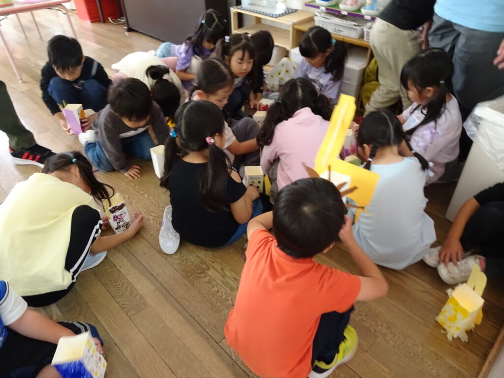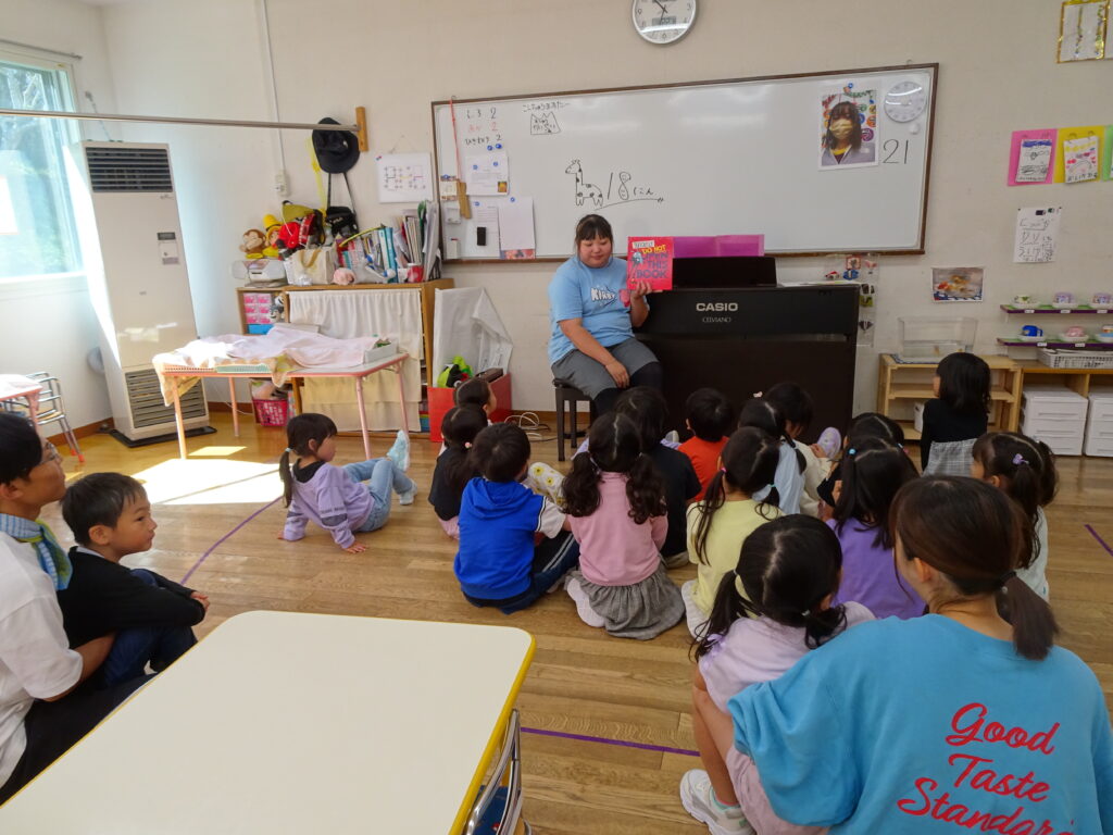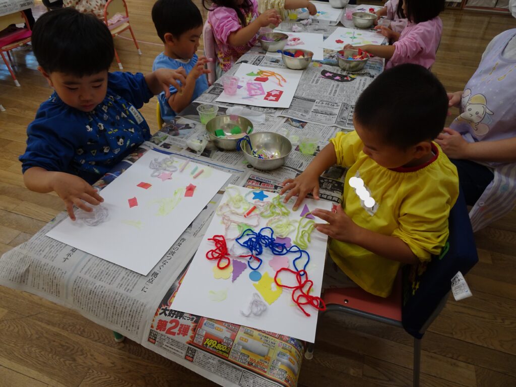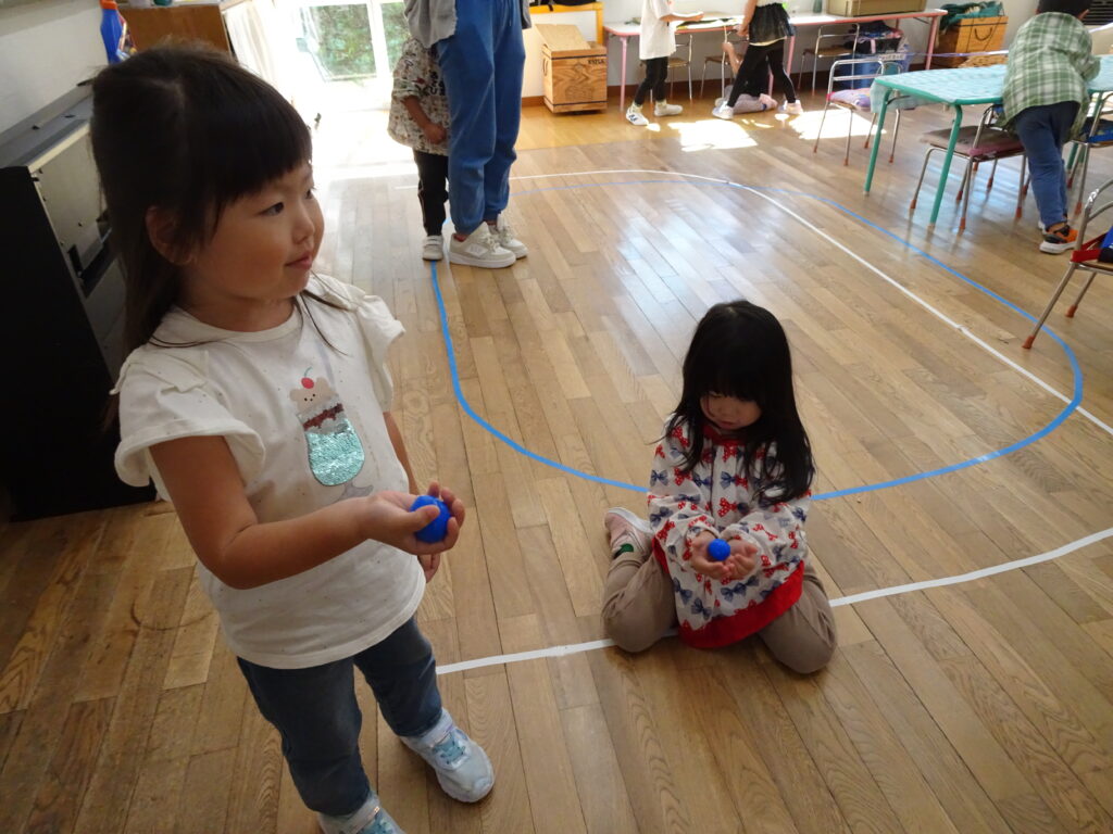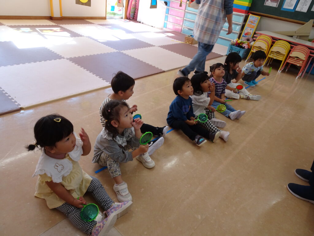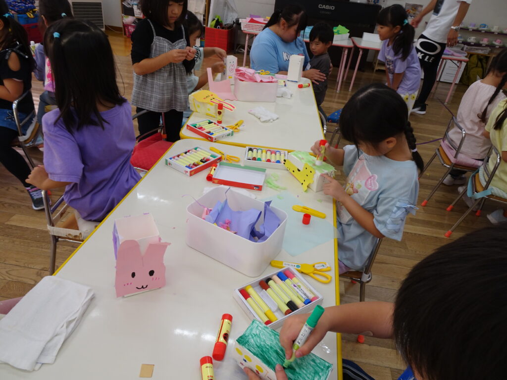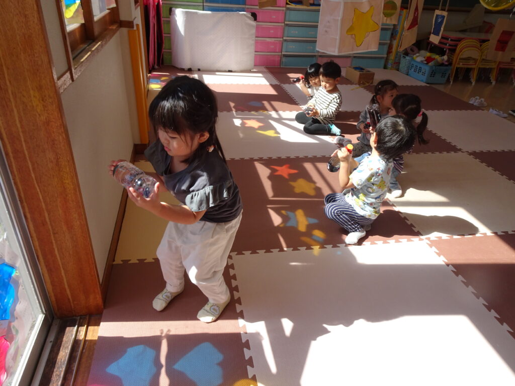 今日は担任交替の1回目でした。きりん組さんはかほ先生と「どうぶつランタン作り」、ぱんだ組さんはまどか先生と「スーパーボール作り」、うさぎ組さんはゆい先生と「コラージュ遊び」をしました。きりん組さんは、ウサギ、きりん、ハリネズミなど好きな動物を貼り付けて素敵なランタンを作りました。ぱんだ組さんは理科の実験の様に液体洗濯ノリとほうしゃ水を理科の実験の様に混ぜ合わせてスーパーボールを作りました。跳ねるボールが嬉しかったぱんだ組さんです。うさぎ組さんは、色紙、ストロー、毛糸などをたくさん貼り付けてコラージュ遊びをしました。担任の先生ではなくても、たくさん楽しんだ子ども達です。カンガルークラブさんは、お部屋にたくさん貼ったカラーセロファンのカラフルな光で遊びました。ペットボトルにカラーセロファンを入れて転がしたり、カラーセロファンの虫眼鏡?で園内を探検したりカラーセロファンで楽しんだカンガルークラブさんでした。昼食後の自由遊びでは、「ドロ団子作り」や「キャンプ遊び」を楽しみました。預かり保育の時間には、短大の学生さんが自作の「シカの紙芝居」の読み聞かせに来てくれました。「シカが来る?」いえいえ来たのは短大のお姉さんでした。
