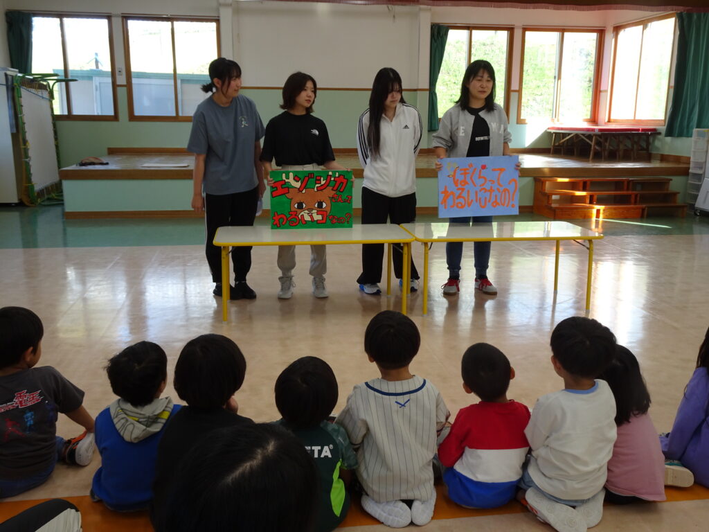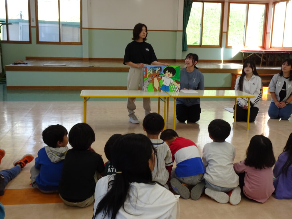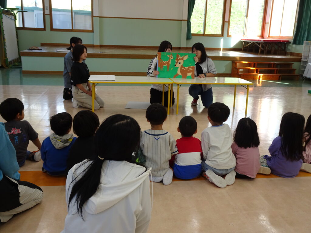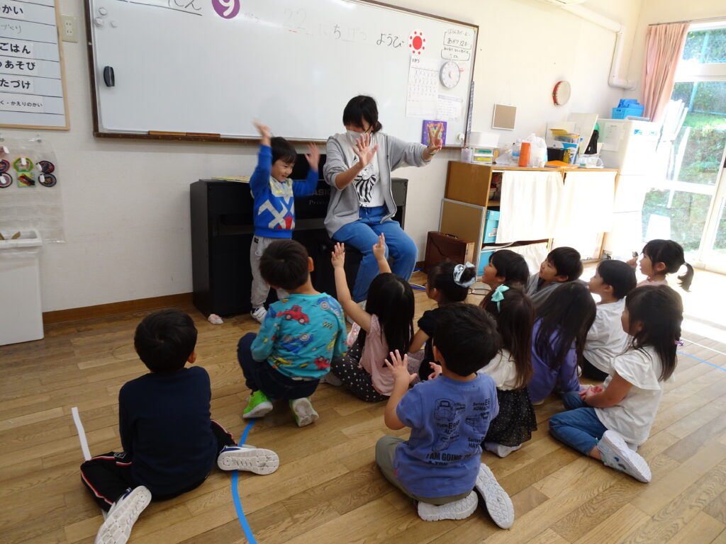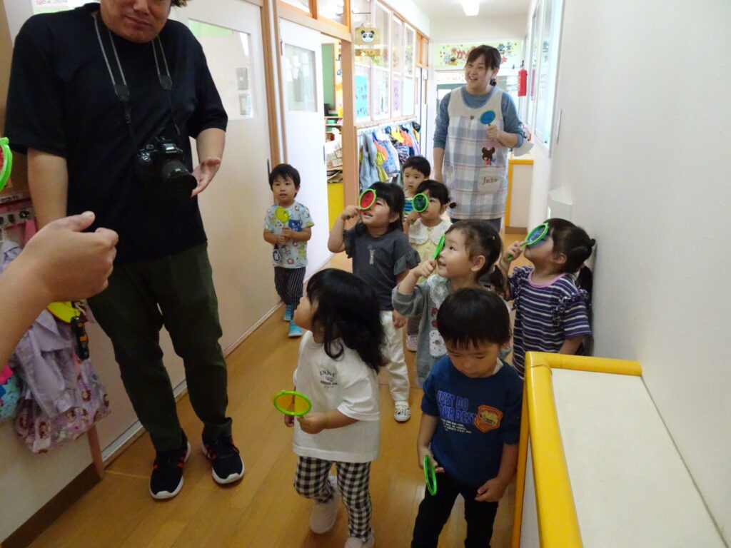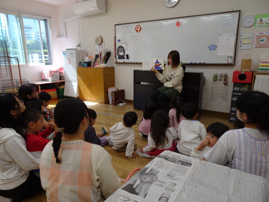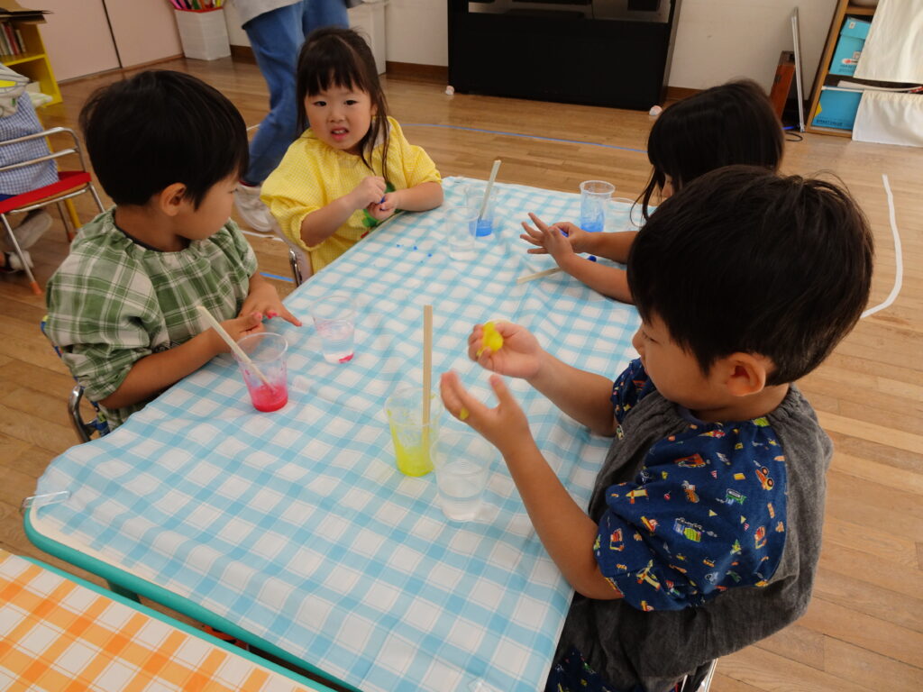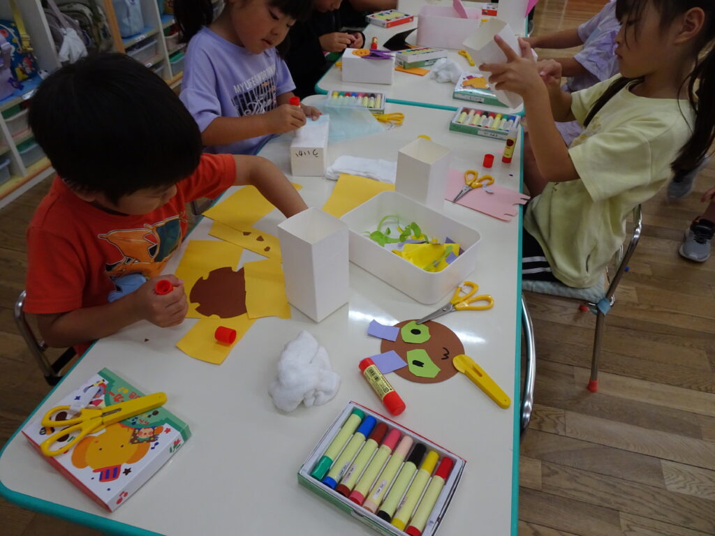 今日は担任交替の1回目でした。きりん組さんはかほ先生と「どうぶつランタン作り」、ぱんだ組さんはまどか先生と「スーパーボール作り」、うさぎ組さんはゆい先生と「コラージュ遊び」をしました。きりん組さんは、ウサギ、きりん、ハリネズミなど好きな動物を貼り付けて素敵なランタンを作りました。ぱんだ組さんは理科の実験の様に液体洗濯ノリとほうしゃ水を理科の実験の様に混ぜ合わせてスーパーボールを作りました。跳ねるボールが嬉しかったぱんだ組さんです。うさぎ組さんは、色紙、ストロー、毛糸などをたくさん貼り付けてコラージュ遊びをしました。担任の先生ではなくても、たくさん楽しんだ子ども達です。カンガルークラブさんは、お部屋にたくさん貼ったカラーセロファンのカラフルな光で遊びました。ペットボトルにカラーセロファンを入れて転がしたり、カラーセロファンの虫眼鏡?で園内を探検したりカラーセロファンで楽しんだカンガルークラブさんでした。昼食後の自由遊びでは、「ドロ団子作り」や「キャンプ遊び」を楽しみました。預かり保育の時間には、短大の学生さんが自作の「シカの紙芝居」の読み聞かせに来てくれました。「シカが来る?」いえいえ来たのは短大のお姉さんでした。