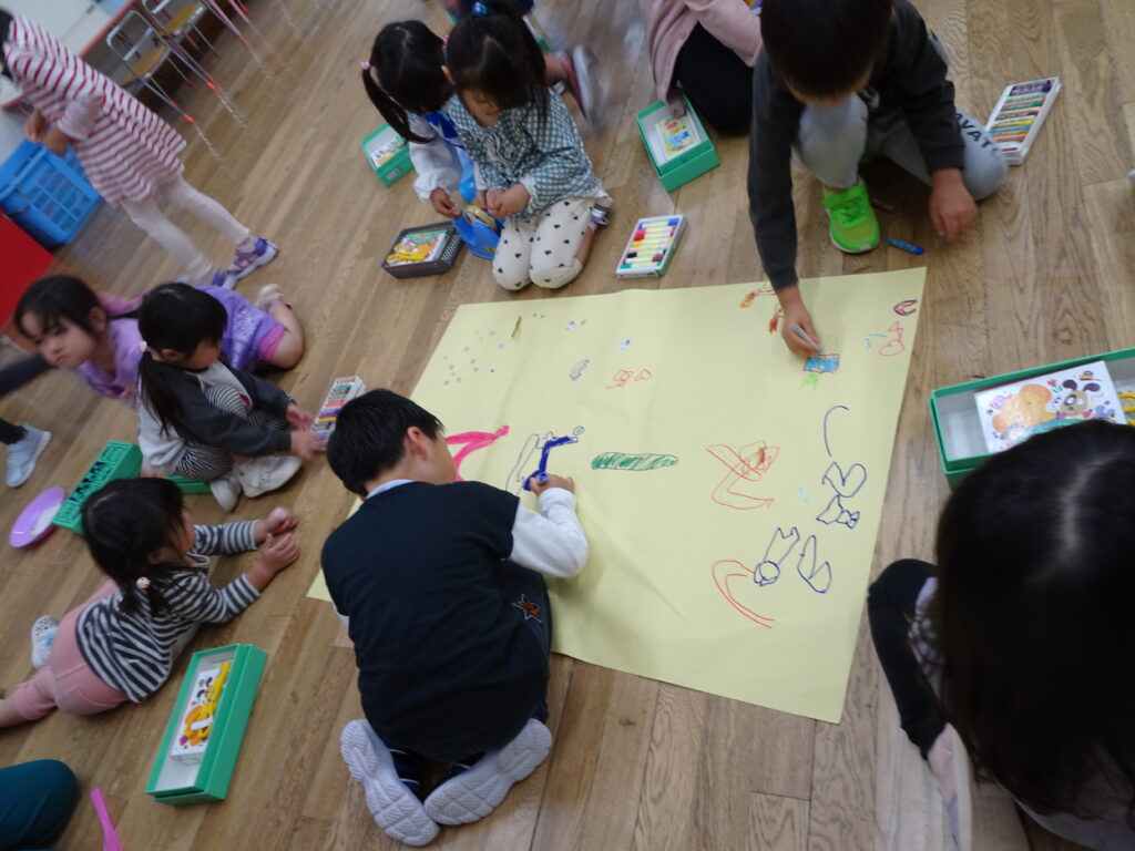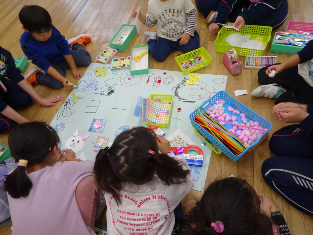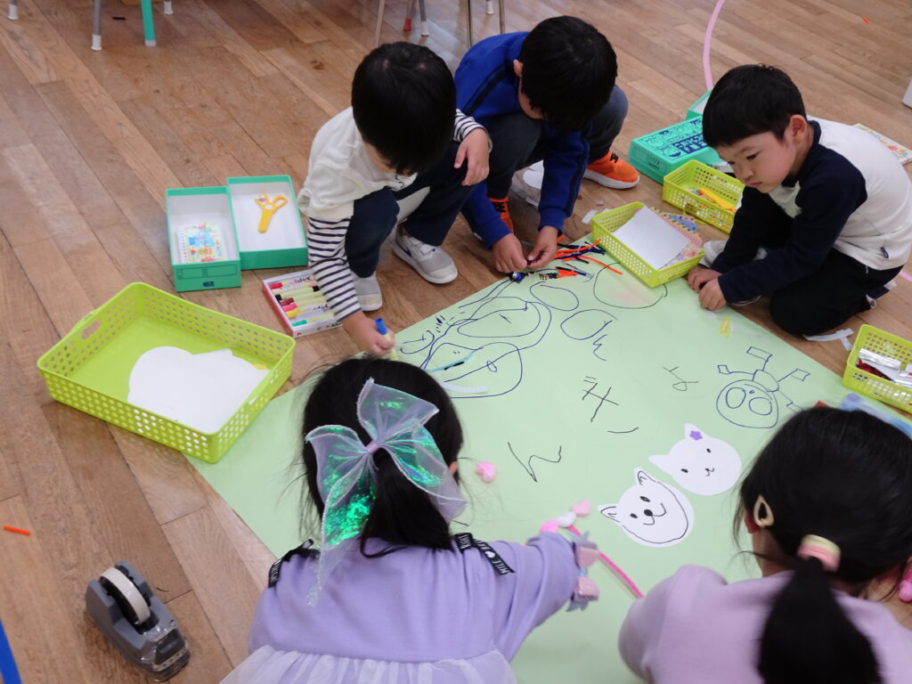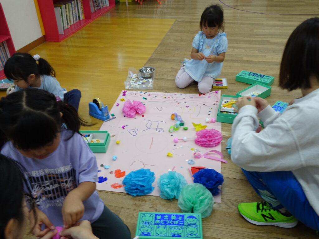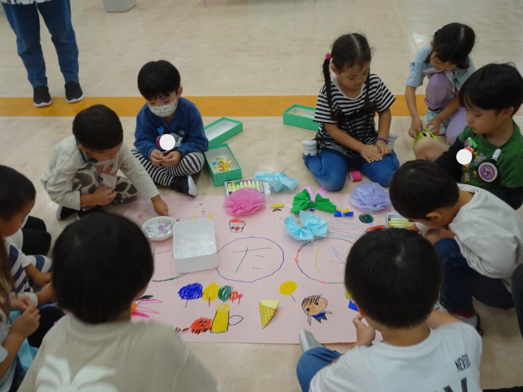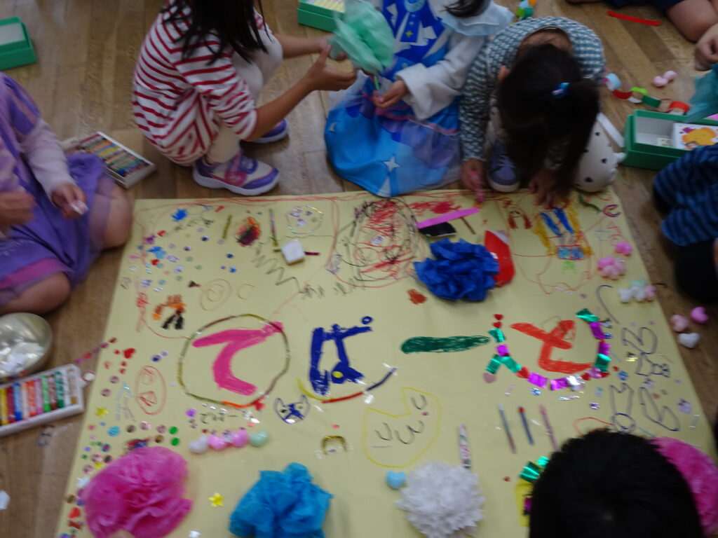 今日はみんなで「ふぞくこども祭」の看板づくりをしました。各コーナー毎に分かれて前半・後半の当番を決めてから、お店の看板を作りました。ヨーヨー釣り、金魚すくい、屋台、デパート、屋台、くじ引きの素敵な看板を作りました。きりんさんが字を書いて、シールを貼ったり、お花を付けたり、絵を描いたり、高校生のお兄さんお姉さんもお手伝いしてくれました。10月1日の当日が楽しみです。