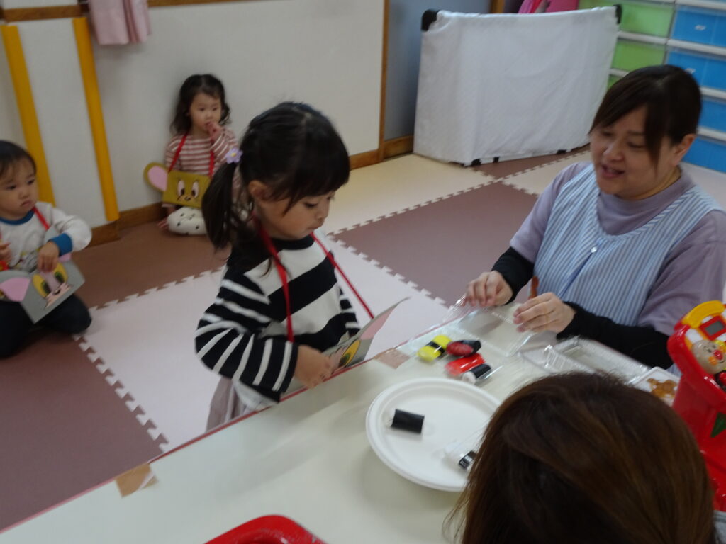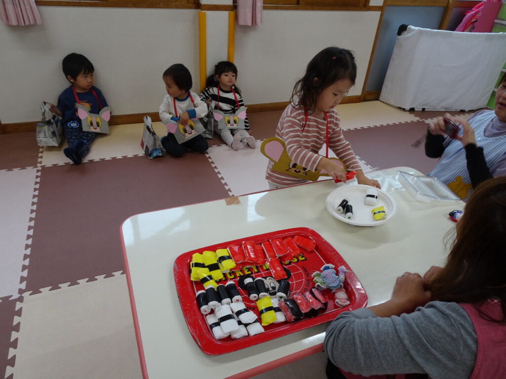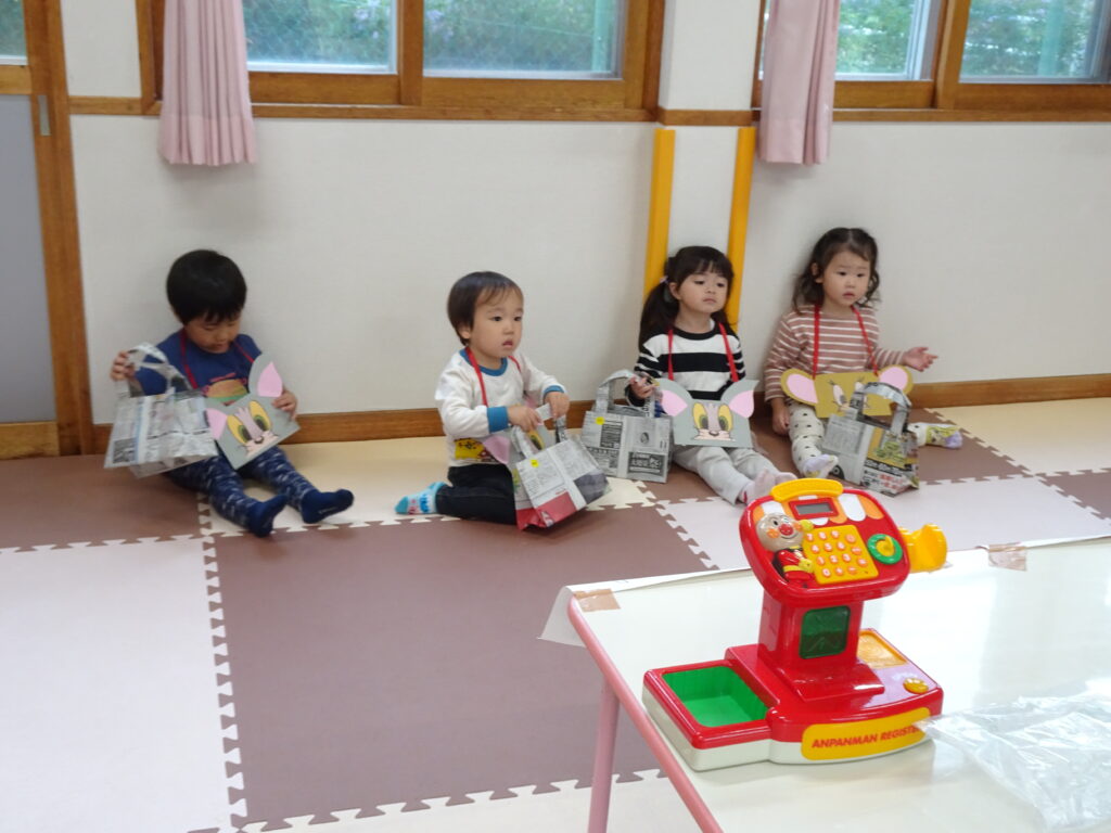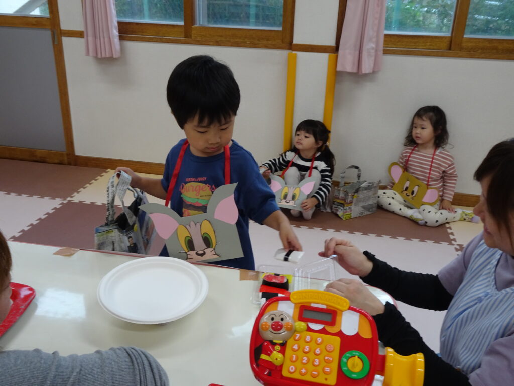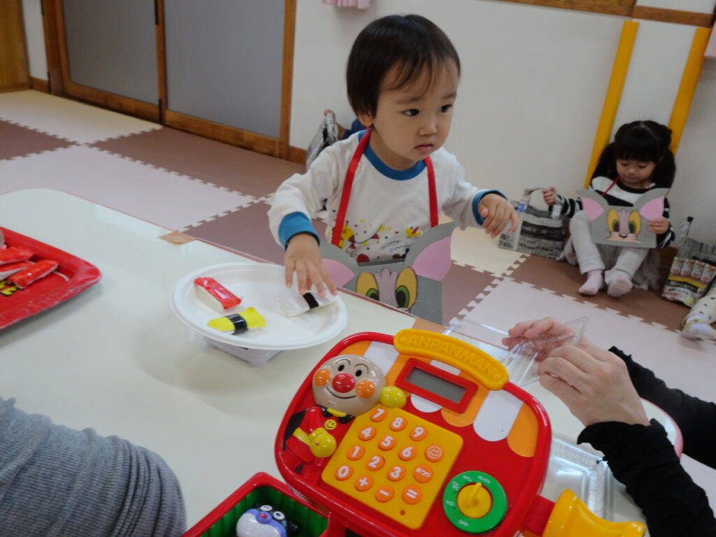 カンガルークラブさんは、お買い物ごっこの2日目をしました。雑貨屋さんで小物を買ってから、クルクル回るお寿司をパックに入れて買いました。お財布から出して、お金を払って上手に買えました。