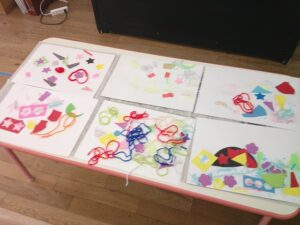 今日はみんなで「ふぞくこども祭」の看板づくりをしました。各コーナー毎に分かれて前半・後半の当番を決めてから、お店の看板を作りました。ヨーヨー釣り、金魚すくい、屋台、デパート、屋台、くじ引きの素敵な看板を作りました。きりんさんが字を書いて、シールを貼ったり、お花を付けたり、絵を描いたり、高校生のお兄さんお姉さんもお手伝いしてくれました。10月1日の当日が楽しみです。