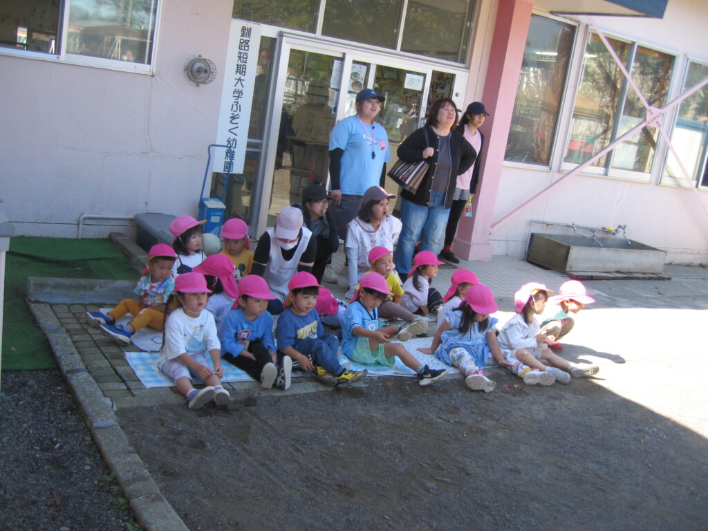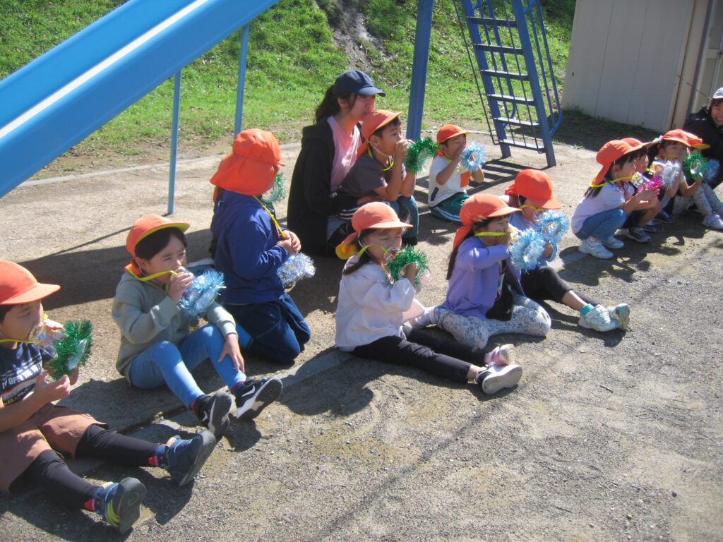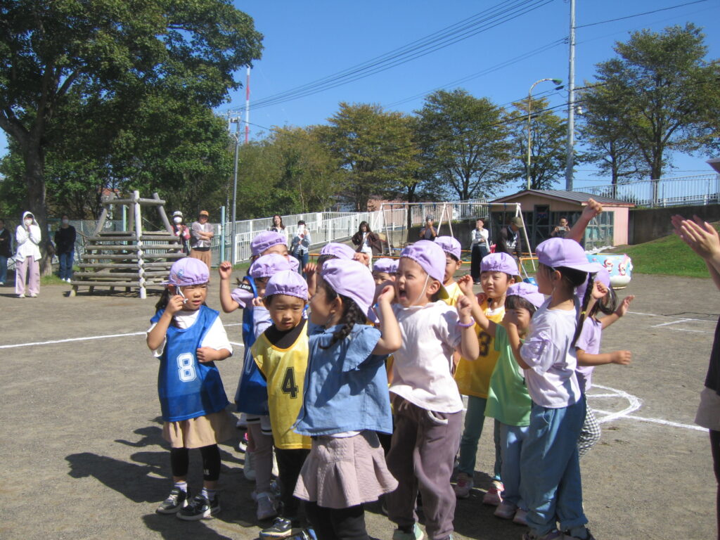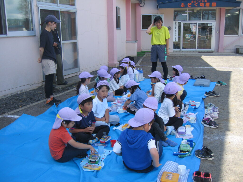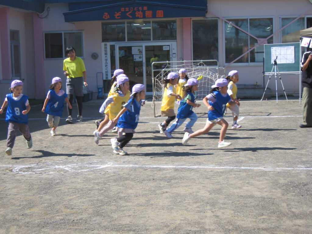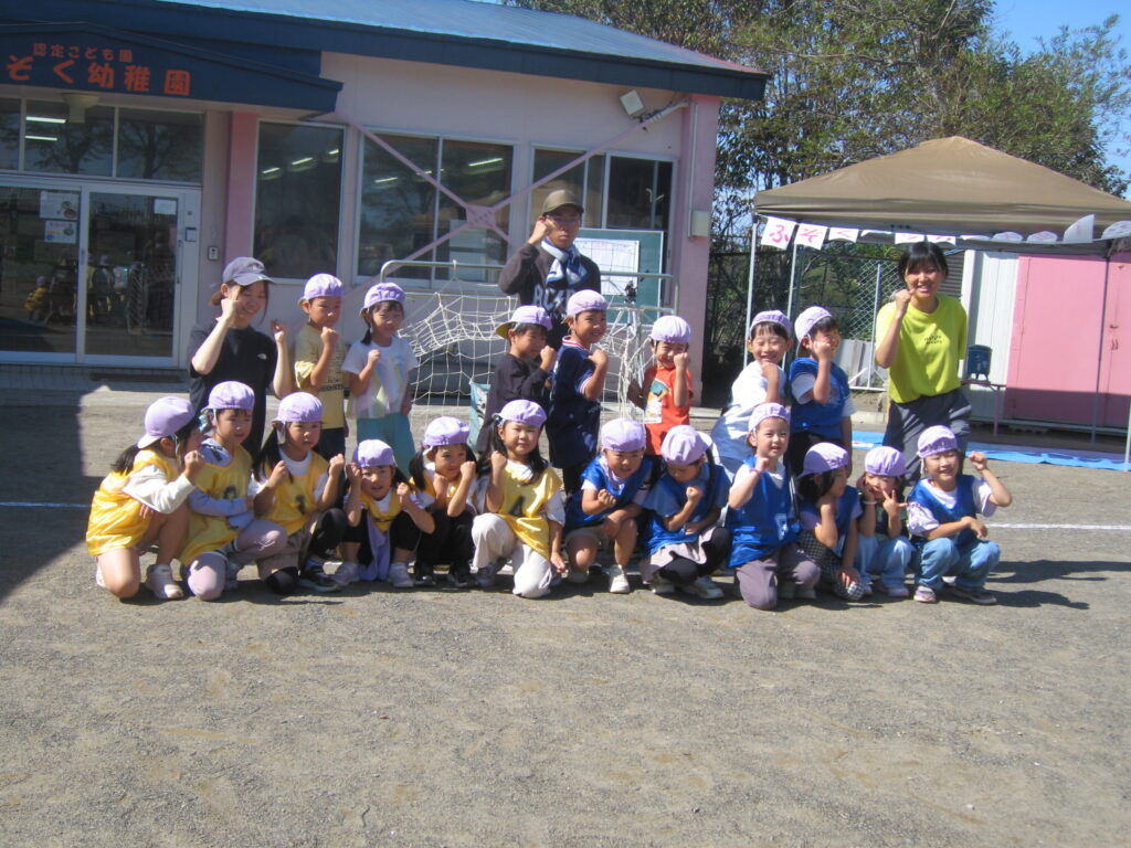 今日はサッカー交流会の予定でしたが、会場園の園児さんの体調が良くないとのことで、ふぞく幼稚園の園庭で「ふぞくサッカー大会」を行いました。3チームのリーグ戦を行って勝ったり負けたり、ボールを上手に追いかけました。最後には、先生チームとの対戦で、こちらも勝ったり負けたり頑張りました。最初はどっちのゴールに入れるのかもわからなかったのですが、サッカーの練習を重ね、自由遊びでも楽しみ、少しずつルールも覚えました。今日は、そのまま園庭にブルーシートを敷いて、その上でご飯を食べました。ぱんだ組さんは、自分達で作った応援グッズを持って応援しました。うさぎ組さんは「お買い物オニごっこ」をしてからサッカーの応援をしました。カンガルークラブさんもサッカーの応援をしてからお部屋で「ボール遊び」をしました。