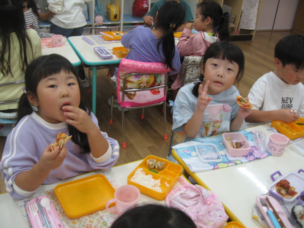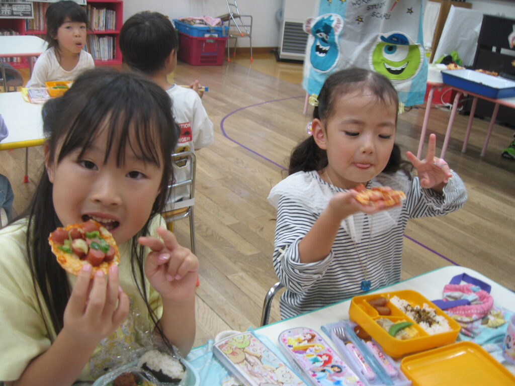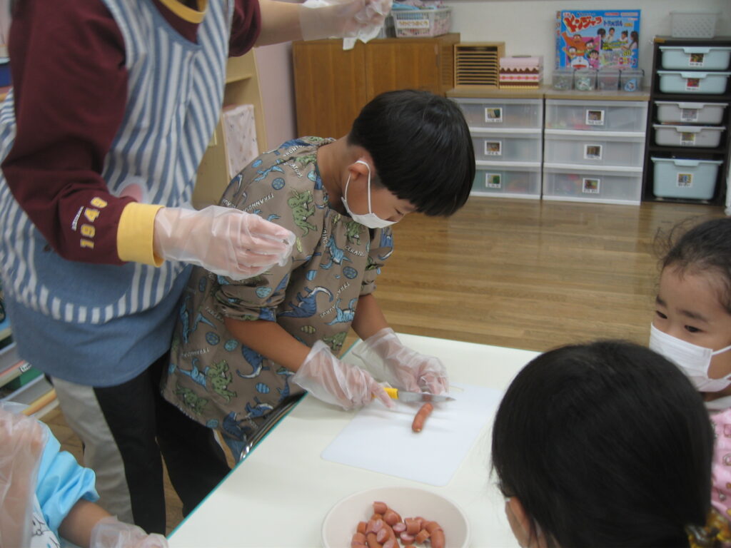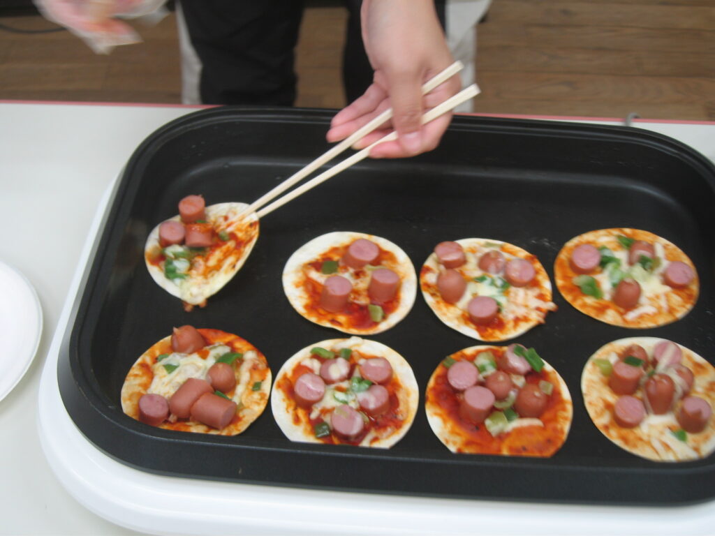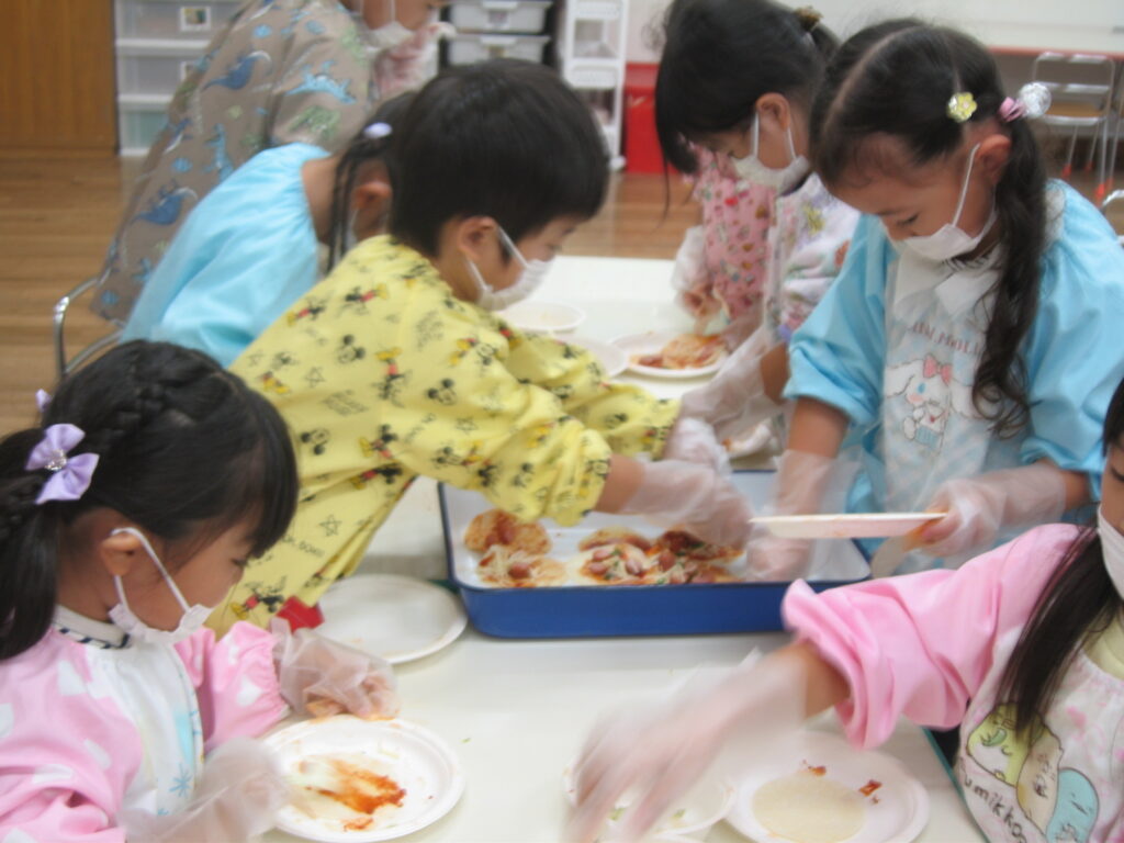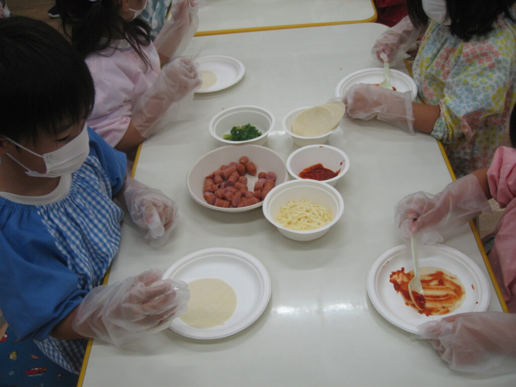 今日きりん組さんは、クッキングでピザを作りました。自分たちでウインナーを切り、餃子の皮に、ピザソース、チーズ、ウインナー、自分たちで育てたピーマンをトッピングしてホットプレートで焼きました。「おいしい!」「お代わり!!」とたくさん食べたきりん組さんです。