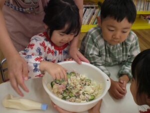 今日きりん組さんは、クッキングでピザを作りました。自分たちでウインナーを切り、餃子の皮に、ピザソース、チーズ、ウインナー、自分たちで育てたピーマンをトッピングしてホットプレートで焼きました。「おいしい!」「お代わり!!」とたくさん食べたきりん組さんです。