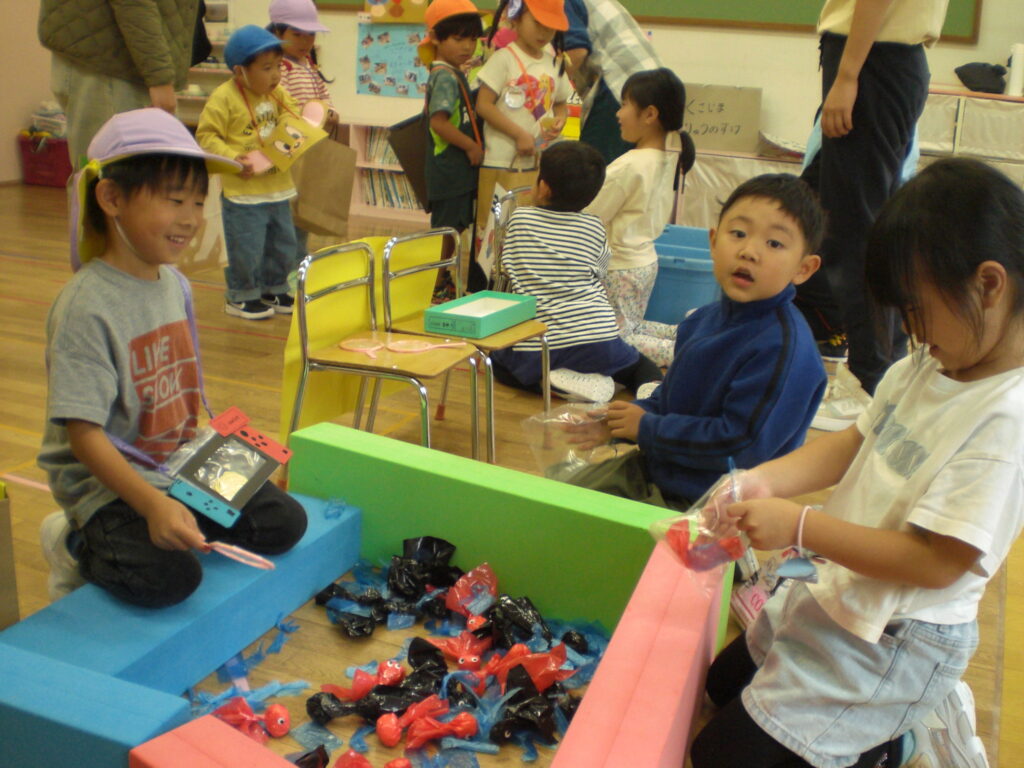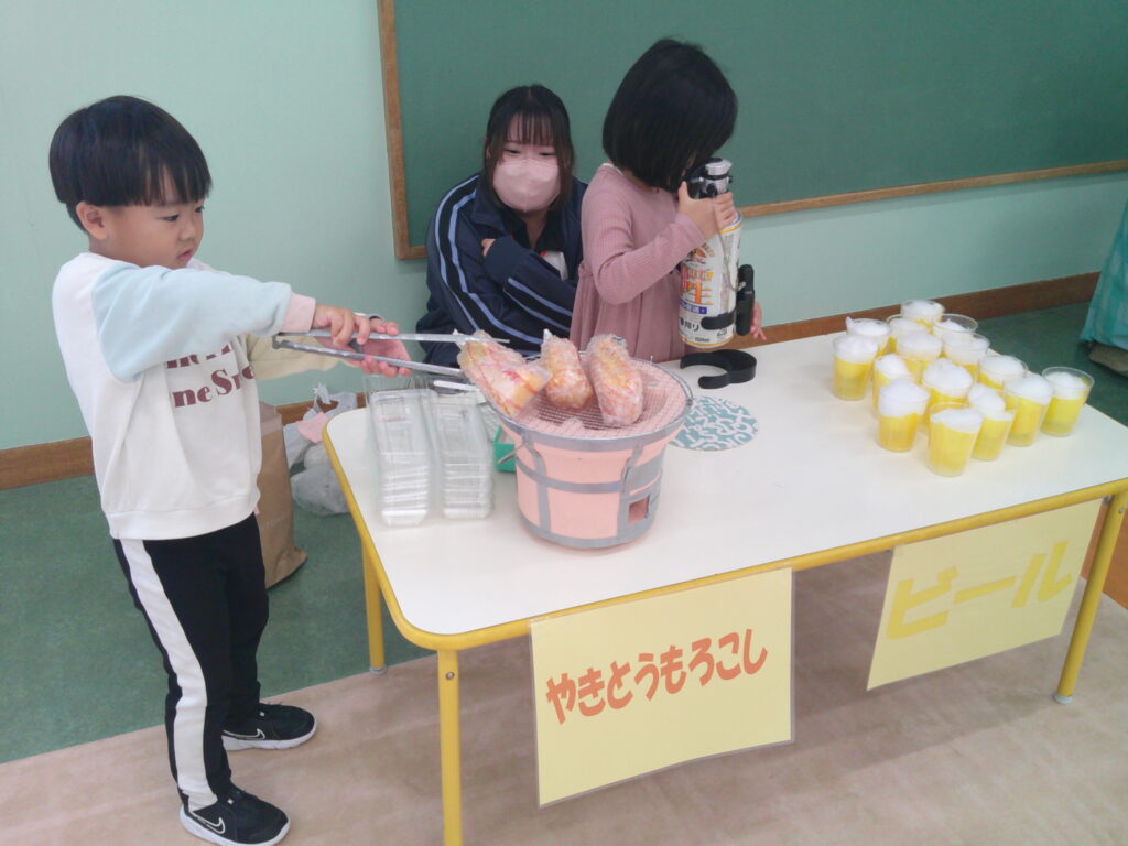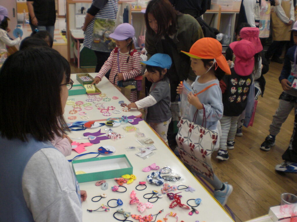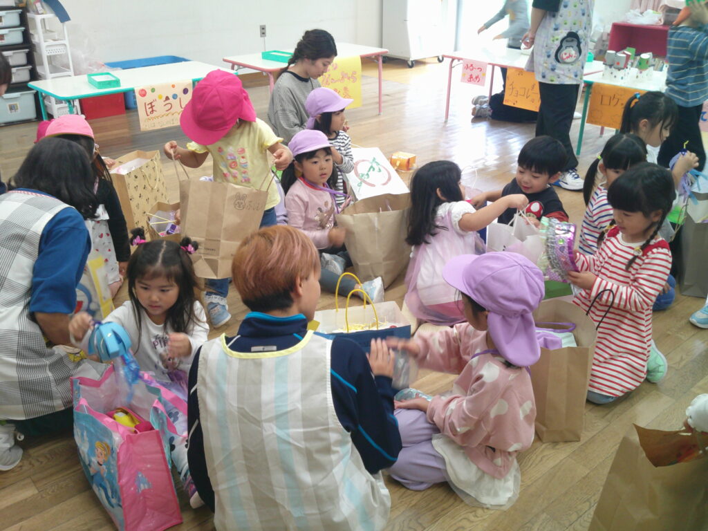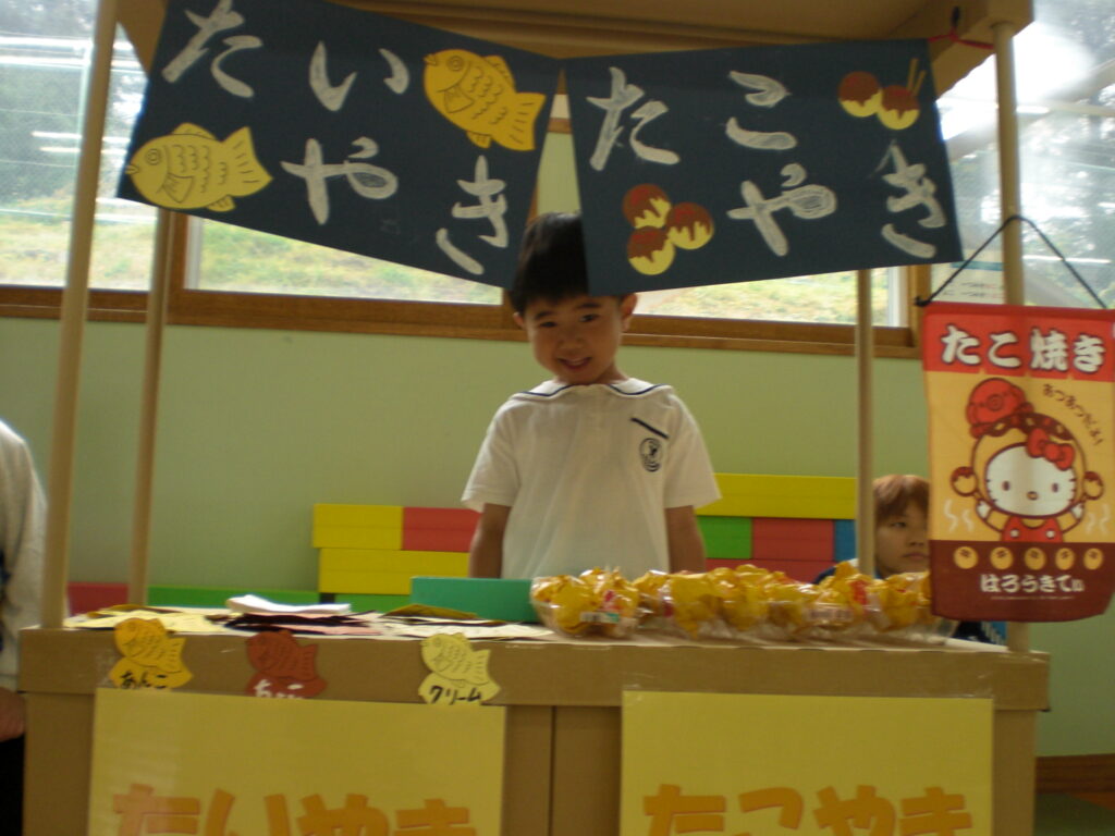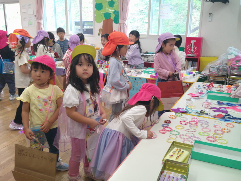 お遊戯室、きりん組、うさぎ組の3部屋には、縦割りグループで作った品物、お母さん達から寄せられたたくさんの手作り品が並んで、子ども他達はとても嬉しそうでした。自分で作ったお財布に入っているお金10枚で、持ってきた袋いっぱいのお買い物をしていました。売り手のお友達は「いらっしゃい、いらっしゃい!」「焼きそば美味しいよ!」「ヨーヨーつりしませんか?」とお手伝いに来てくれた短大の学生さんと一緒に大きな声を出していました。ラーメンや焼きそばを作ったり、たこ焼きを詰めたり、金魚すくいをしたり…、お店の仕事をがんばりました。買った品物は今日持ち帰りましたので、お家でも楽しんでください。今日のこども祭りでは、本物のぶどうジュースが出ました。