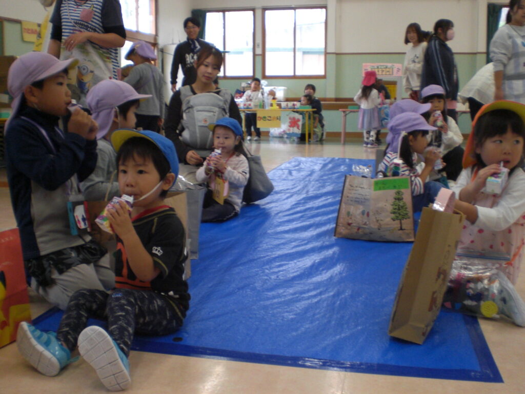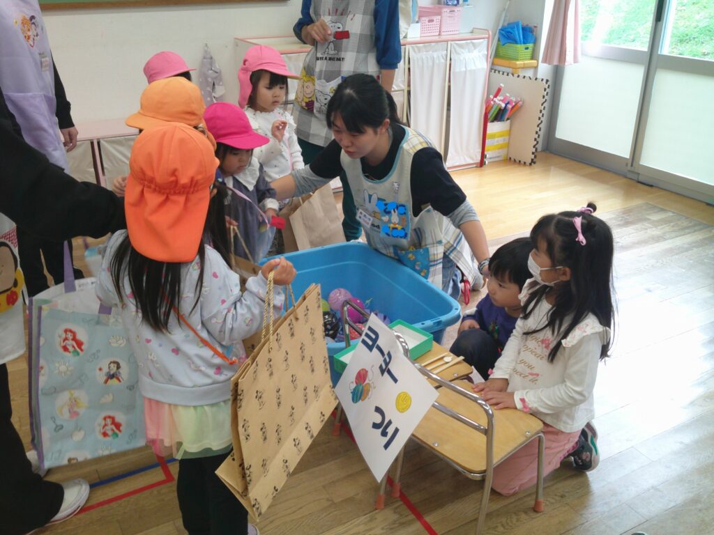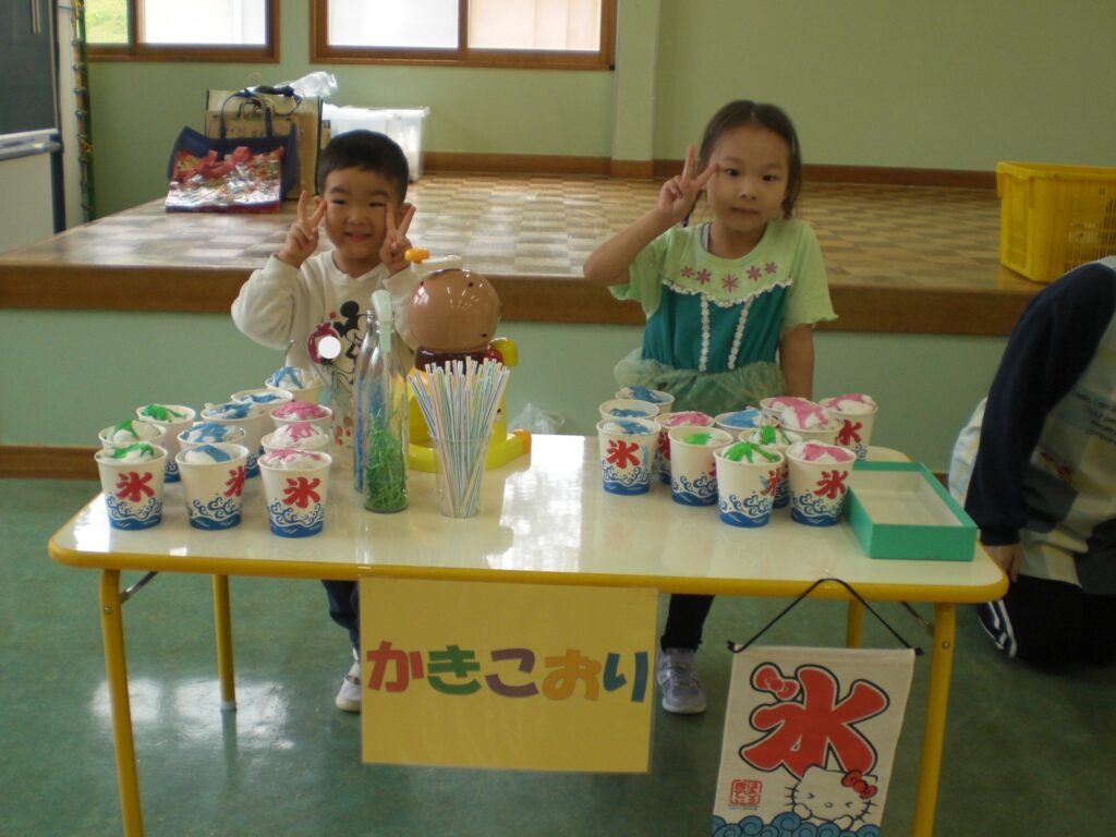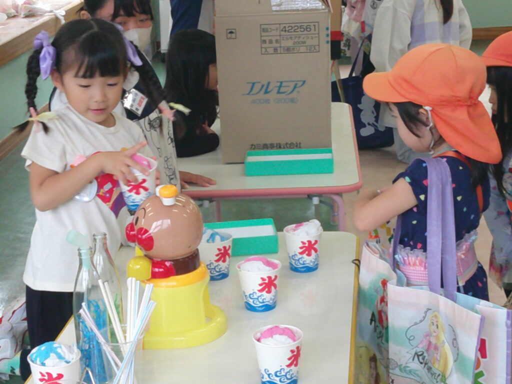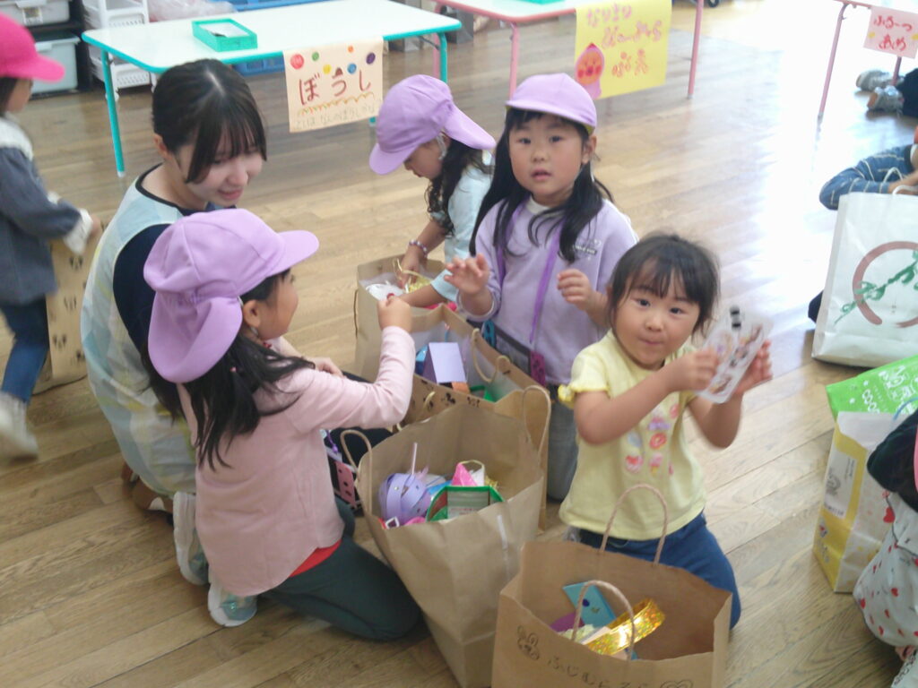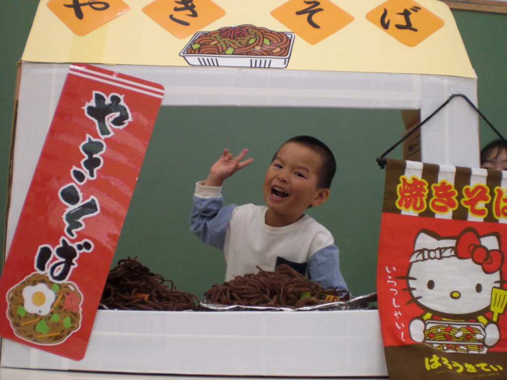 お遊戯室、きりん組、うさぎ組の3部屋には、縦割りグループで作った品物、お母さん達から寄せられたたくさんの手作り品が並んで、子ども他達はとても嬉しそうでした。自分で作ったお財布に入っているお金10枚で、持ってきた袋いっぱいのお買い物をしていました。売り手のお友達は「いらっしゃい、いらっしゃい!」「焼きそば美味しいよ!」「ヨーヨーつりしませんか?」とお手伝いに来てくれた短大の学生さんと一緒に大きな声を出していました。ラーメンや焼きそばを作ったり、たこ焼きを詰めたり、金魚すくいをしたり…、お店の仕事をがんばりました。買った品物は今日持ち帰りましたので、お家でも楽しんでください。今日のこども祭りでは、本物のぶどうジュースが出ました。