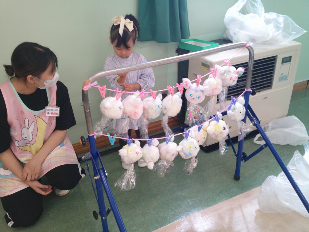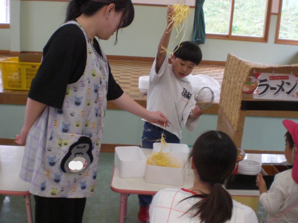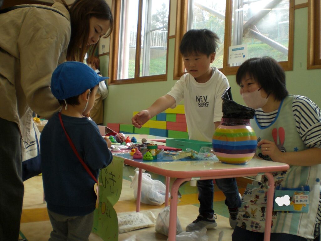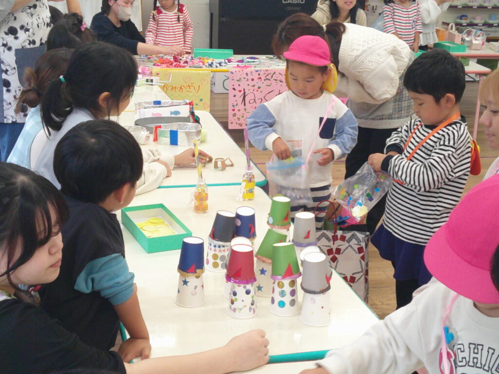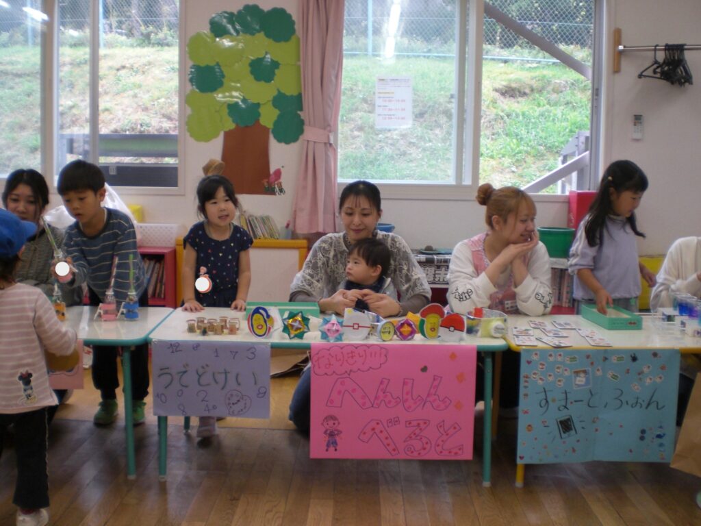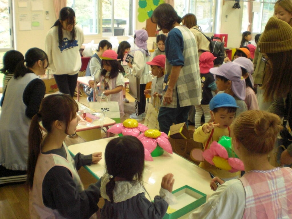 お遊戯室、きりん組、うさぎ組の3部屋には、縦割りグループで作った品物、お母さん達から寄せられたたくさんの手作り品が並んで、子ども他達はとても嬉しそうでした。自分で作ったお財布に入っているお金10枚で、持ってきた袋いっぱいのお買い物をしていました。売り手のお友達は「いらっしゃい、いらっしゃい!」「焼きそば美味しいよ!」「ヨーヨーつりしませんか?」とお手伝いに来てくれた短大の学生さんと一緒に大きな声を出していました。ラーメンや焼きそばを作ったり、たこ焼きを詰めたり、金魚すくいをしたり…、お店の仕事をがんばりました。買った品物は今日持ち帰りましたので、お家でも楽しんでください。今日のこども祭りでは、本物のぶどうジュースが出ました。