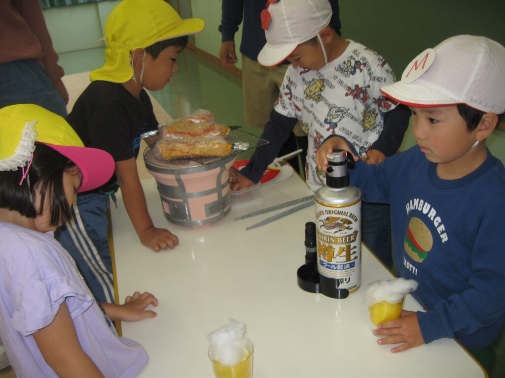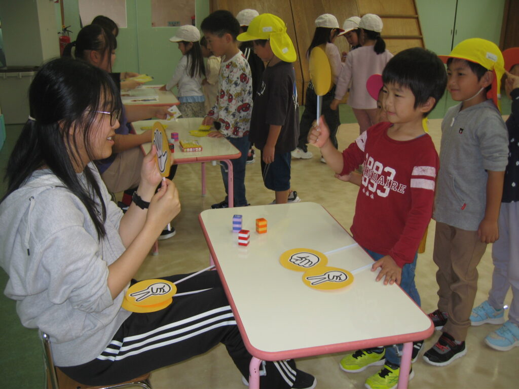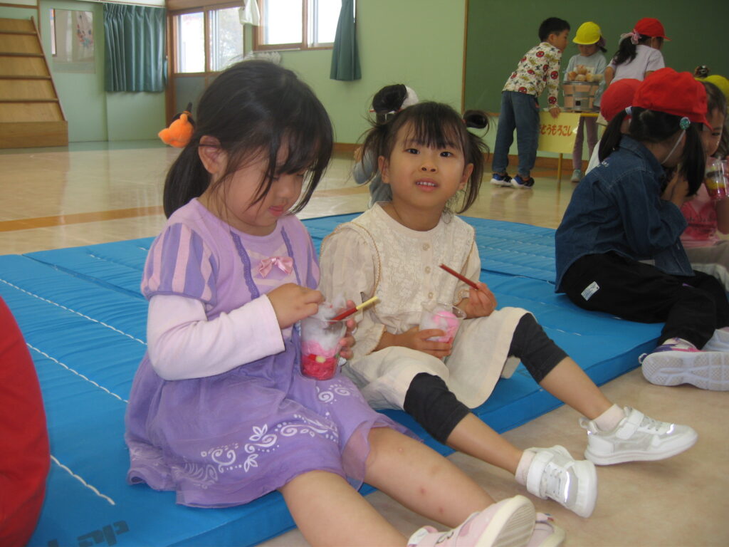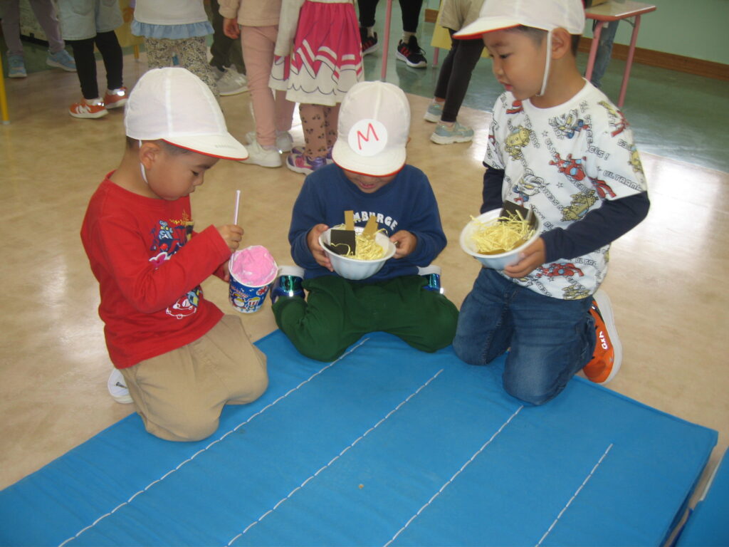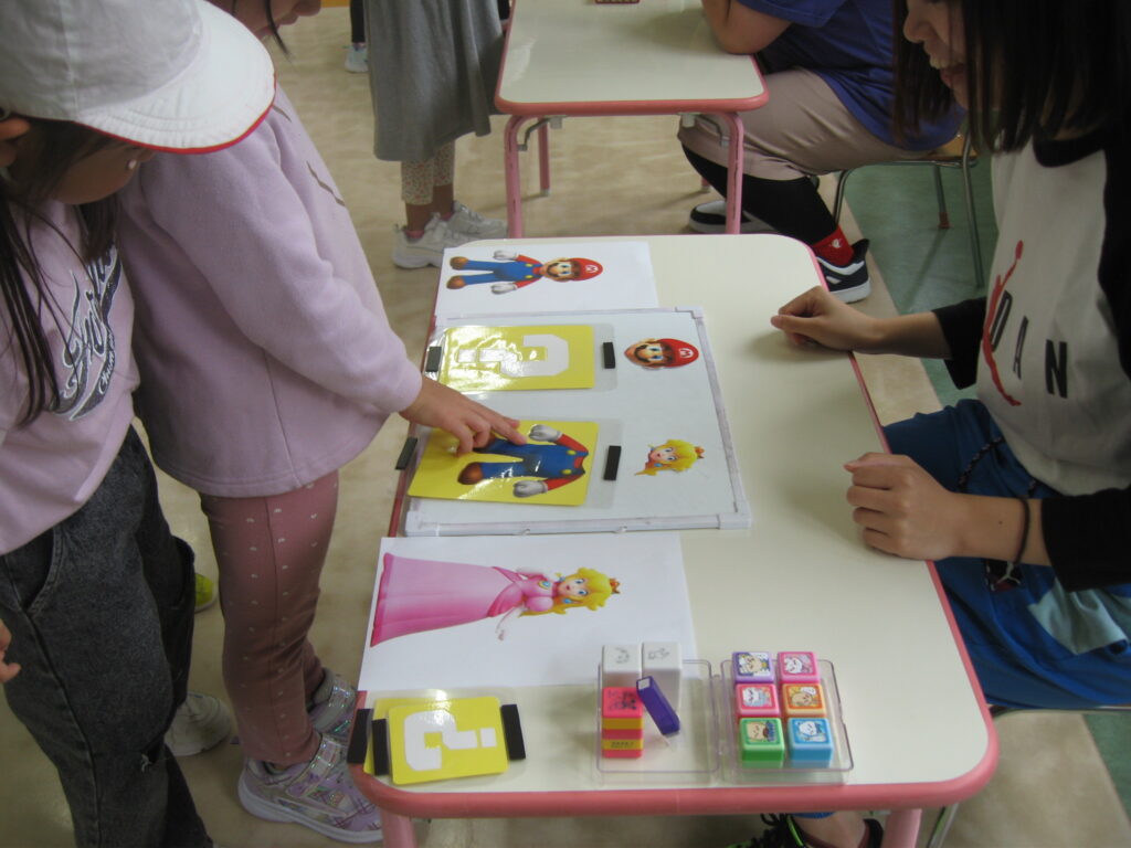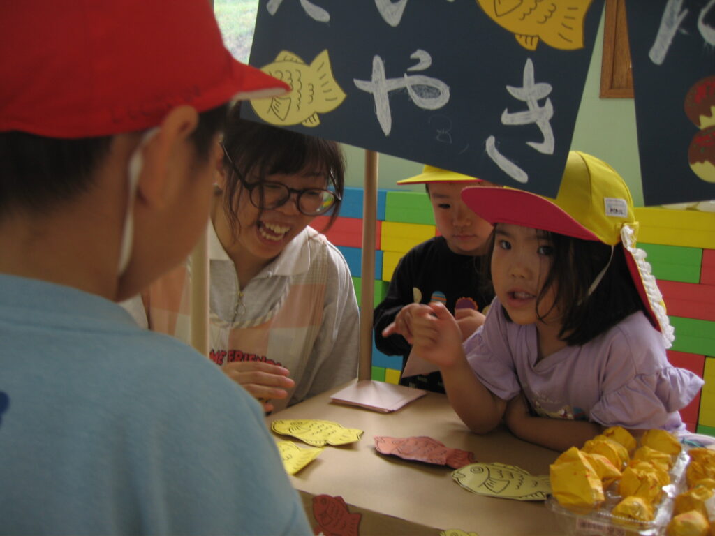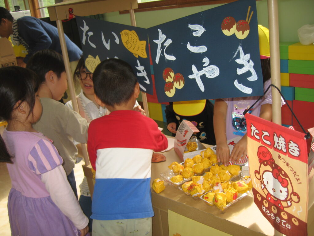 昨日ふぞくこども祭りを楽しんだ子ども達は、今日の2日目は屋台やゲームを楽しみました。2日目は、1日目に体験できなかったことに挑戦して楽しむことが目的で、たこ焼き、たい焼き、ビール、焼きトウモロコシ、かき氷、クレープ…などの屋台で売り手や買い手になりました。昨日体験できなかったお店で売り手をしたり、買ったものをもぐもぐ食べたり楽しそうでしたよ。ゲームコーナーは「ジャンケンゲーム」「トランプでどちらが大きいか」「マリオとピーチ姫の絵合わせ」で先生と対決しました。勝ったり、負けたり楽しそうな子ども達でした。