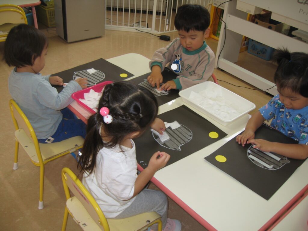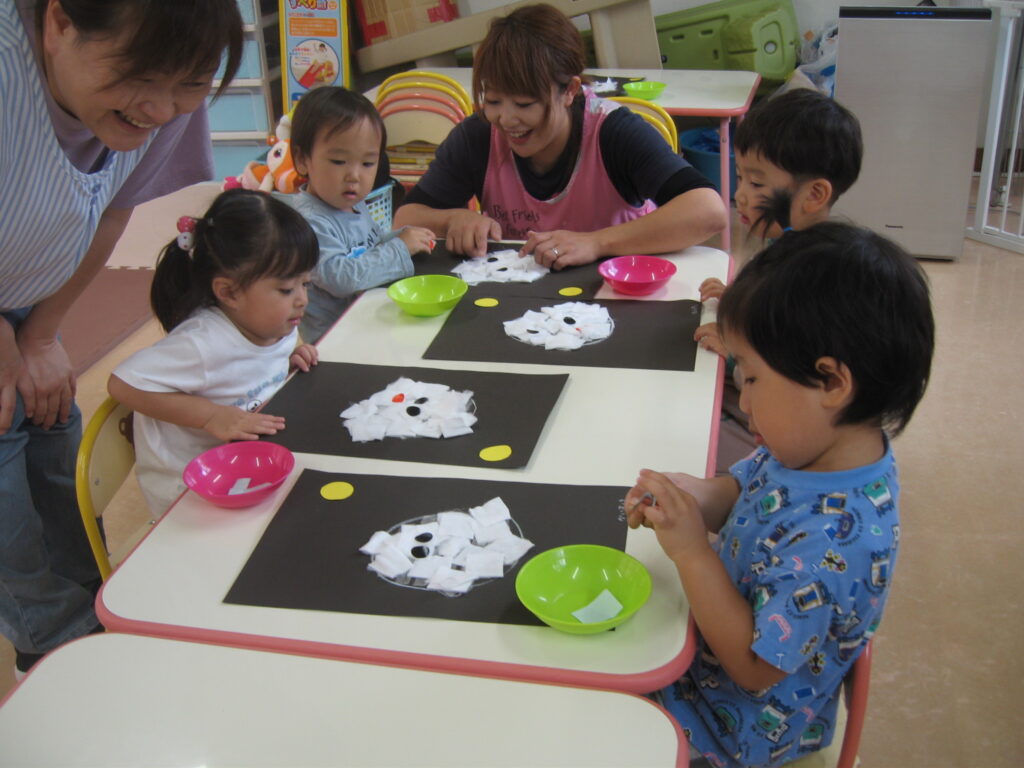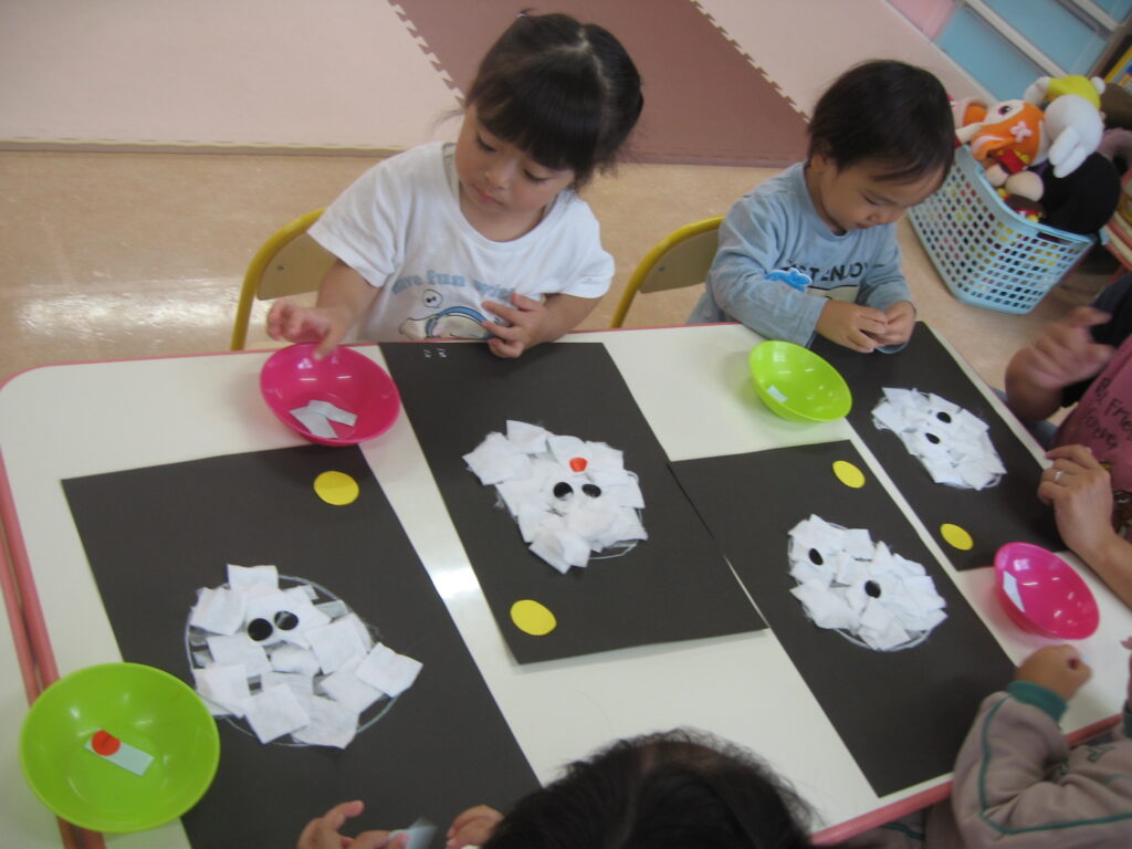 カンガルークラブさんは、お部屋で壁面飾りのオバケを作りました。両面テープをはがして、コットンを貼ってふわふわなオバケを作り、目や口を貼って完成!しました。カンガルークラブさんは、明日体験入園のお友達と一緒に2回目のお買い物ごっこを楽しみます!!(森)