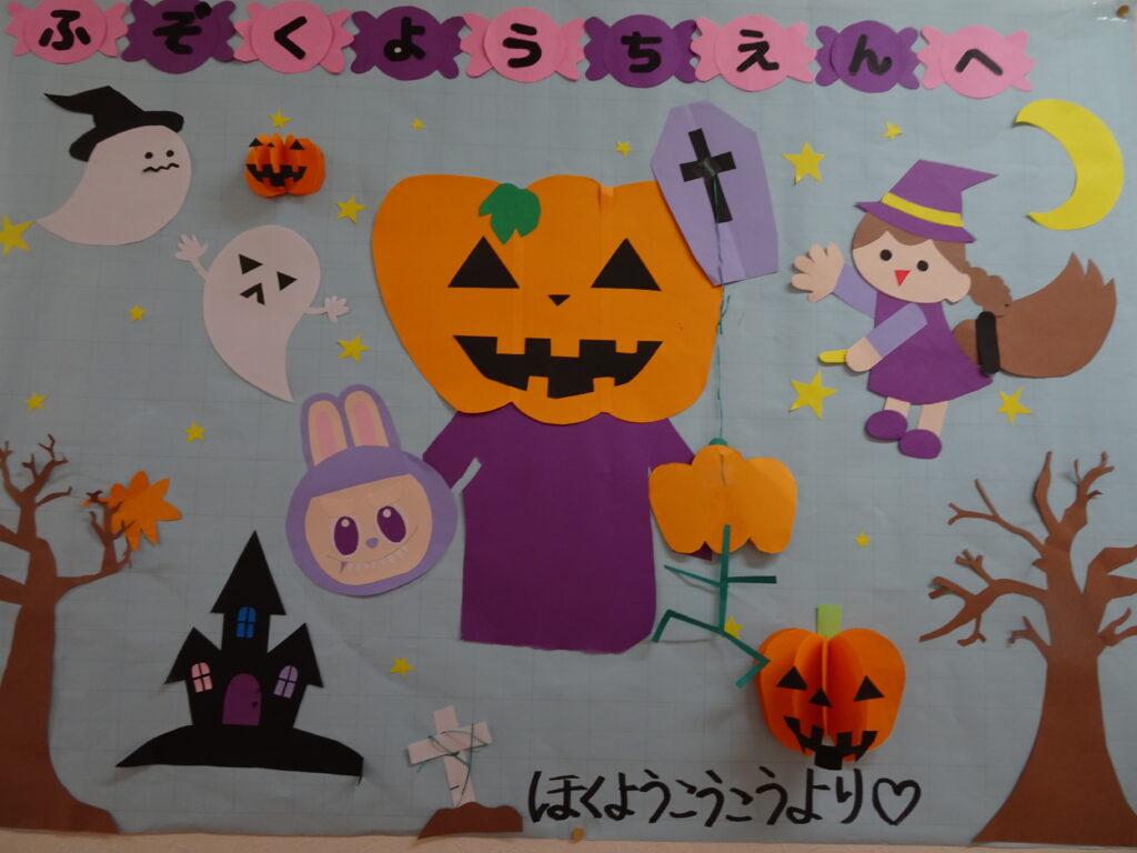 先日ふぞく幼稚園に遊びに来てくれた北陽高校のお兄さんお姉さんから、素敵なハロウィンの壁面飾りをいただきました。ありがとうございます!