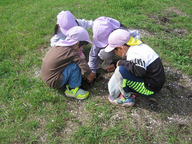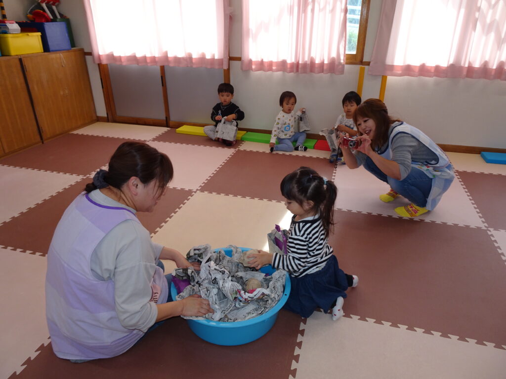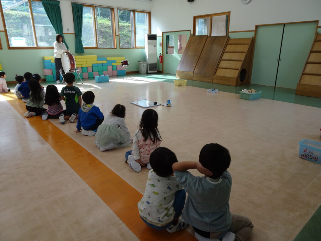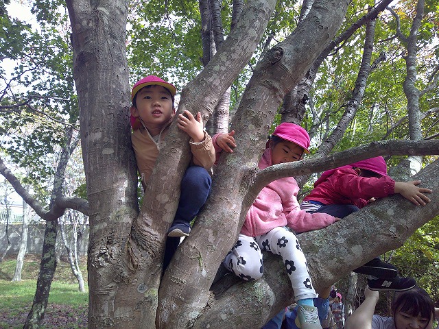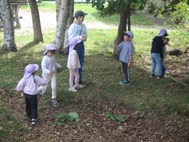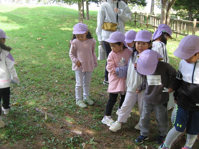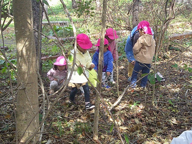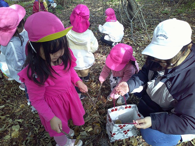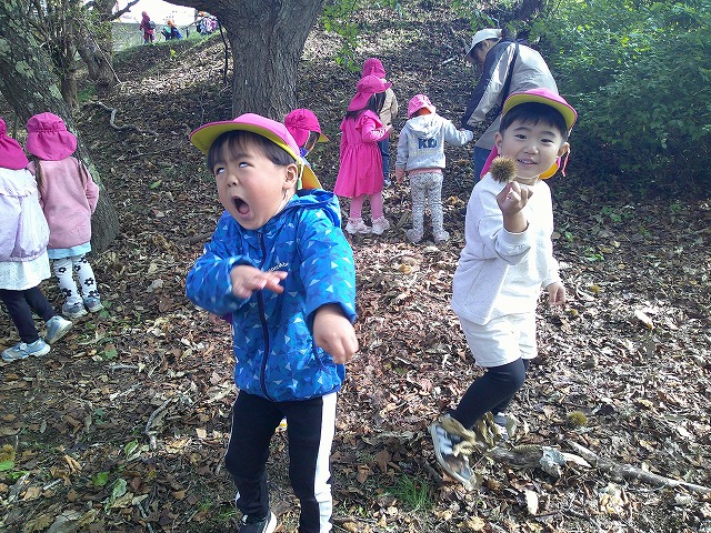 今日きりん組さんは、貝塚公園まで歩いていきました。秋の公園を楽しみました。ぱんだ組さんは、お遊戯の練習をしてから、楽器遊びをしました。好きな楽器を鳴らしたり、音楽に合わせたりしました。ぱんだ組さんは、お遊戯会に向けて話し合いながら進めます。うさぎ組さんは、バスで茅野公園に出掛けました。今年はどこに行ってもドングリが拾えません。茅野公園では、栗を拾って来ました。カンガルークラブさんは、お部屋で果物狩りや芋堀りをしました。明日は焼き芋の予定です!晴れたらいいな…。(森)