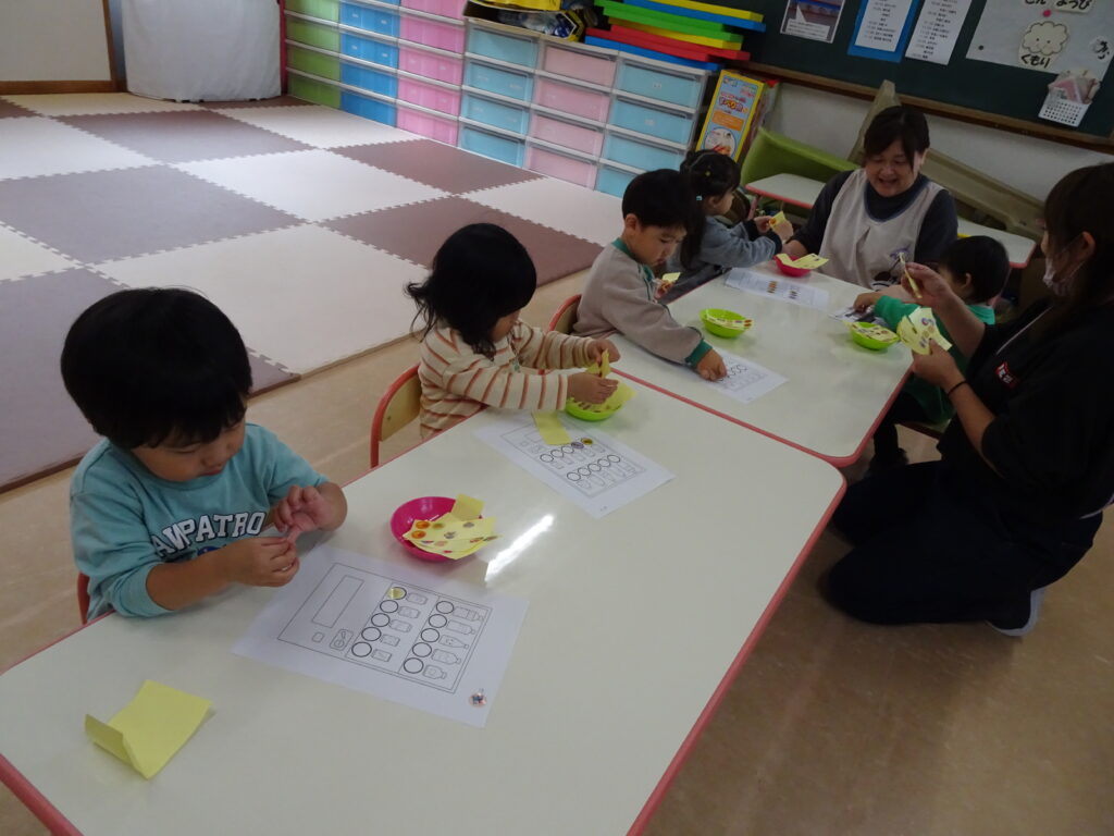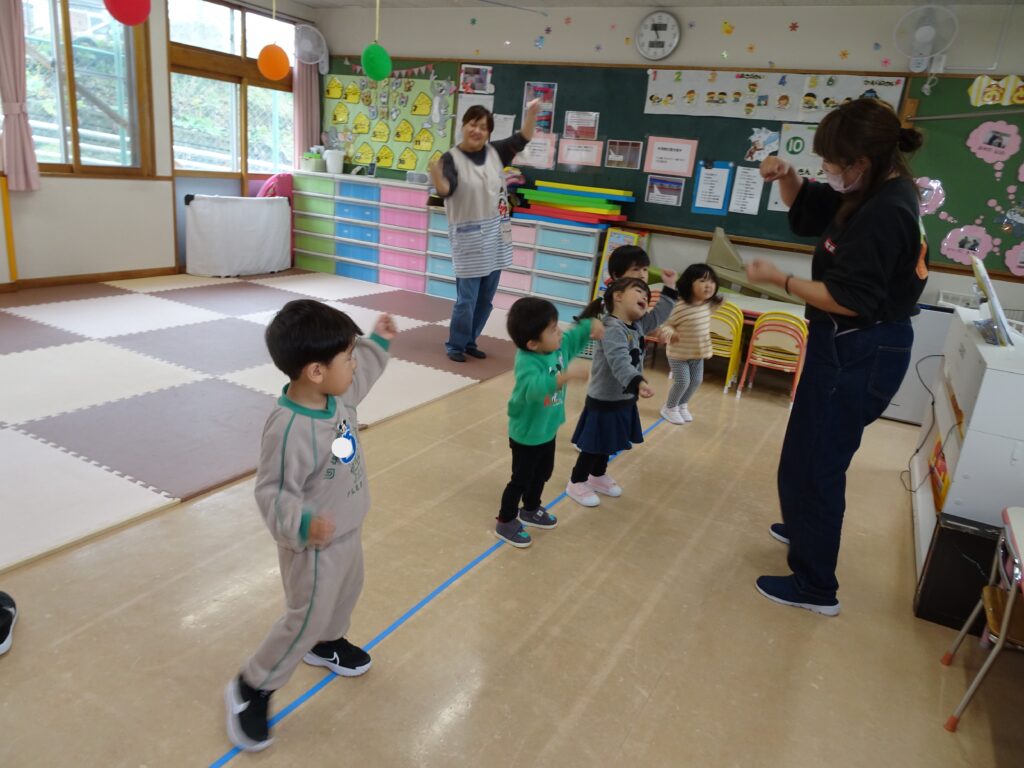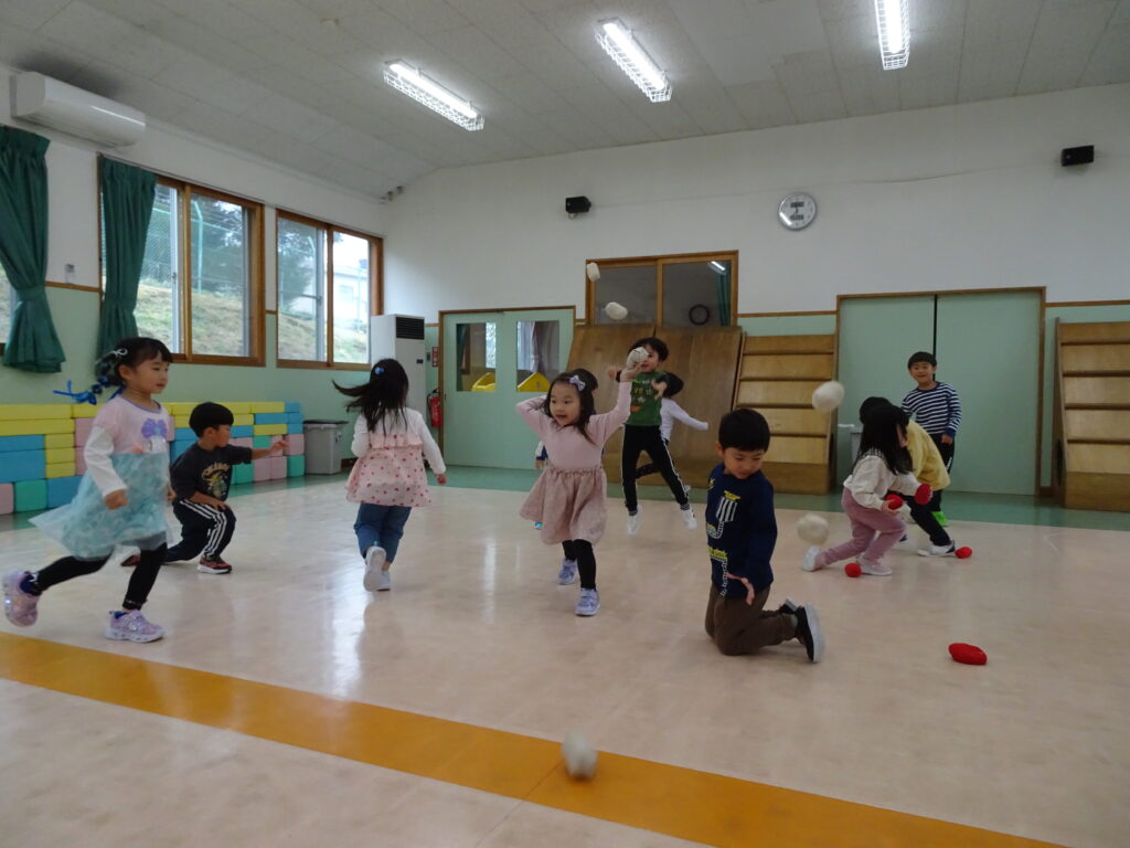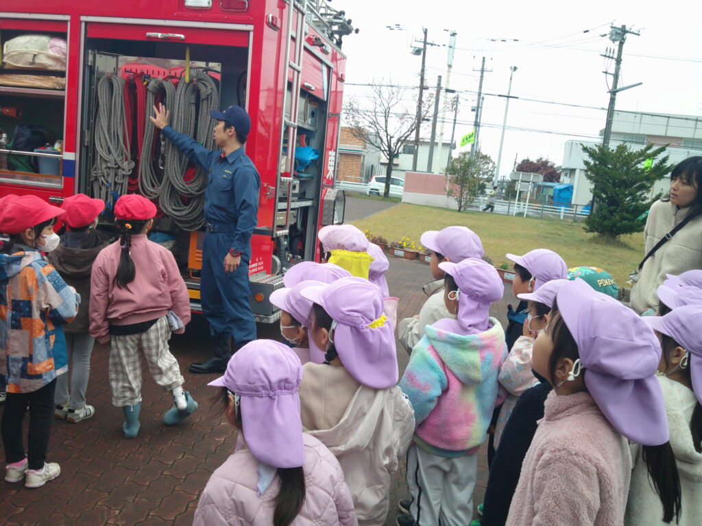 きりん組さんは清明小学校に行って「防災教室」に参加してきました。1年生と一緒に「煙体験」「消防車見学」をしました。先週避難訓練で歩いた清明小学校で、また新しい体験をすることができました。ぱんだ組さんはお遊戯の練習をしてから紅白の玉を使って「なんちゃってボッチャ(障害のある人もない人も出来るスポーツ)」など紅白玉を使った集団遊びをしました。カンガルークラブさんはシール遊びを楽しみました。小さいお友達もペタペタ上手に貼っていました。お遊戯会の練習も少しずつしているカンガルークラブさんです。