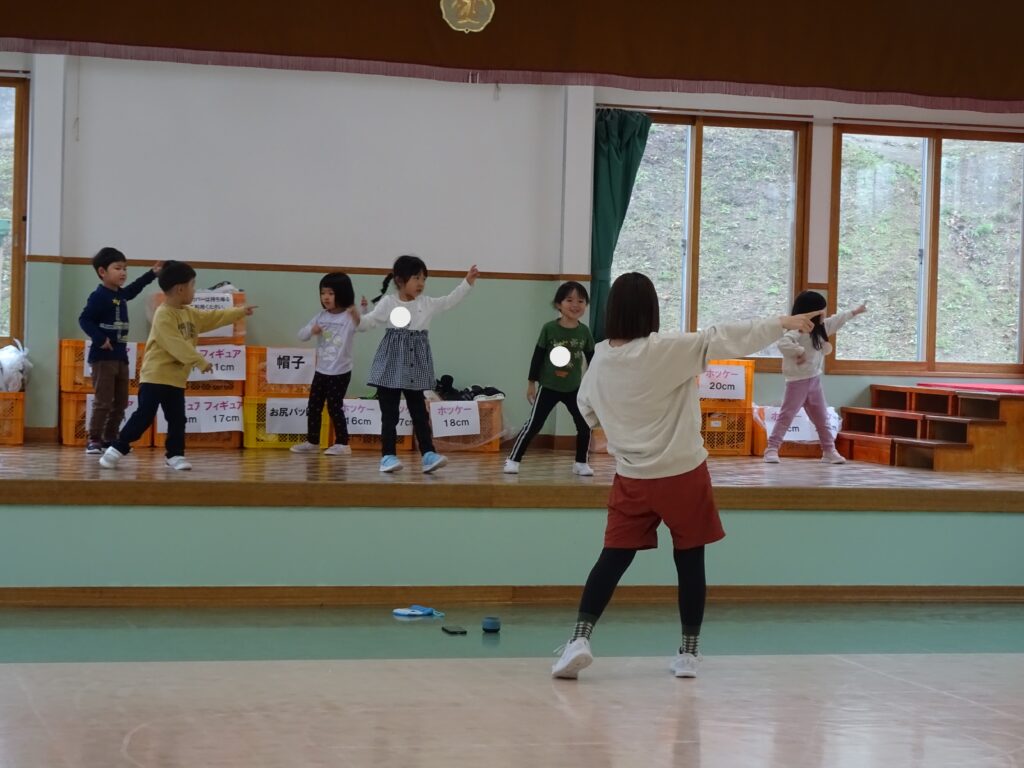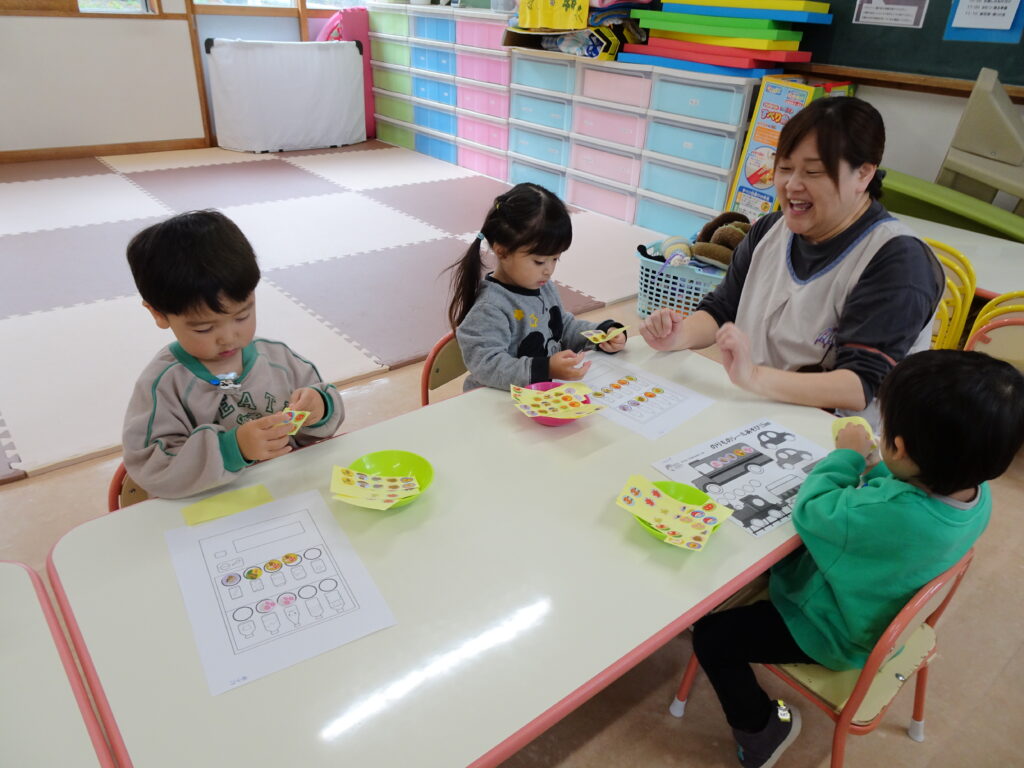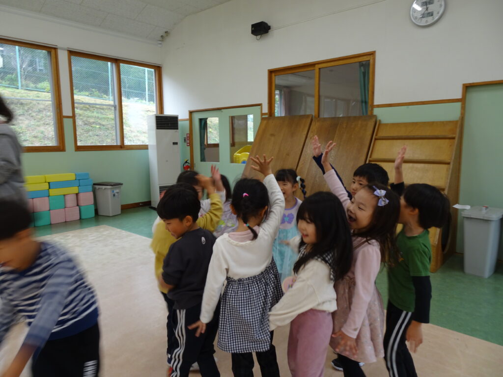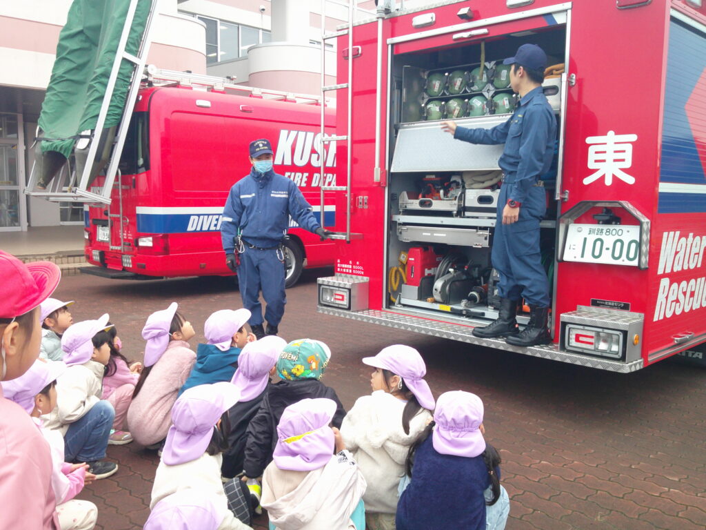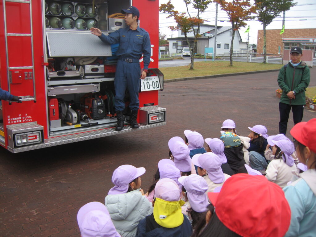 きりん組さんは清明小学校に行って「防災教室」に参加してきました。1年生と一緒に「煙体験」「消防車見学」をしました。先週避難訓練で歩いた清明小学校で、また新しい体験をすることができました。ぱんだ組さんはお遊戯の練習をしてから紅白の玉を使って「なんちゃってボッチャ(障害のある人もない人も出来るスポーツ)」など紅白玉を使った集団遊びをしました。カンガルークラブさんはシール遊びを楽しみました。小さいお友達もペタペタ上手に貼っていました。お遊戯会の練習も少しずつしているカンガルークラブさんです。