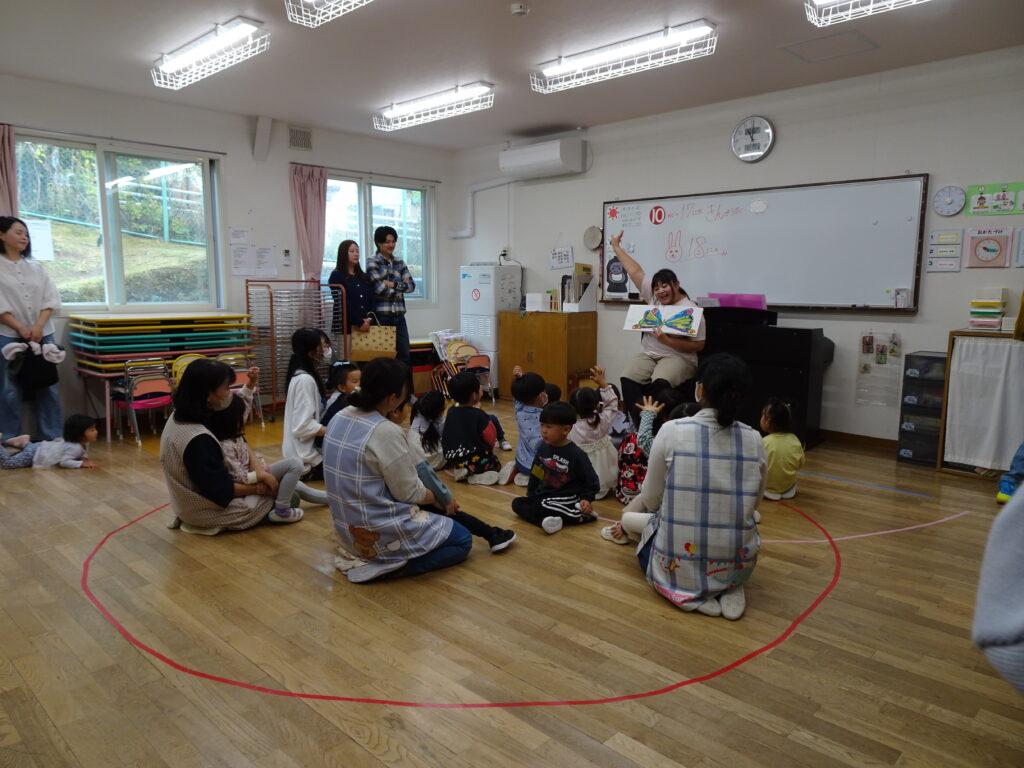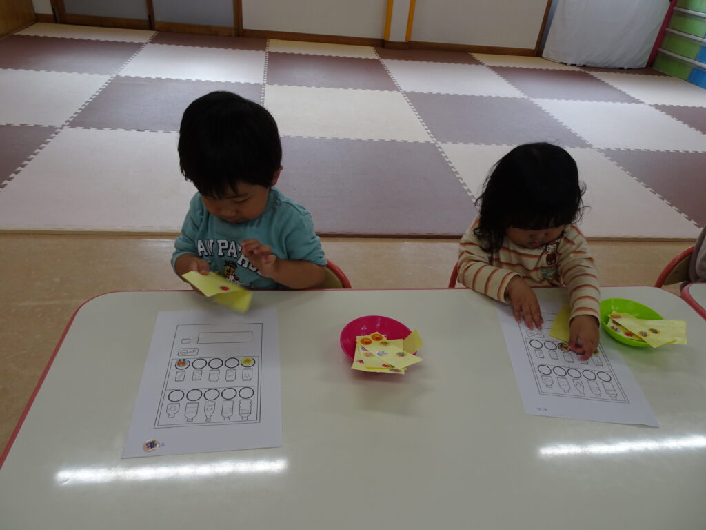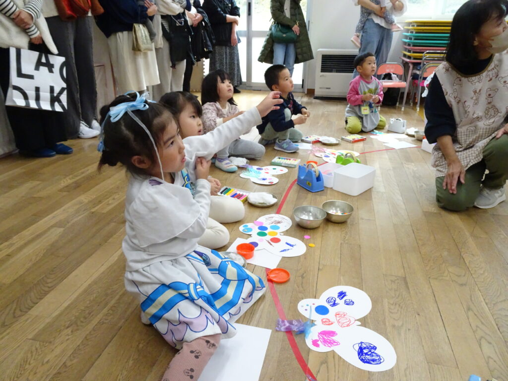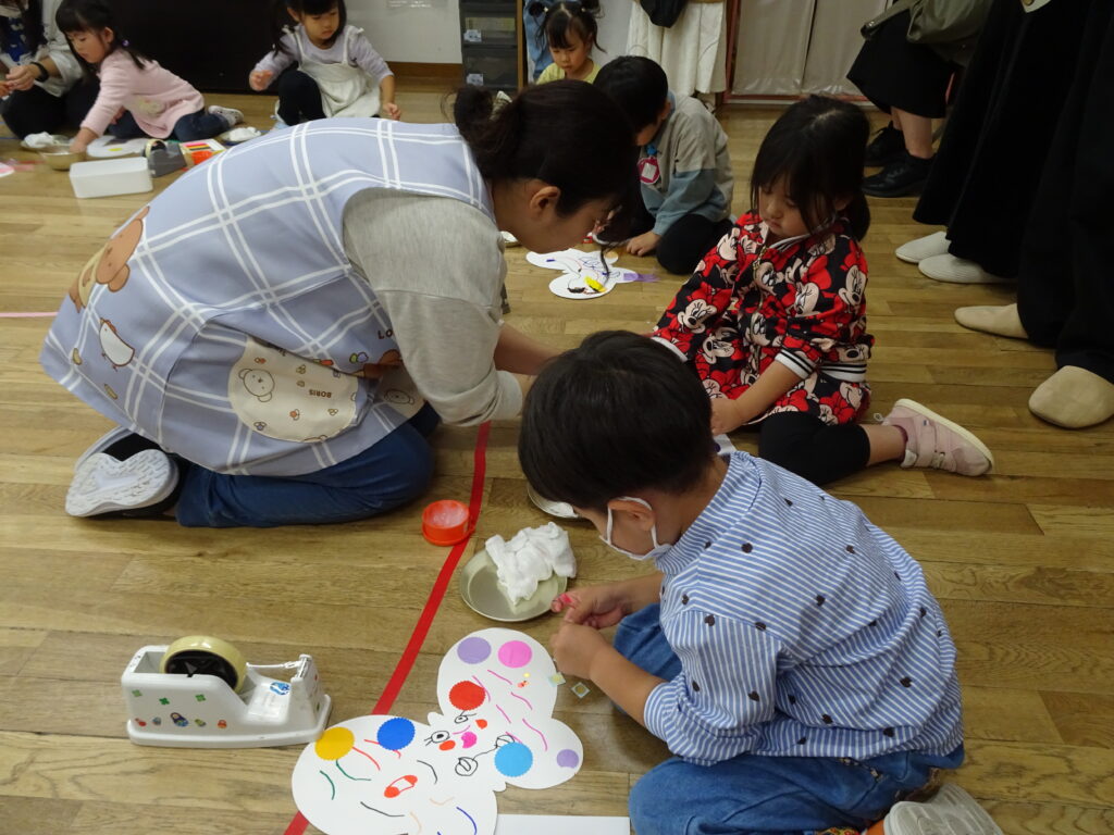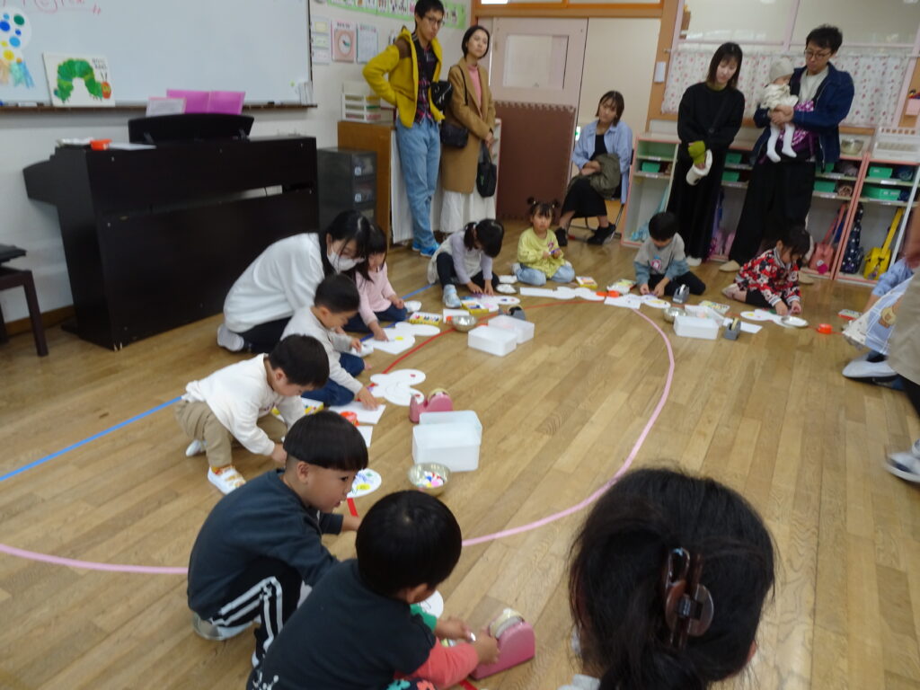 今日は年少組の保育参観が行われました。お遊戯会の出し物の「はらぺこあおむし」の読み聞かせを聞いてからお遊戯会で使う「ちょうちょ」に色紙、シール、スズランテープなどで飾りつけをしました。今日は素材が多くて床で作業しましたが、ノリやテープで上手に製作をしたうさぎ組さんでした。お母さんを見てちょっぴり涙の出た子もいましたが、満三歳児さんもとてもよくがんばっていました!今日で3日間の保育参観が終了しました。たくさんの保護者の方にご来園いただき心より感謝申し上げます。