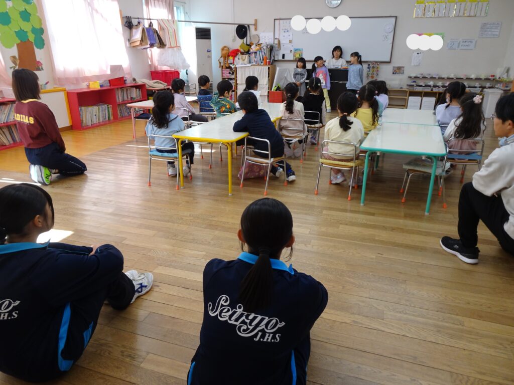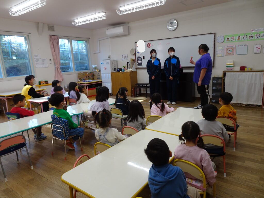 今日は寒い朝でしたね。園庭の花壇の花もすっかりダメになってしまいました。でも子ども達は元気に外遊びも楽しんでいました。今日は職場体験で中学生5名のお姉さんが幼稚園に来てくれて、とっても喜んだ子ども達でした。ふぞく幼稚園を卒園した子も来ていて、とても嬉しかったです。