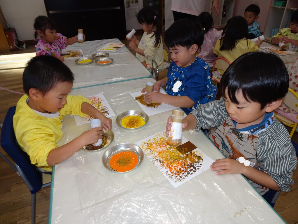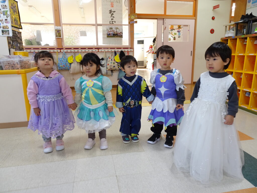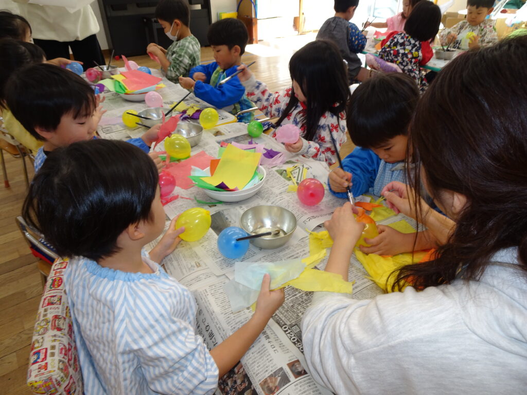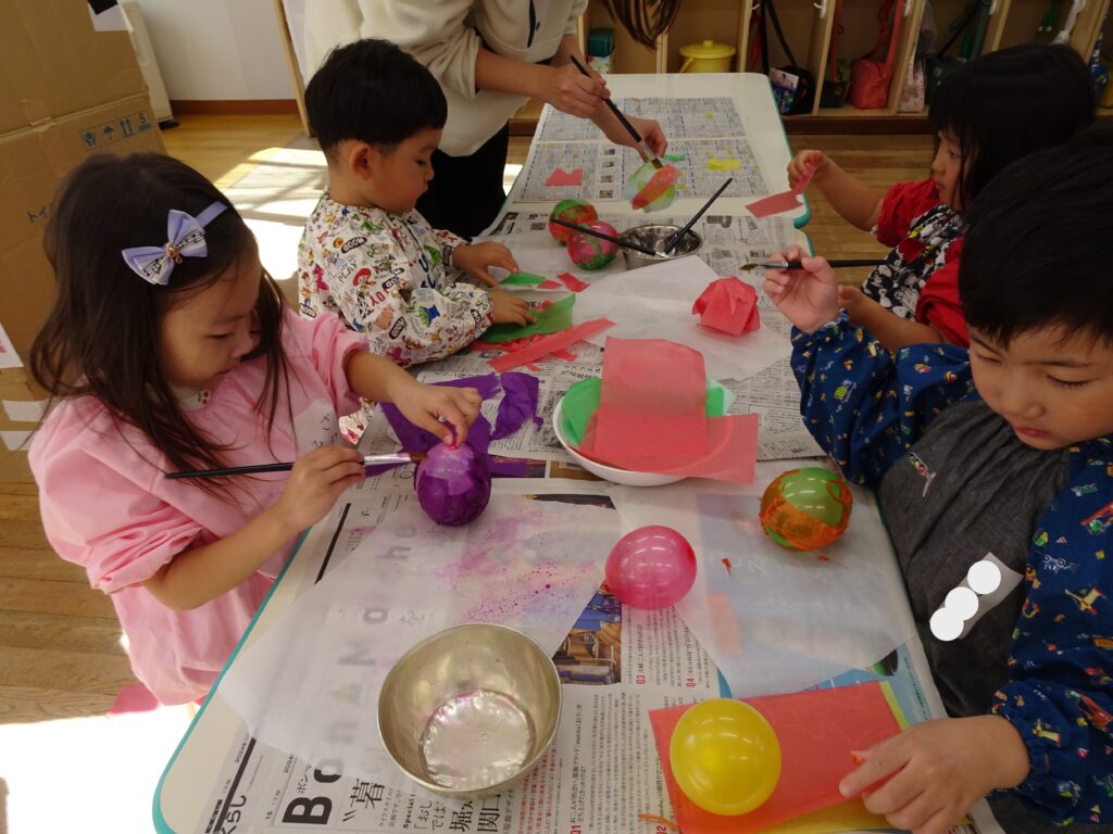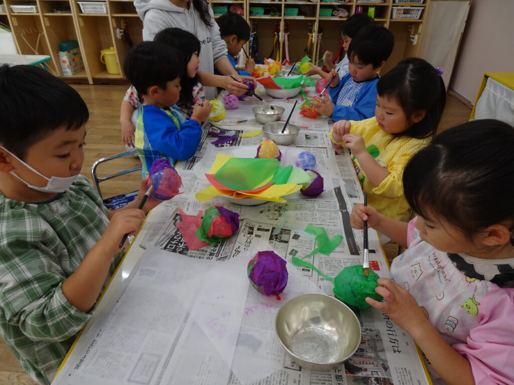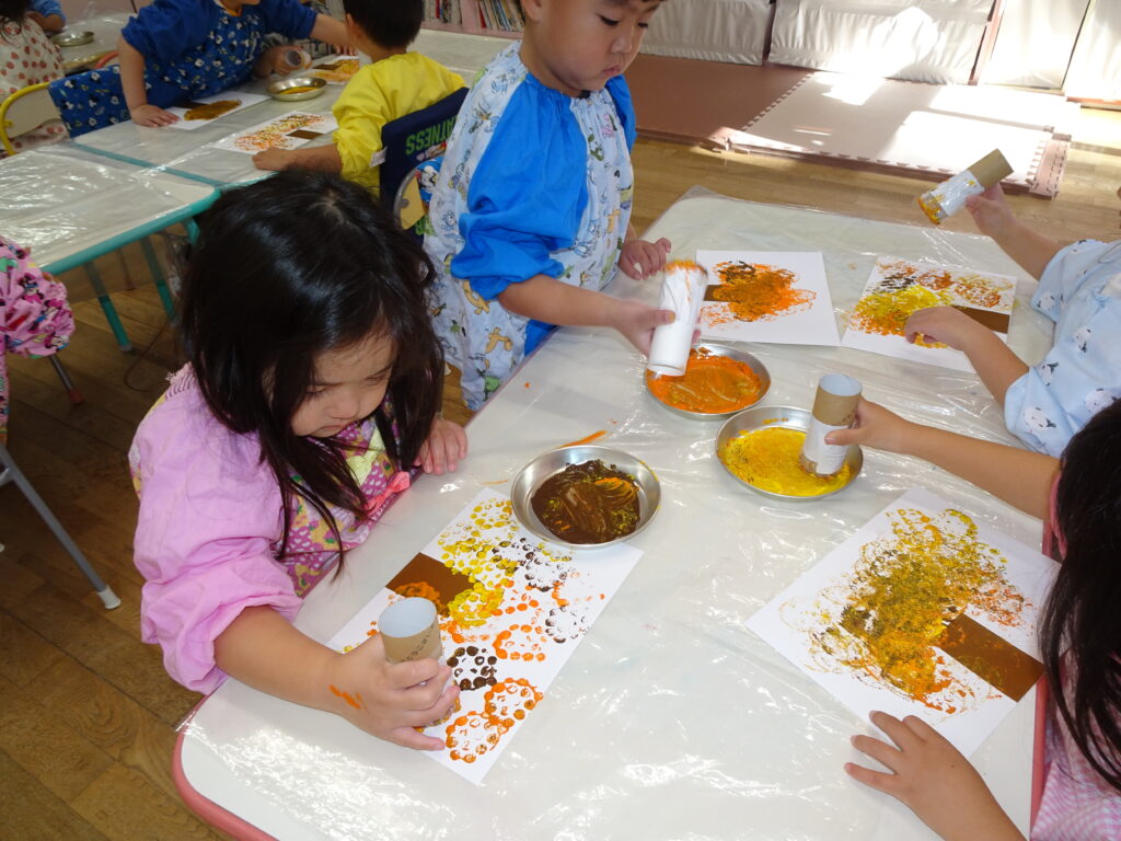 きりん組さんは出し物の劇の練習をしました。台本を見ながらですが最後まで通して練習していました。ナレーターの子も先生に助けてもらいながらお話を進めていました。練習が終わったら「アメリカンドッジがしたい!!」とお遊戯室で楽しんでいました。ぱんだ組さんはハロウインの飾りに、風船に糊でお花紙を貼ってカラフルな「風船ピニャータ」を作りました。何になるのか楽しみですね。(お休みしていたお友達が登園してきて、皆で参観日に作った街を見て話し合い、自分の作品は持ち帰りました。)うさぎ組さんは、3チームに分かれてお遊戯の練習をしました。どの曲も年少さんらしくてとても可愛らしいので、お楽しみに!!練習の後には「紅葉製作」でスタンプをペタペタ楽しみました。カンガルークラブさんは朝の自由遊びで衣装を着て「ハロウインの仮装!?」をしていました。お楽しみでは、カンガルーさんのお砂場で遊びました。日差しが暖かくて、楽しく砂遊びができました。