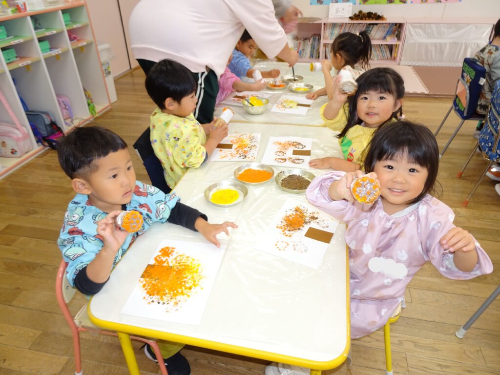 きりん組さんは出し物の劇の練習をしました。台本を見ながらですが最後まで通して練習していました。ナレーターの子も先生に助けてもらいながらお話を進めていました。練習が終わったら「アメリカンドッジがしたい!!」とお遊戯室で楽しんでいました。ぱんだ組さんはハロウインの飾りに、風船に糊でお花紙を貼ってカラフルな「風船ピニャータ」を作りました。何になるのか楽しみですね。(お休みしていたお友達が登園してきて、皆で参観日に作った街を見て話し合い、自分の作品は持ち帰りました。)うさぎ組さんは、3チームに分かれてお遊戯の練習をしました。どの曲も年少さんらしくてとても可愛らしいので、お楽しみに!!練習の後には「紅葉製作」でスタンプをペタペタ楽しみました。カンガルークラブさんは朝の自由遊びで衣装を着て「ハロウインの仮装!?」をしていました。お楽しみでは、カンガルーさんのお砂場で遊びました。日差しが暖かくて、楽しく砂遊びができました。
