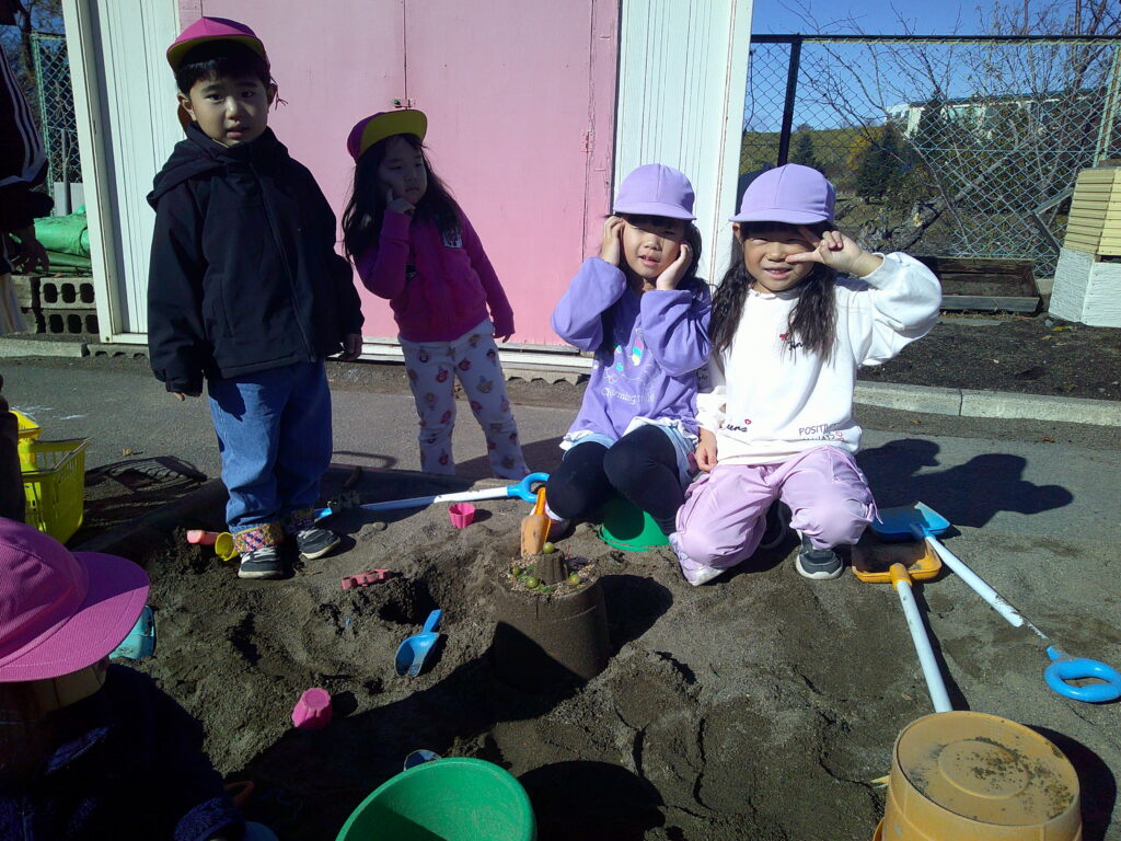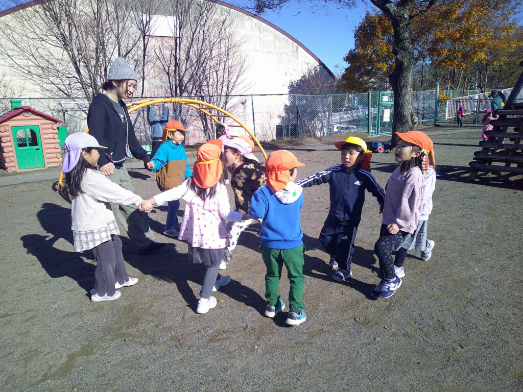 昨日は、風雨がすごかったですね。今朝の園庭は落ち葉だらけで、朝だけで手押し車3台分の落ち葉が集まりました。冷え込むと道路は大丈夫かしら…と心配でしたが、気温が高くて子ども達は朝の外遊びで、砂場遊び、花いちもんめなどを楽しんでいました。