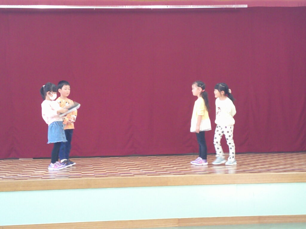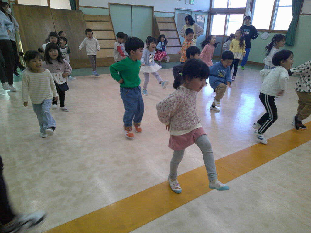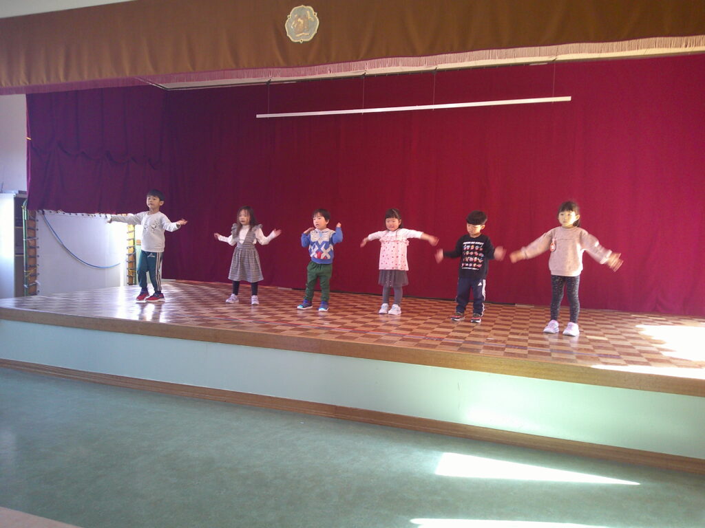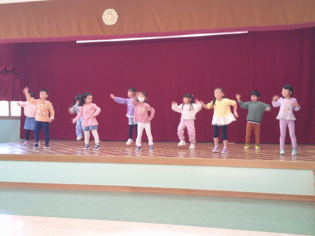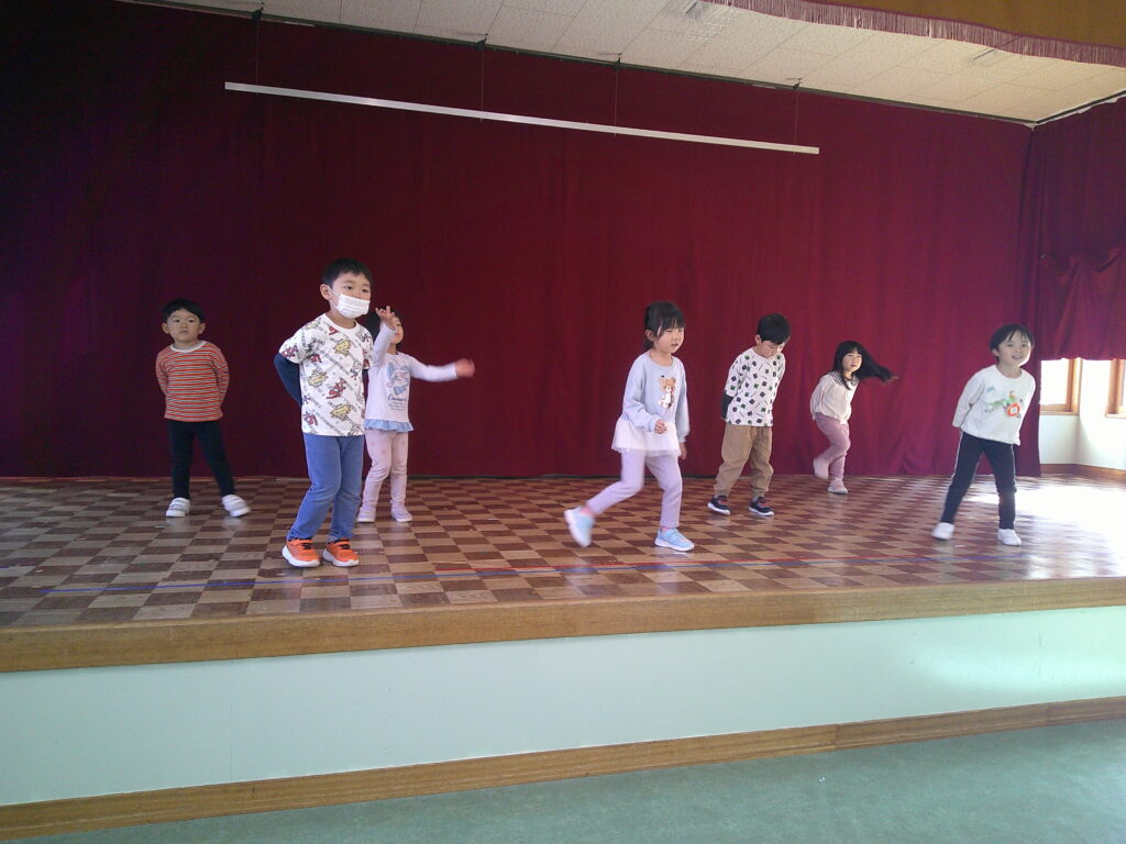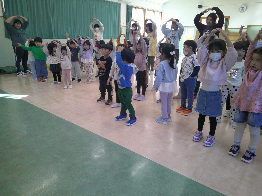 設定保育で、きりん組さんはお遊戯や劇の練習を頑張っていました。ぱんだ組さんはお遊戯の練習の後に「フープギリギリ鬼ごっこ」を楽しみました。うさぎ組さんは出し物の練習と「ヒーローグッズ作り」を頑張りました。カンガルークラブさんはドクターイエローや跳び箱を使ってお部屋で「サーキットごっこ」をしました。(森)