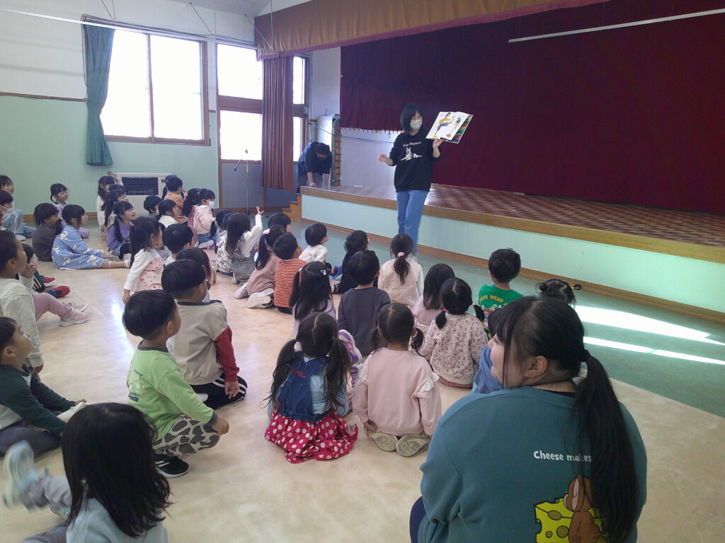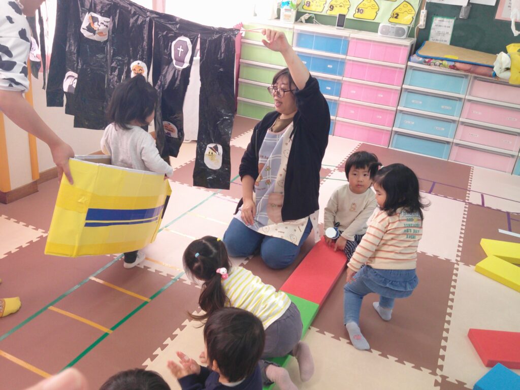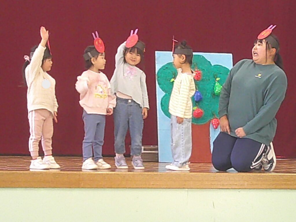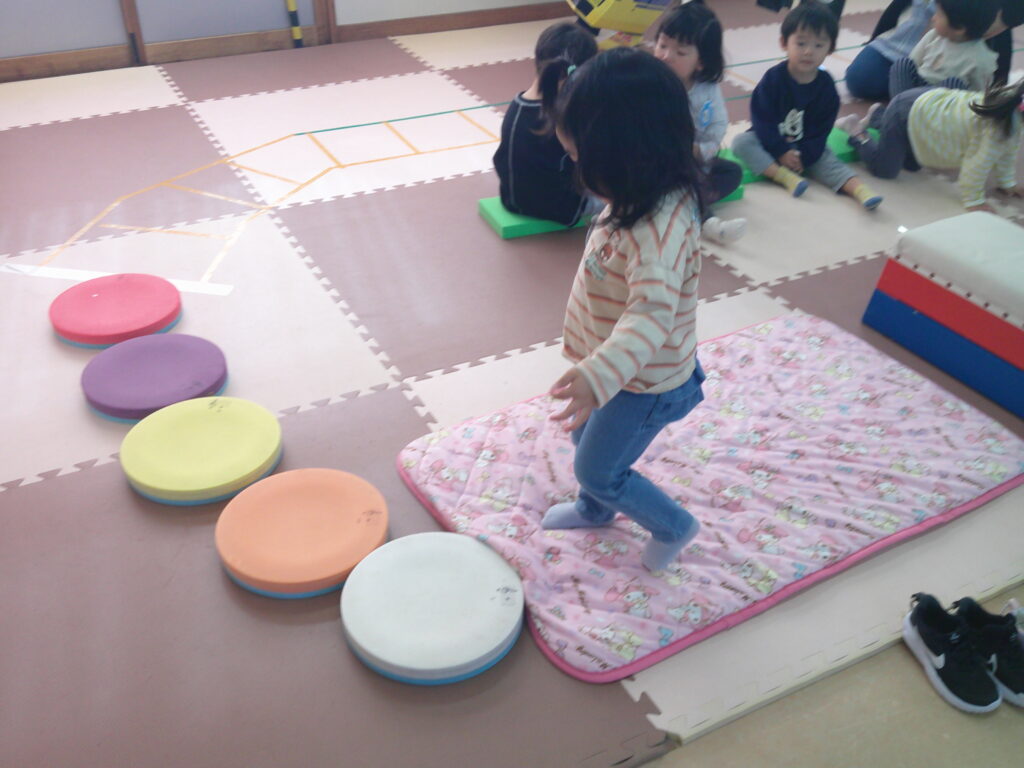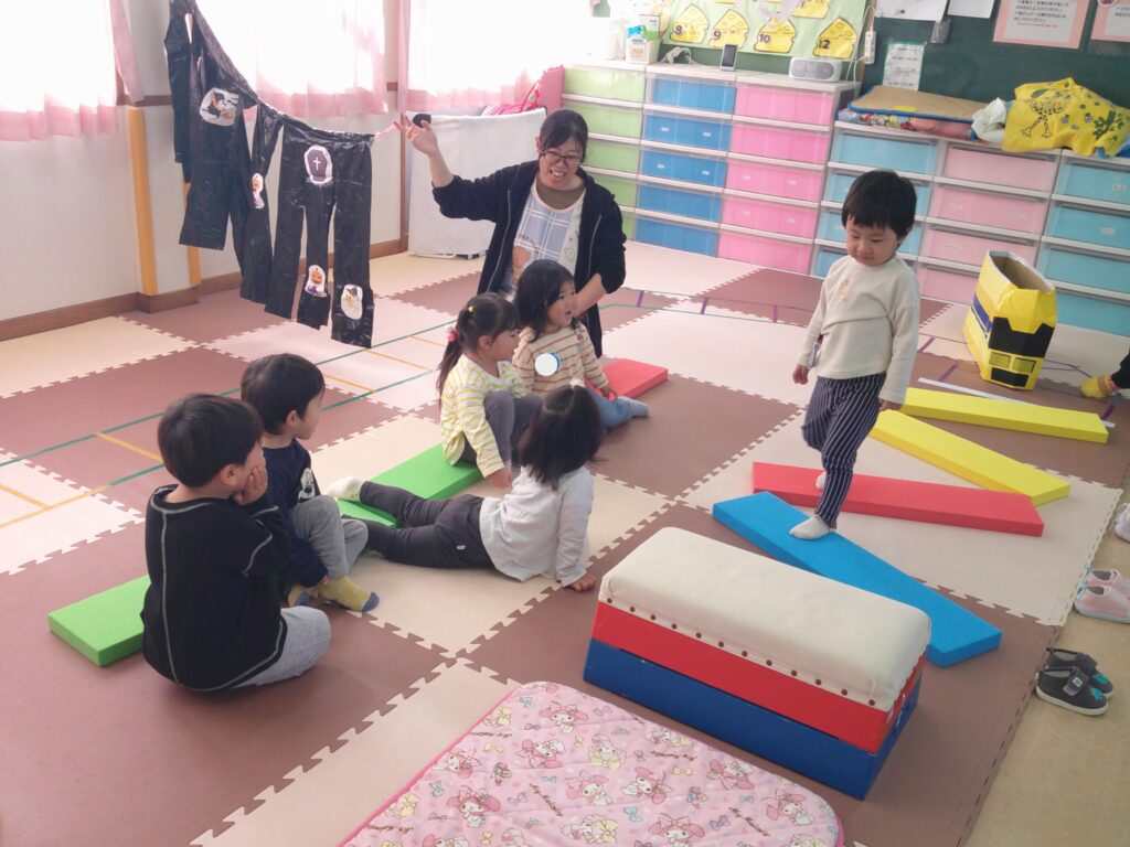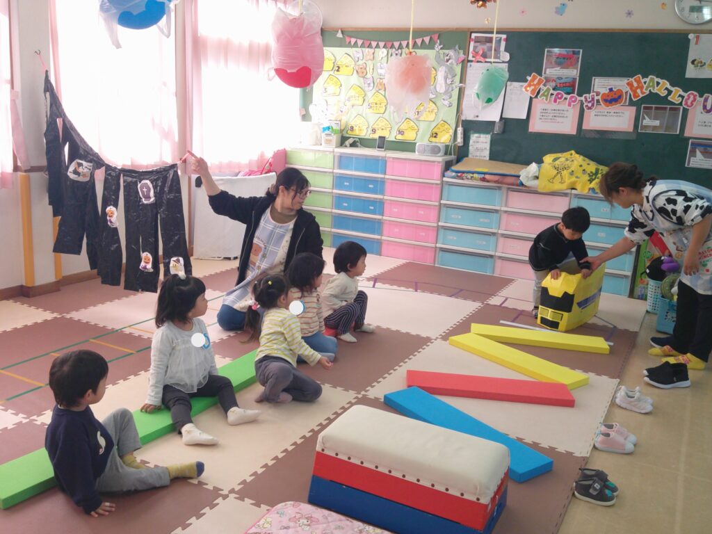 設定保育で、きりん組さんはお遊戯や劇の練習を頑張っていました。ぱんだ組さんはお遊戯の練習の後に「フープギリギリ鬼ごっこ」を楽しみました。うさぎ組さんは出し物の練習と「ヒーローグッズ作り」を頑張りました。カンガルークラブさんはドクターイエローや跳び箱を使ってお部屋で「サーキットごっこ」をしました。(森)