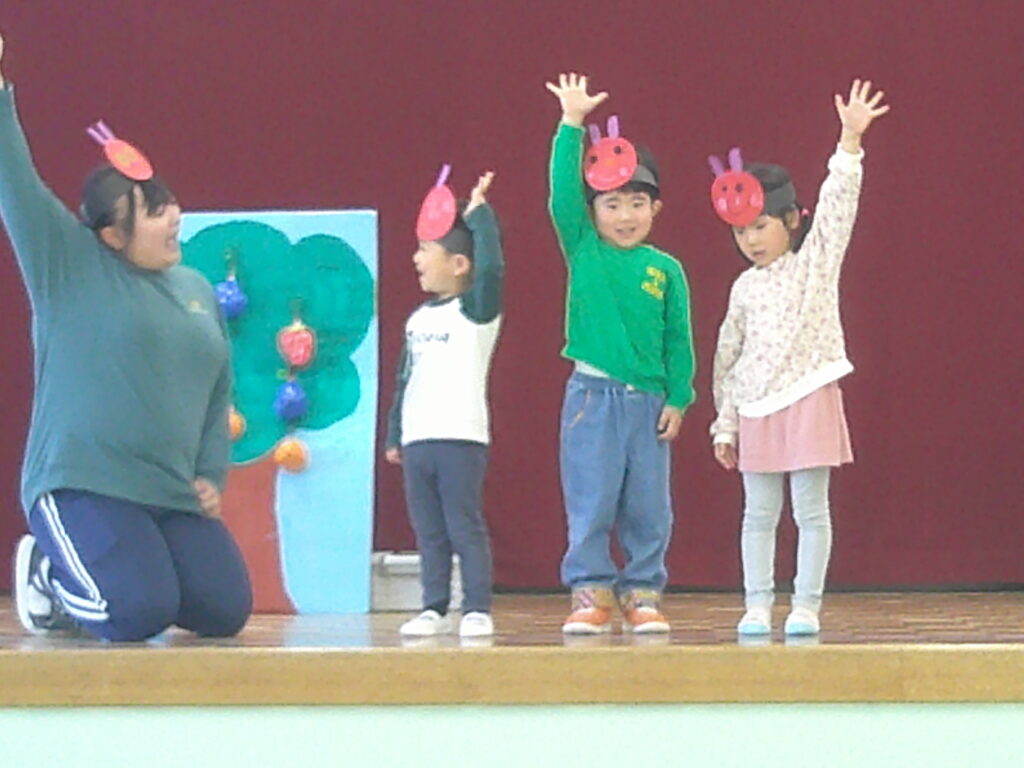 今日は合同保育で、エリックカールの「できるかな」のリズム遊びの後半、ゴリラ、ワニ、ラクダ、ネコ…などの真似をしました。
