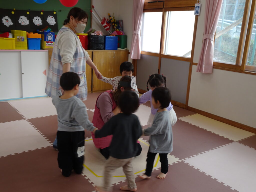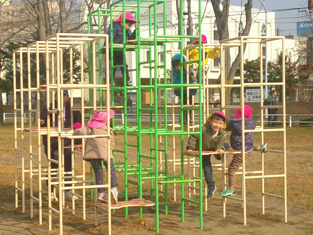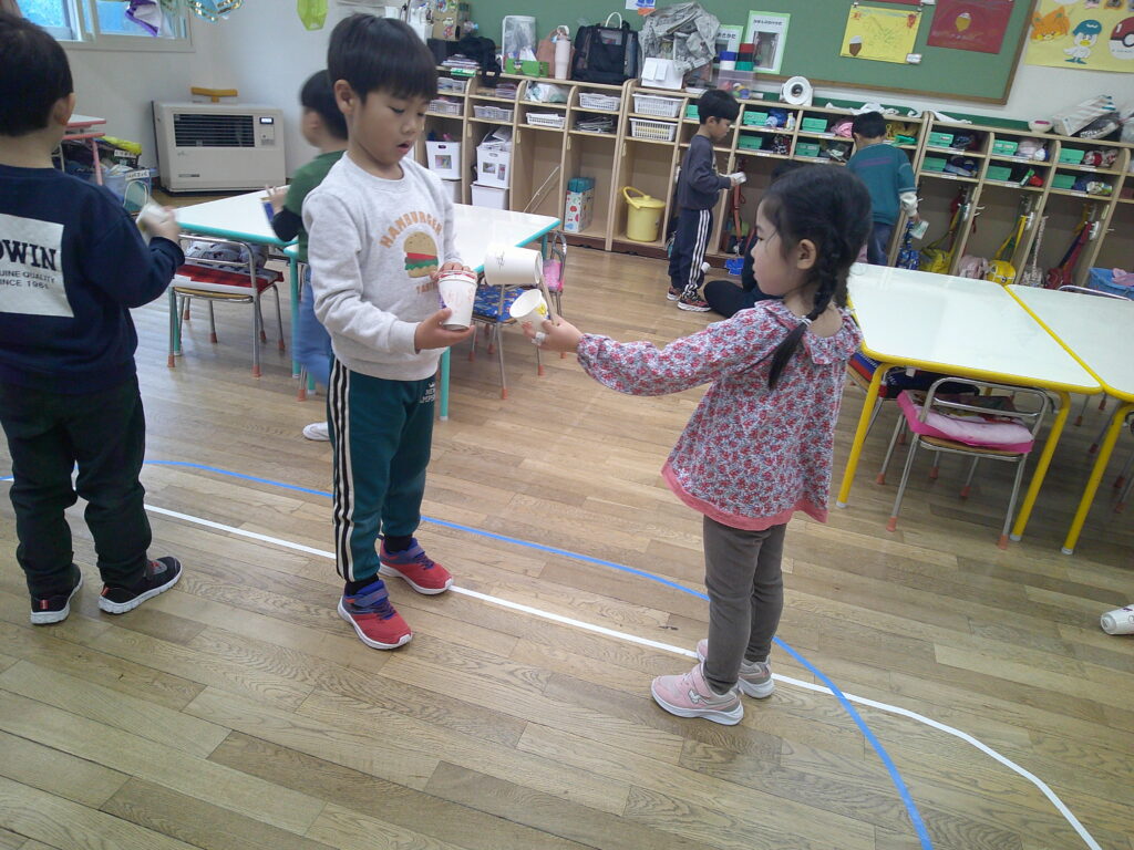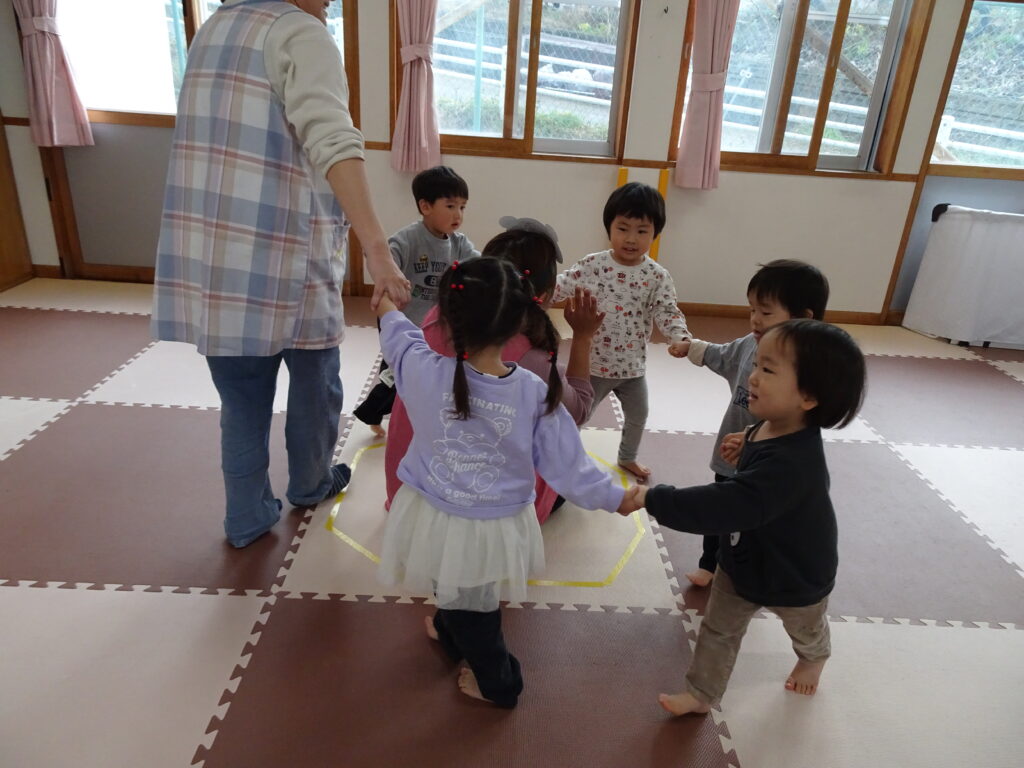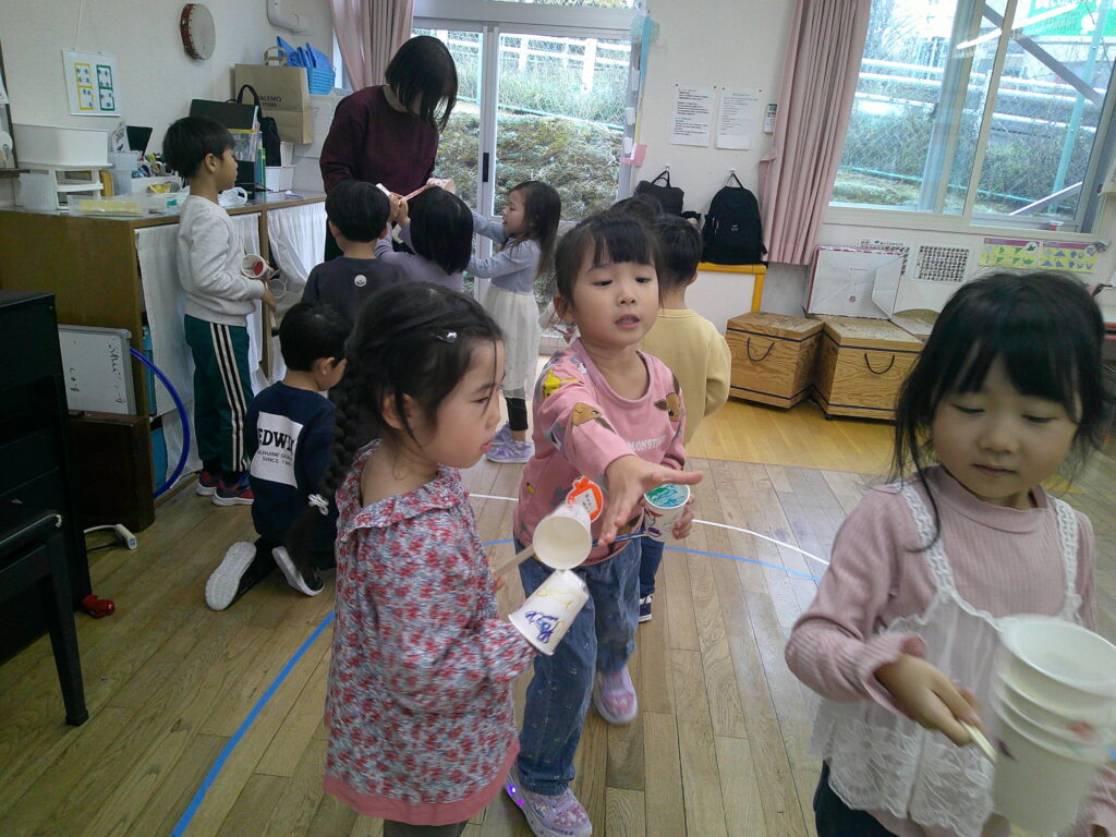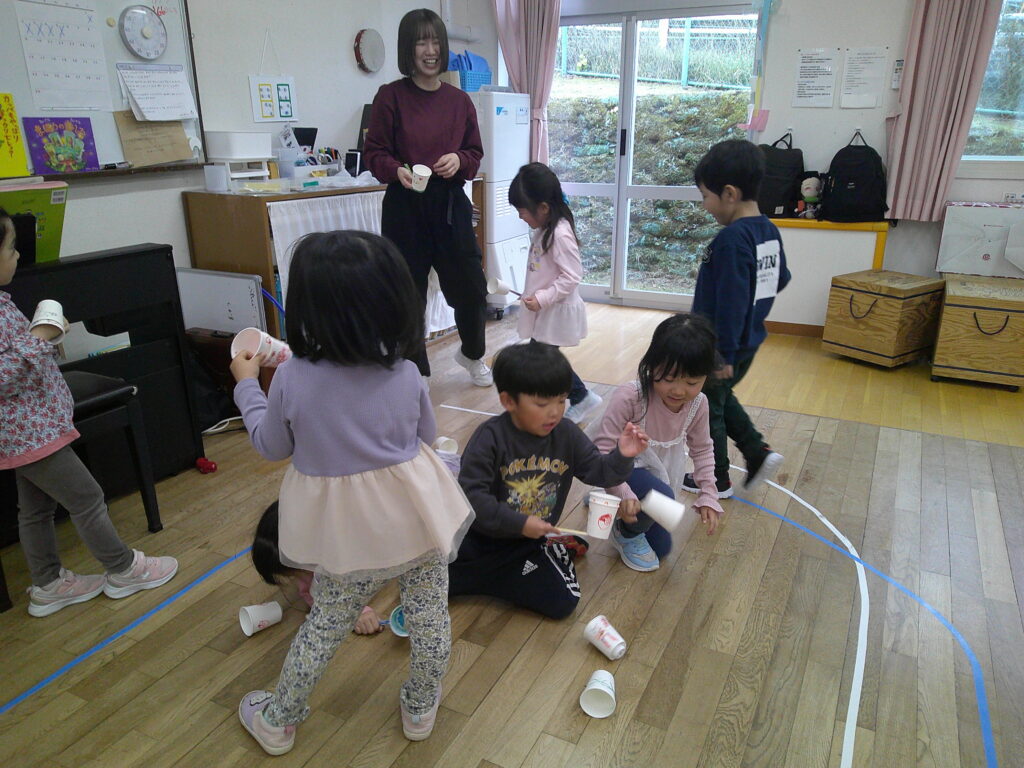 今日のきりん組さんは、お遊戯室で劇の練習をしていました。最後の挨拶まで頑張っていました。ぱんだ組さんはお遊戯の練習をしてから昨日作った「紙コップキャッチ」で遊びました。お友達のお遊戯を見ながら一緒に踊っているぱんださんの姿が、ふぞく幼稚園らしかったです。うさぎ組さんは幸町公園に遊びに行きました。寒いかしらと心配していましたが、「とっても暑かった!」「楽しかった!!」と帰ってきました。カンガルークラブさんは、お遊戯の練習をしてから、わらべ歌「むっくりクマさん」と「あぶくたった煮え立った」を楽しみました。「むっくりクマさん、むっくりクマさん、穴の中…。」本当に!クマさんには穴の中で静かに寝ていて欲しいですね…。(森)