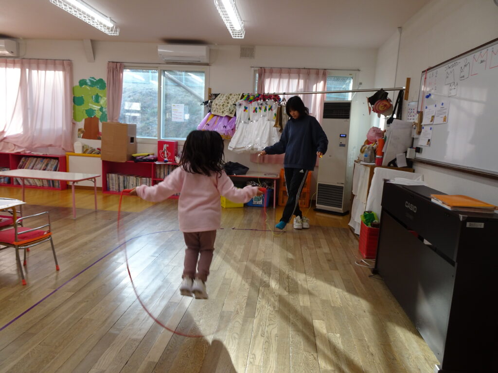 今日は、寒い朝でしたね。子ども達は、園庭で氷や霜柱で遊んでいました。お部屋の中で縄跳びに挑戦している子は二重跳びが跳べて、何と鉄人!が誕生しました。