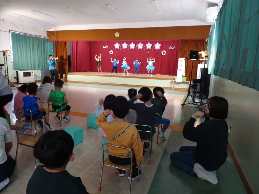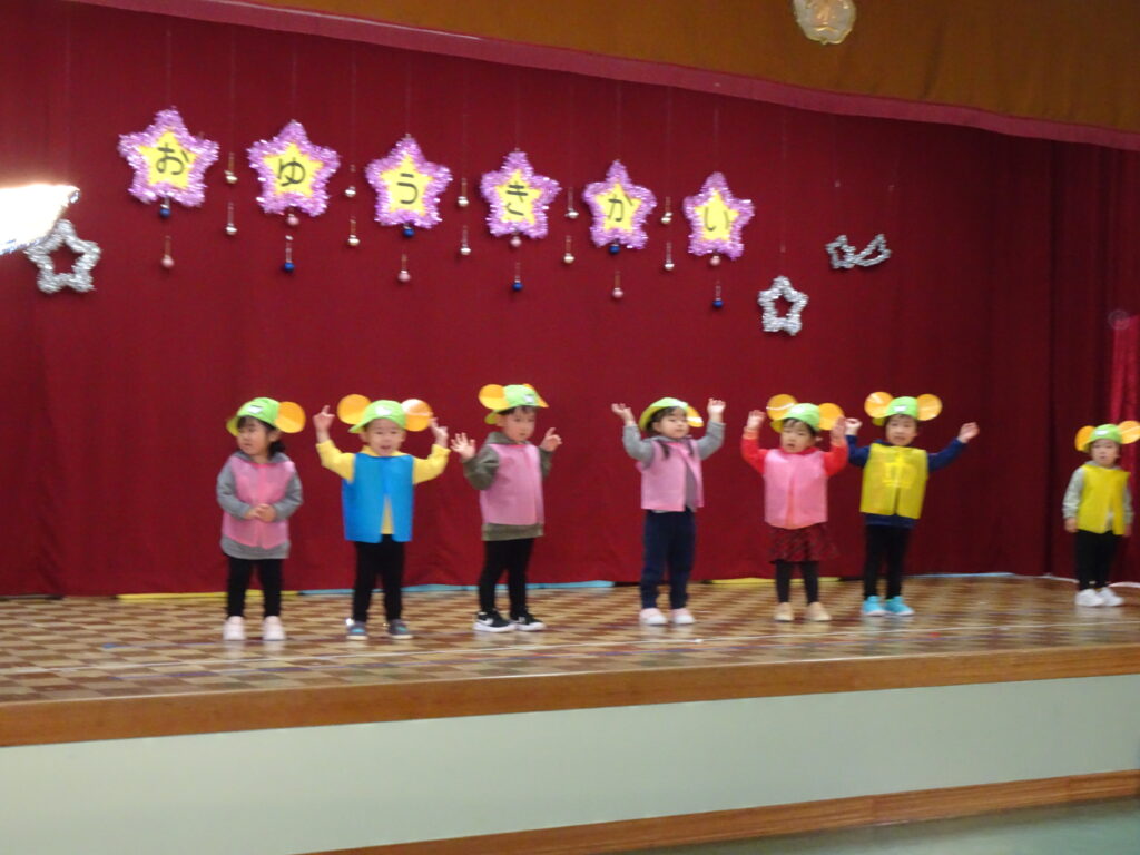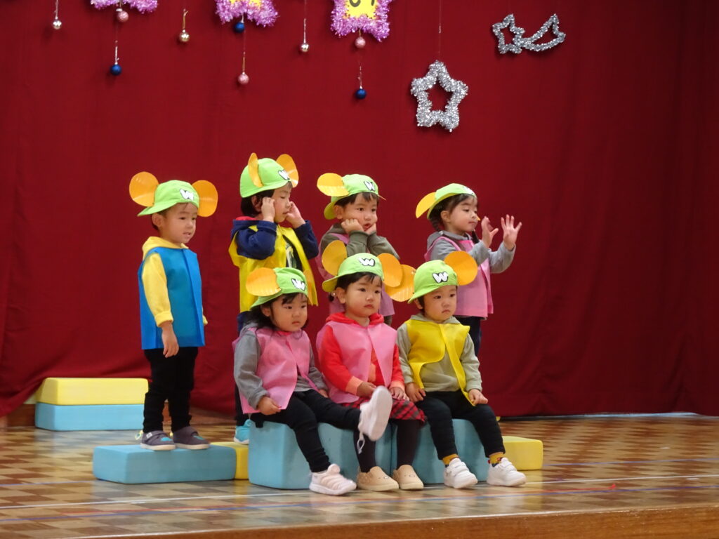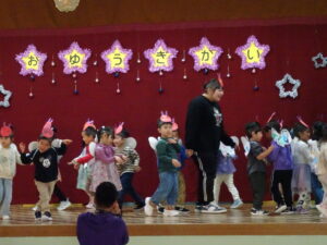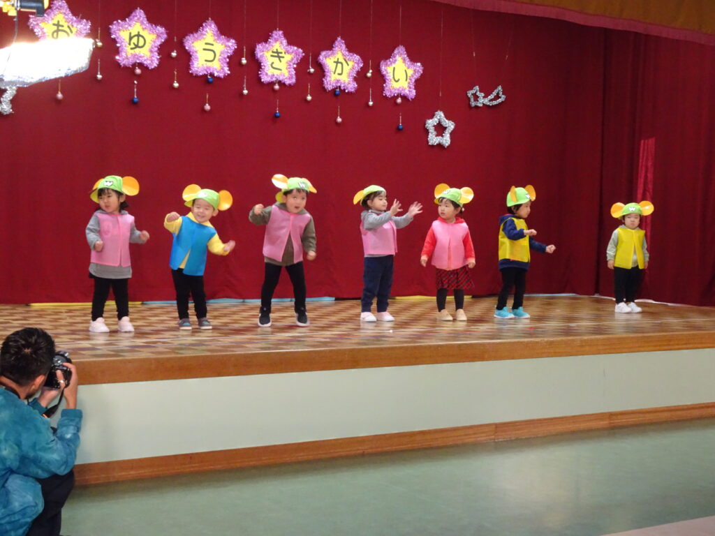 今日はお遊戯会の総練習1日目で、カンガルークラブさんは本番でお家の人にも見ていただきました。お寒い中のご来園大変ありがとうございました。とても可愛らしく ザ・ウェイキー・ショウの「それもいいね」を踊りました。皆、ウエイキーになって楽しそうでした。全員揃って、とても素敵な発表でした。カンガルーさんのお遊戯会本番の後には、年中、年少、年長のお遊戯7曲を踊りました。お休みのお友達がいたのは残念でしたが、先生手作りの素敵な衣装を着て、うさぎ組さんは可愛らしく、ぱんだ組さんは昨年より成長した姿、きりん組さんは「さすが年長!」という踊りで、難しい振り付けをキレキレに踊って見せてくれました。踊り終わったお友達を「上手だったね。」「カッコよかったよ!」と褒める姿も可愛らしかったです。明日は総練習2日目、出し物をします。幼稚園では、総練習には写真屋さんが撮影し、お遊戯会当日はビデオ屋さんがビデオを撮りますのでご了承ください。(森)