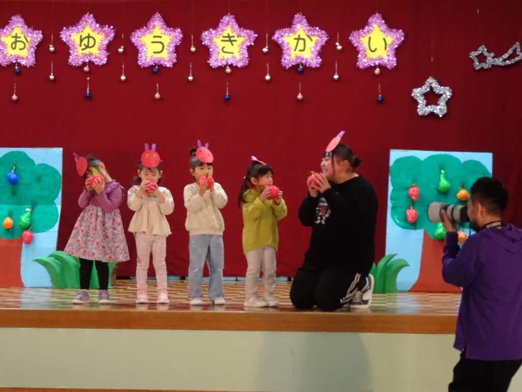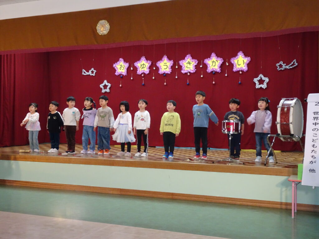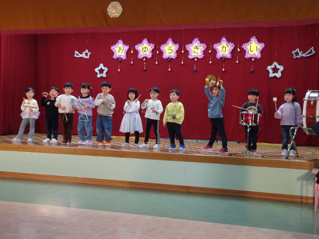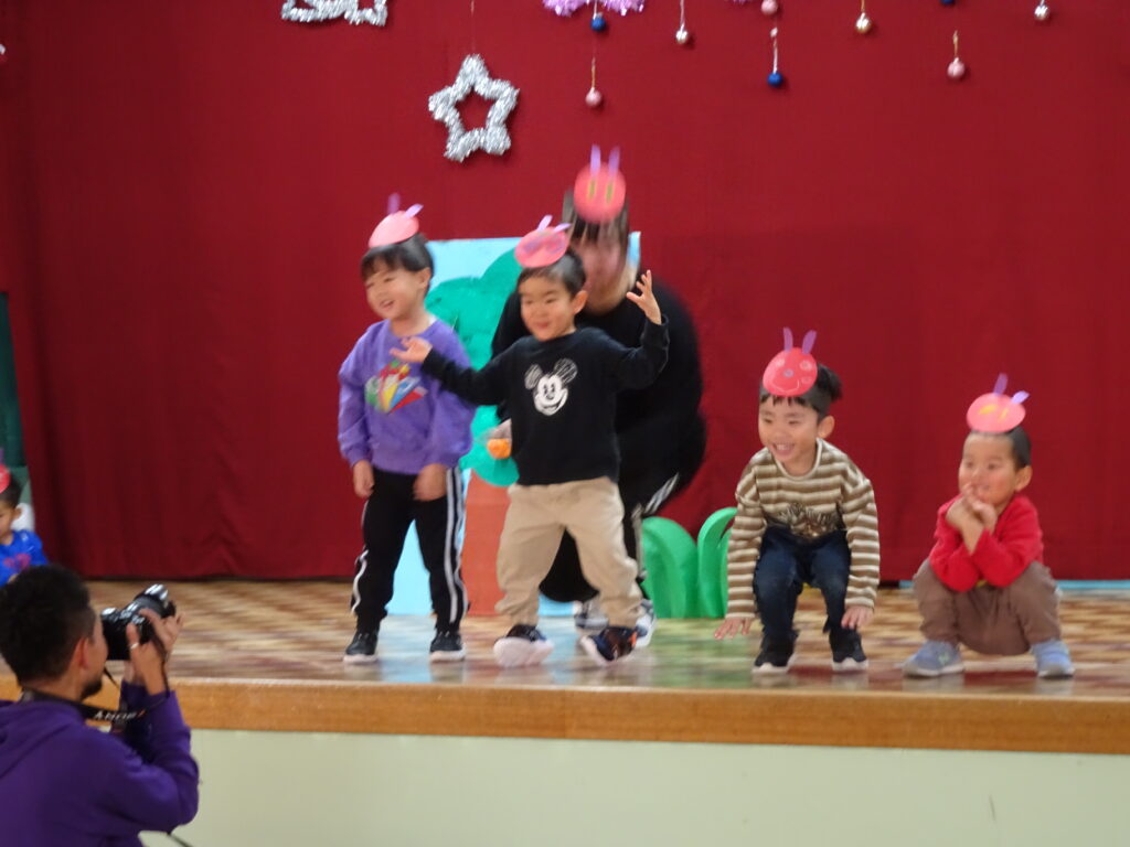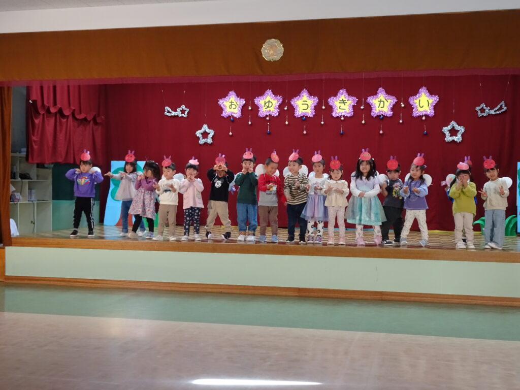 今日はお遊戯会の総練習2日目、出し物の発表をしました。最初はぱんだ組さんの歌と器楽で、お休みのお友達もいましたが大きな声でしっかり歌うことができました。自分で選んだ楽器も楽しく演奏できました。うさぎ組さんの劇遊びでは、みんなはらぺこ青虫になって、リンゴやナシ、イチゴを食べて、きれいなちょうちょうになりました。久しぶりに全員出席!で、とても大きな声で歌えました。とってもかわいい発表でした。きりん組さんはお休みのお友達もいましたが、セリフやナレーションを頑張りました。終わりの挨拶もしっかり大きな声で言うことができました。