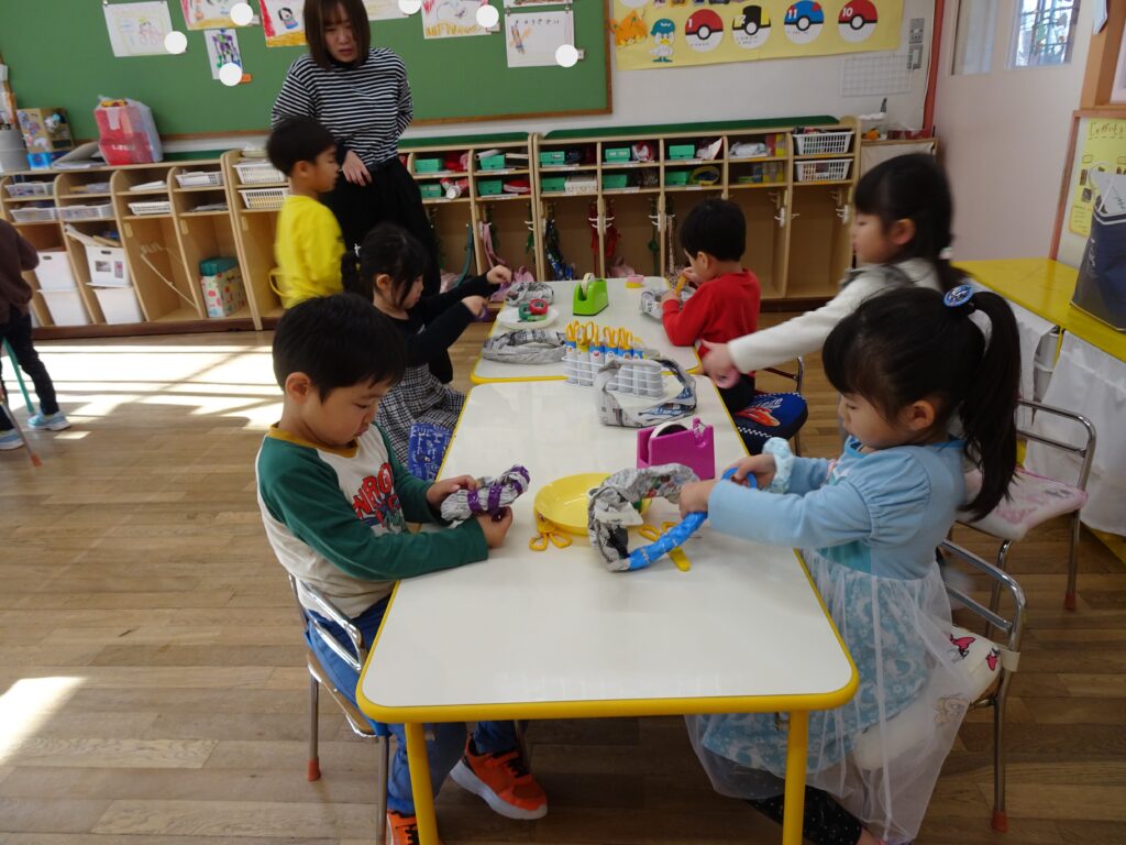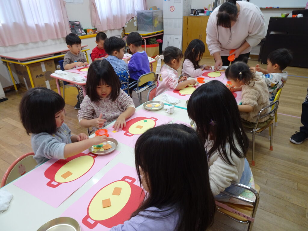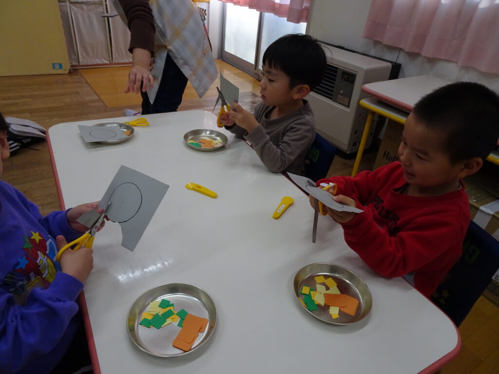 きりん組さんは高山にあるゴミ処理センターに行ってきました。ゴミ収集車やクレーンなどの施設に興味津々のきりん組さんでした。ぱんだ組さんは、「忍者の修行その1」で今日は手裏剣の練習をしました。明日の忍術修行が楽しみです。うさぎ組さんは、ハサミの練習でシチューづくりをしました。ジャガイモ、ニンジン、ブロッコリー、お肉、お玉をハサミで切って、「1回切り」「2回切り」「連続切り」の練習をしました。難しかったけれど、美味しそうなシチューができました。カンガルーさんは、ピヨピヨのお部屋で遊びました。おままごとや、ブロックを楽しみました。