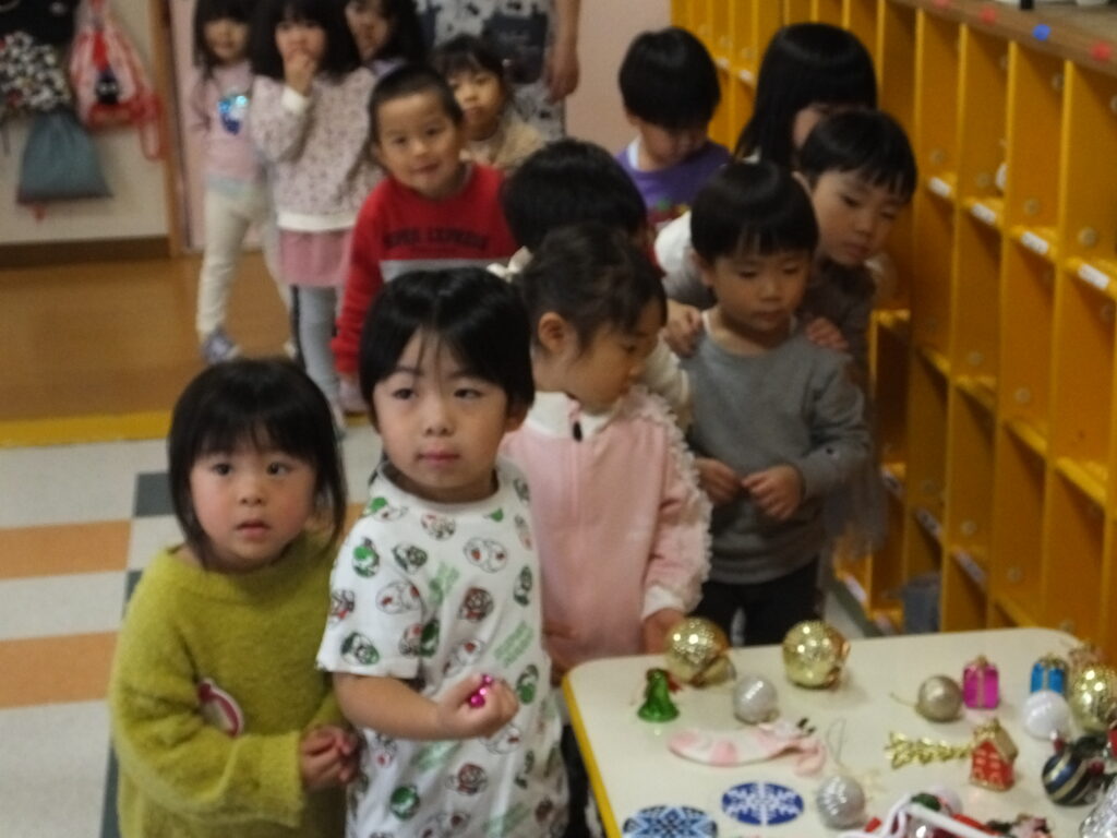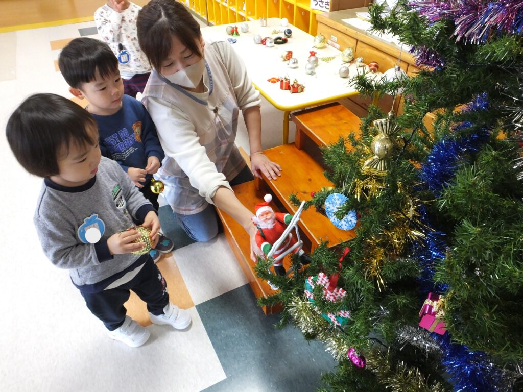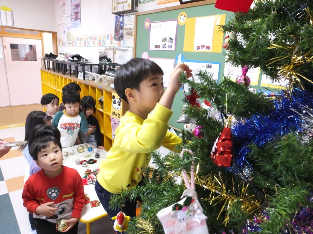 今朝は「クリスマスツリーの飾りつけ」をしました。クラス毎に一人一つずつ飾りました。クリスマスまであとひと月、12月24日の終業式まで元気で過ごしたいですね…。