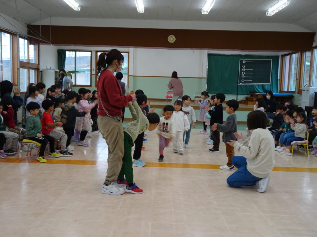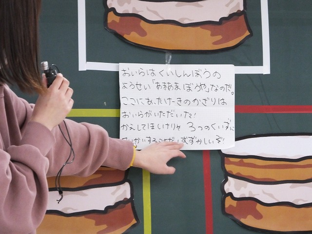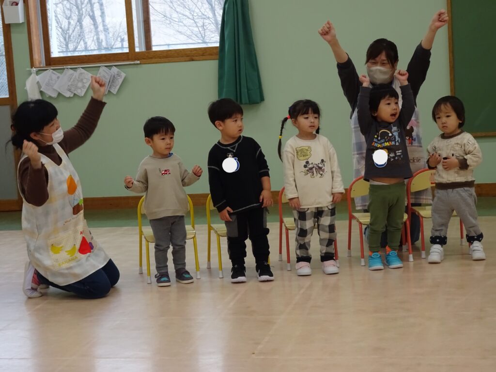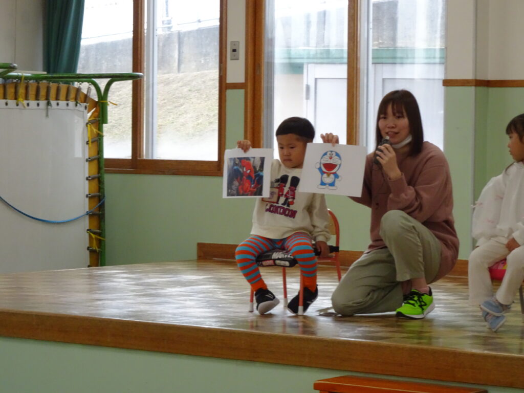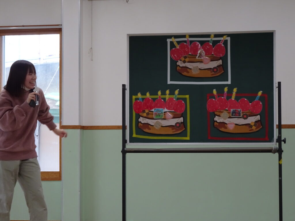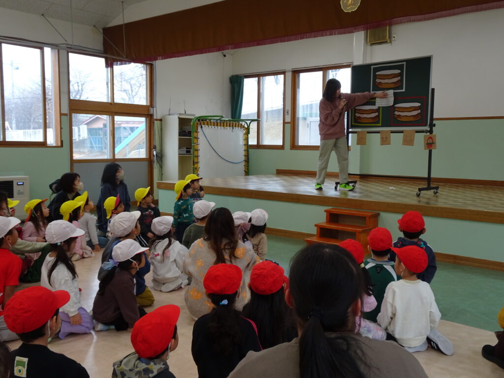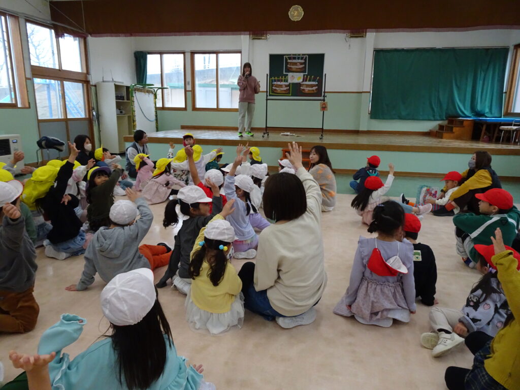 今日は11月のお誕生会で、3人のお友達のお祝をしました。お家の方にも来ていただいて、3人のお友達はとってもドキドキしていましたが、自己紹介も、好きなキャラクタークイズも楽しくできました。「ごきげんいかが」の歌も「ハッピーフレンズ」の歌もとっても元気よく歌えました。今日のお楽しみはゲームで「ケーキを作ろう!」でした。妖精の「あまあまぼうや」が取って行ったケーキの飾りをクイズに答えて取り返しました。ぱんだ組さんが答えて「クッキー」、うさぎさんが答えて「ロウソク」、きりん組さんが答えて「イチゴ」が戻ってきました。11月生まれのお友達をお祝いする3つのケーキが完成しました。ゲームの後にはお家の人にありがとうのプレゼントを渡しました。今日は、ヒツジパンとバナナが出てお腹いっぱいになりました!