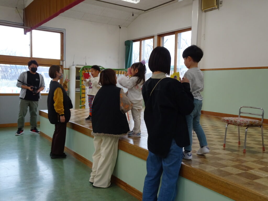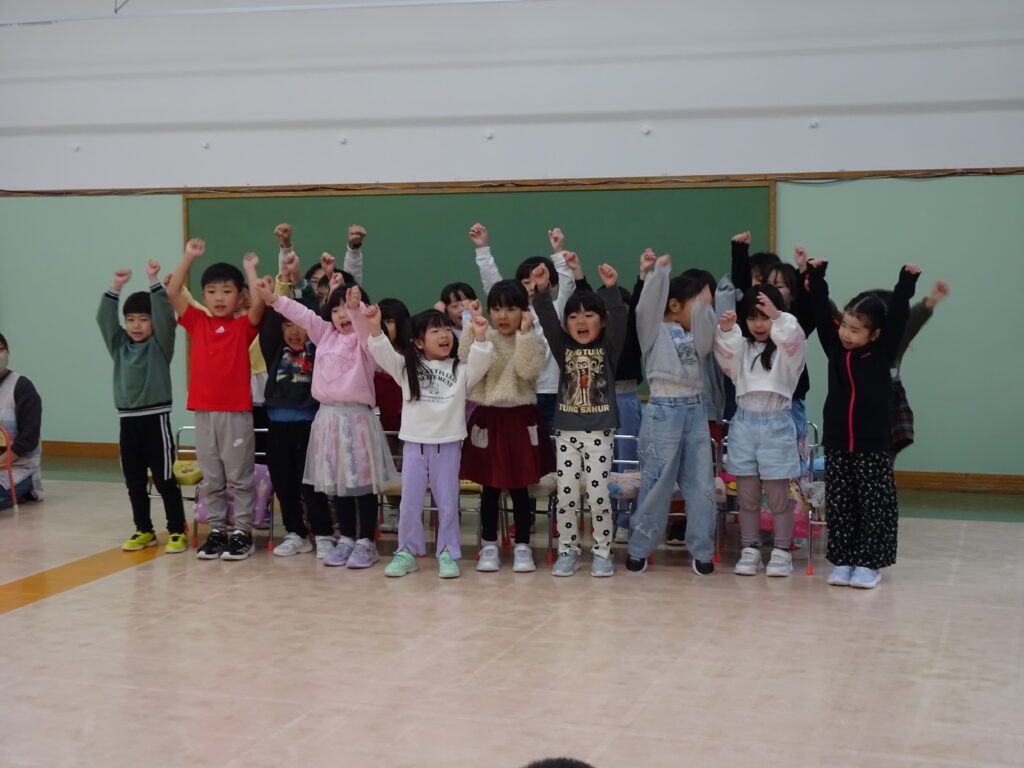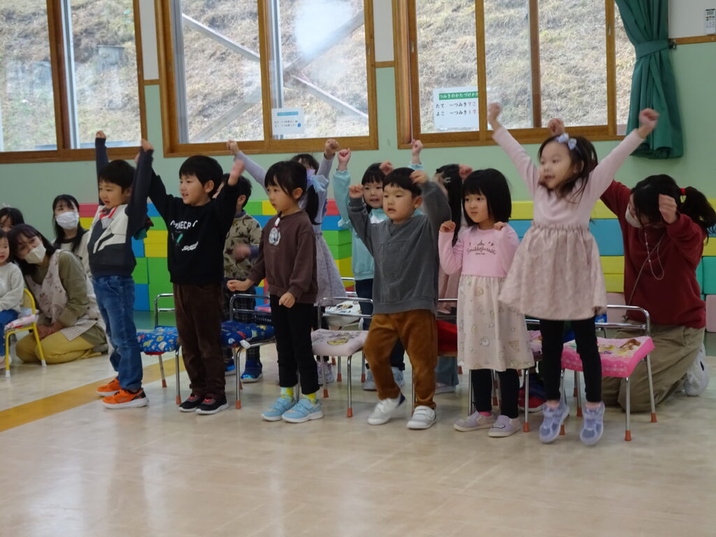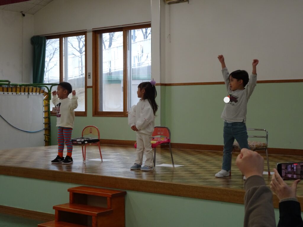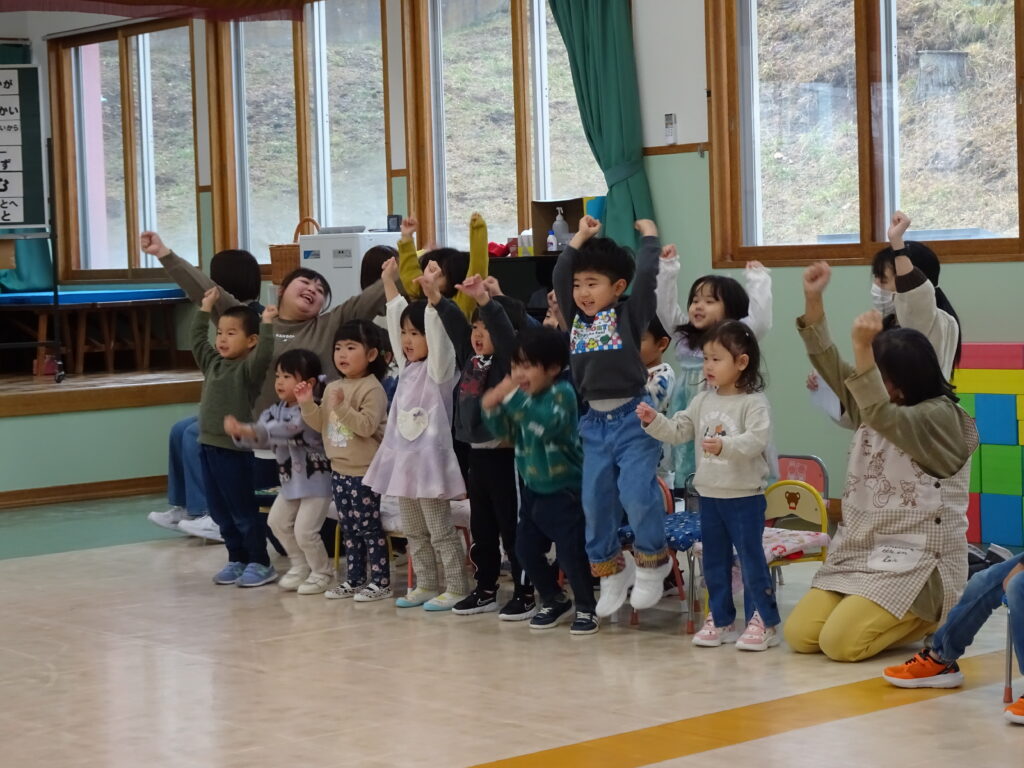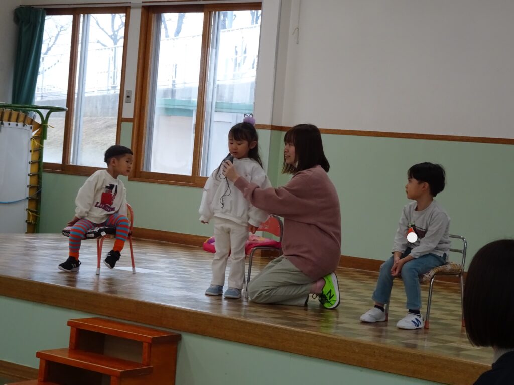 今日は11月のお誕生会で、3人のお友達のお祝をしました。お家の方にも来ていただいて、3人のお友達はとってもドキドキしていましたが、自己紹介も、好きなキャラクタークイズも楽しくできました。「ごきげんいかが」の歌も「ハッピーフレンズ」の歌もとっても元気よく歌えました。今日のお楽しみはゲームで「ケーキを作ろう!」でした。妖精の「あまあまぼうや」が取って行ったケーキの飾りをクイズに答えて取り返しました。ぱんだ組さんが答えて「クッキー」、うさぎさんが答えて「ロウソク」、きりん組さんが答えて「イチゴ」が戻ってきました。11月生まれのお友達をお祝いする3つのケーキが完成しました。ゲームの後にはお家の人にありがとうのプレゼントを渡しました。今日は、ヒツジパンとバナナが出てお腹いっぱいになりました!