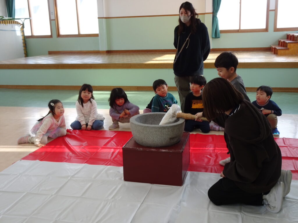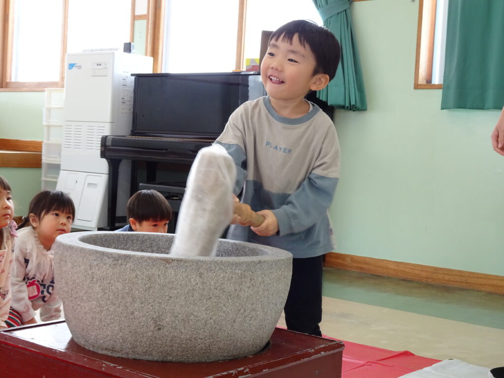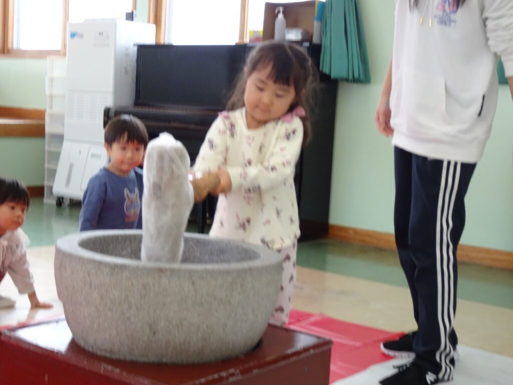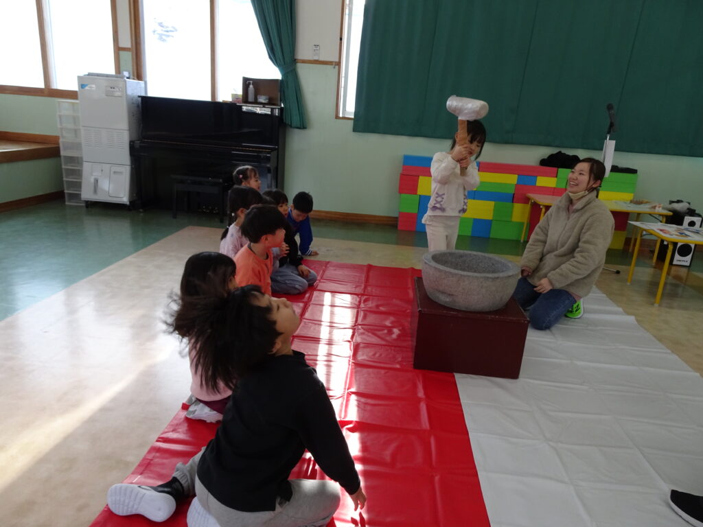 今日は、お餅つきをしました。3クラスの園児がお遊戯室に集まって、お餅つきのいわれや、もち米、つき方についてのお話を聞きました。その後実際に先生達で、もち米のお餅を一臼つきました。お遊戯室に、もち米をふかしたいい香りがしました。その後は、うさぎ組は5回、ぱんだ組は7回、きりん組は10回餅つきをしました。子ども用の杵でペッタン、ペッタンとつきました。初めてのうさぎ組さんは小さな動きでしたが、きりん組さんは杵を持つのにも慣れて、とても力強かったです。ご飯の後には、ソリや雪だるま作りなど、雪遊びも楽しみました。雪遊びには、スノーウエアー(上下かつなぎ)、冬用帽子、ナイロン製の手袋、雪の入らない長めの靴(できたら靴カバー)が必要になりますので、この時期雪遊びが出来そうな日には準備をお願いいたします。