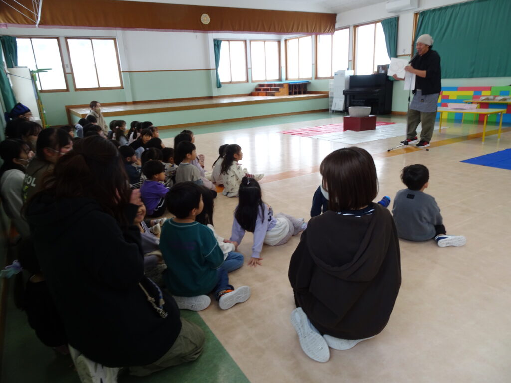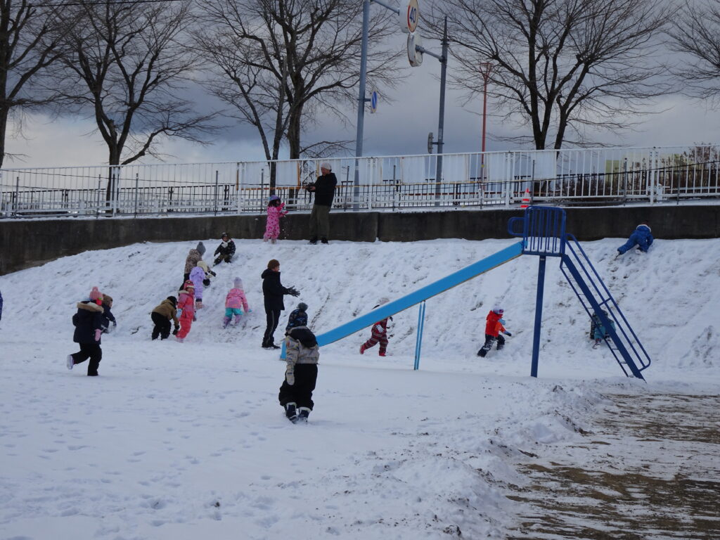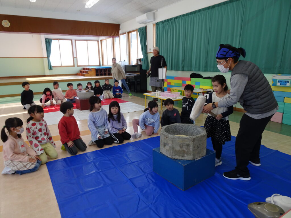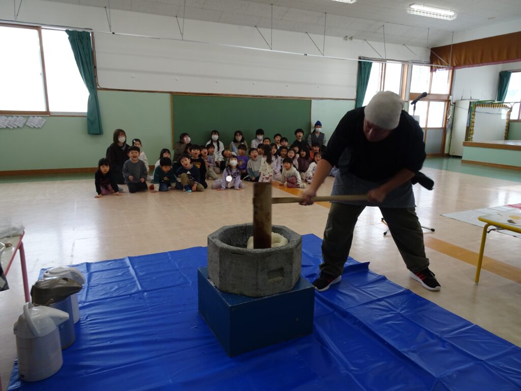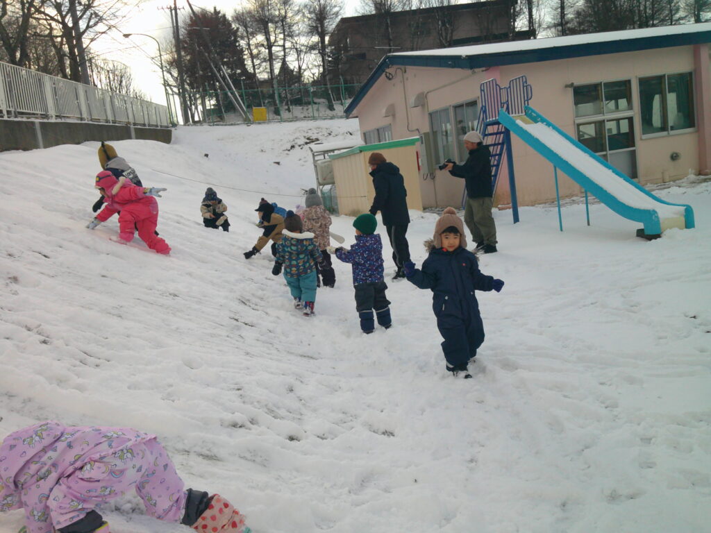 今日は、お餅つきをしました。3クラスの園児がお遊戯室に集まって、お餅つきのいわれや、もち米、つき方についてのお話を聞きました。その後実際に先生達で、もち米のお餅を一臼つきました。お遊戯室に、もち米をふかしたいい香りがしました。その後は、うさぎ組は5回、ぱんだ組は7回、きりん組は10回餅つきをしました。子ども用の杵でペッタン、ペッタンとつきました。初めてのうさぎ組さんは小さな動きでしたが、きりん組さんは杵を持つのにも慣れて、とても力強かったです。ご飯の後には、ソリや雪だるま作りなど、雪遊びも楽しみました。雪遊びには、スノーウエアー(上下かつなぎ)、冬用帽子、ナイロン製の手袋、雪の入らない長めの靴(できたら靴カバー)が必要になりますので、この時期雪遊びが出来そうな日には準備をお願いいたします。