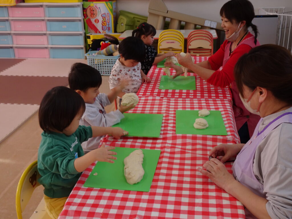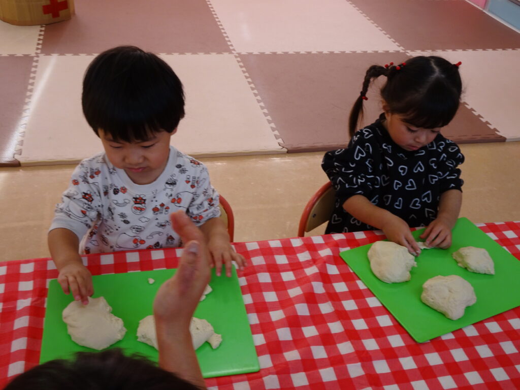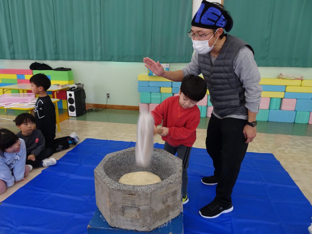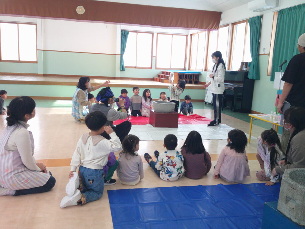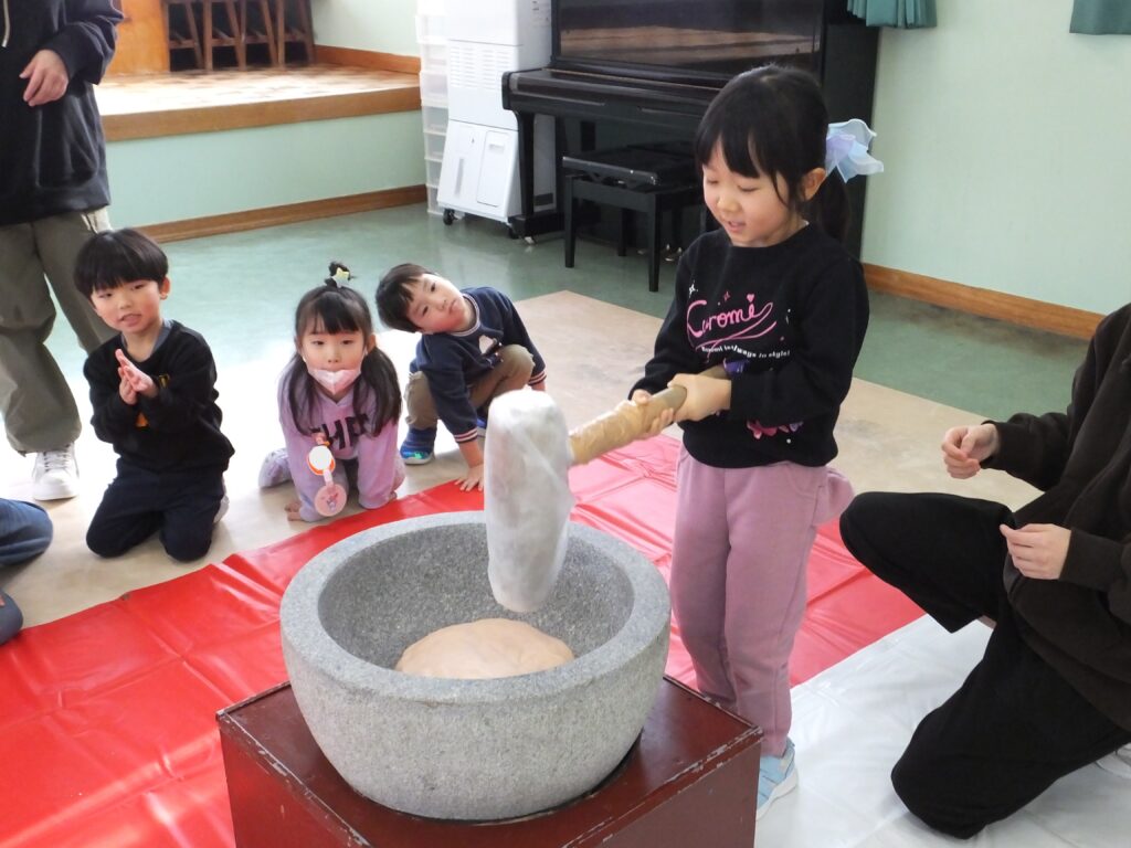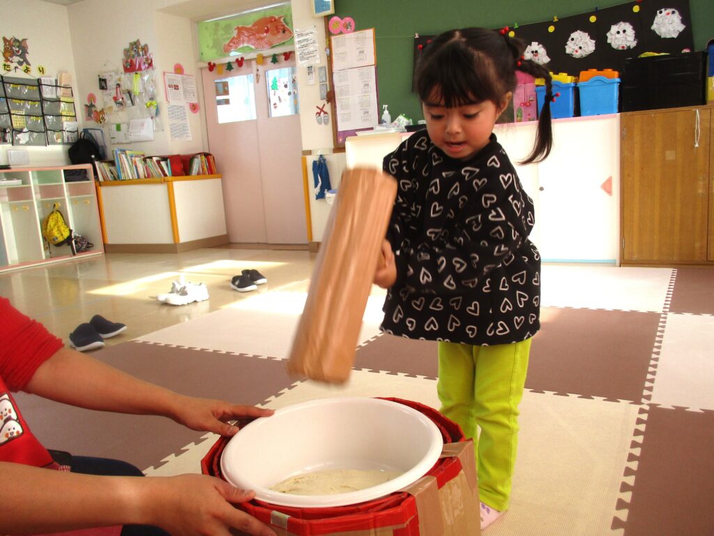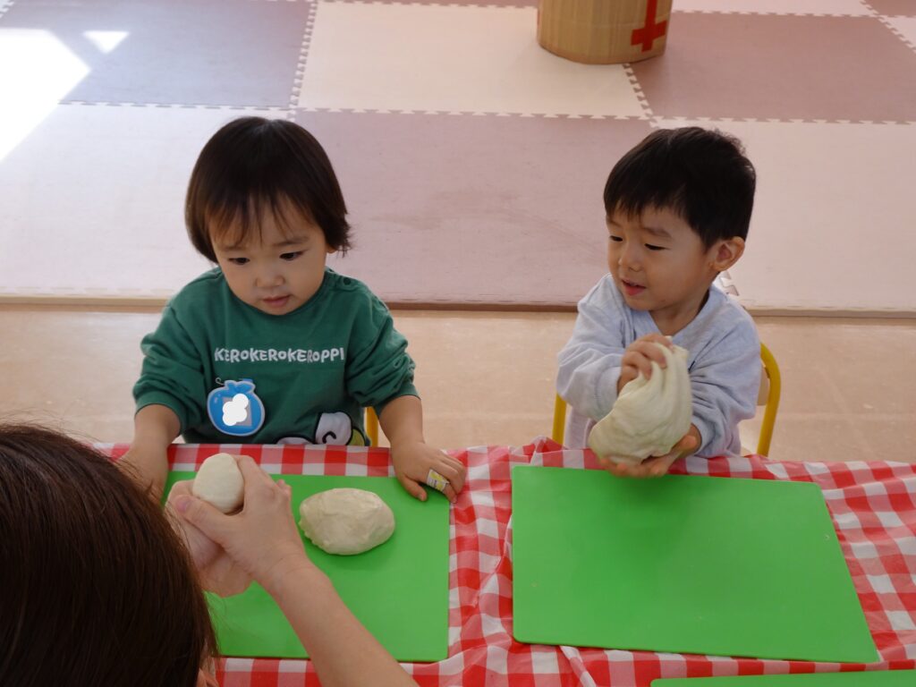 カンガルークラブさんも、お部屋でお餅つきを楽しみました。楽しくお餅つきをして、小麦粉粘土で遊びました。(ふぞく幼稚園ではお餅つきは小麦粉粘土で楽しんでいます!)(森)