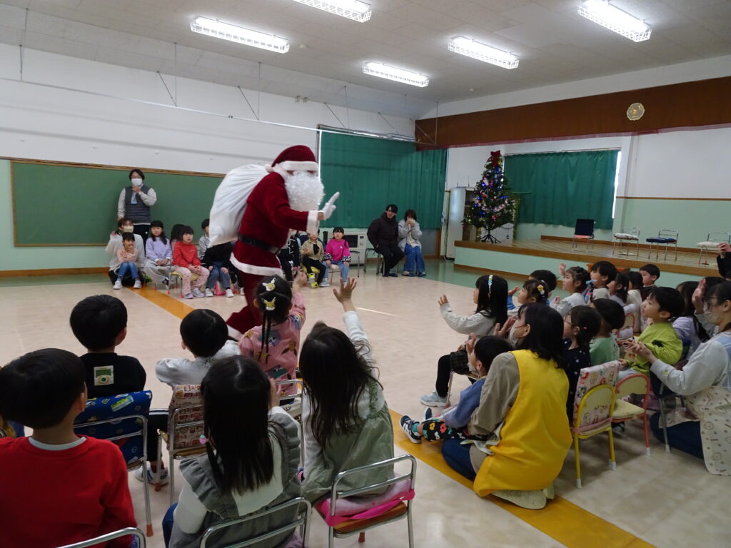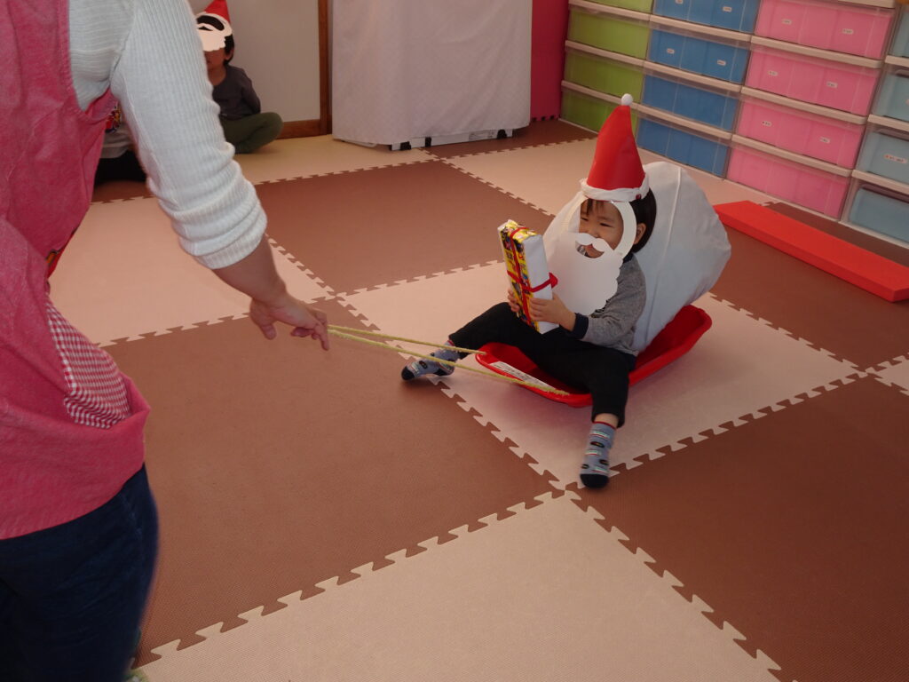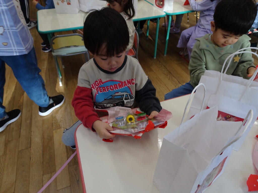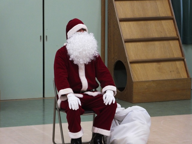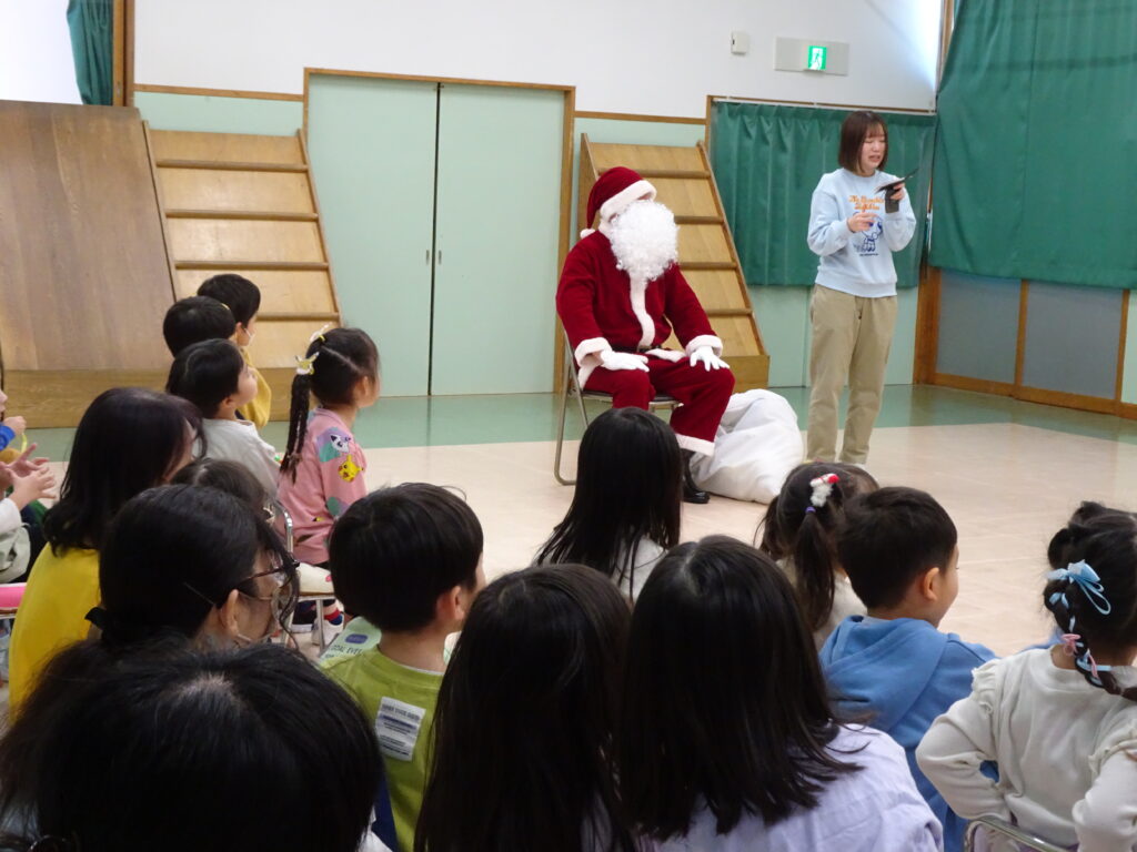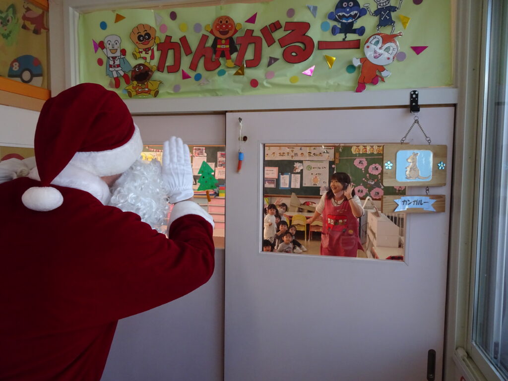 今日は、クリスマスお誕生会でした。12月生まれのお友達は5人ですが、1人お休みで4人のお祝いをしました。クリスマスお誕生会は、年長きりん組さんのキャンドルライトで入場します。ろうそくを持って火をつけてもらったきりん組さんは、とっても嬉しそうでした。12月生まれのお友達は、お父さん・お母さんと一緒に入場しました。いつもと同じ「ごきげんいかが」の歌、「自己紹介」では4人のお友達の好きなキャラクタークイズもありました。お誕生日のプレゼントを首にかけて、「ハッピーフレンズ」の歌のプレゼントの後、司会の先生がクリスマスについてのお話をしてくれました。サンタさんが来る時には鈴の音が聞こえる…、とお話をしてくれると鈴の音が聞こえてきて、なんと!サンタさんが「Merry Christmas!」とお遊戯室に来てくれました。喜んだ子、驚いている子、怖がっている子…。各クラスで考えたサンタさんへの質問「どうして寝ないとサンタさんは来てくれないの?」「どんなお家に住んでいるの?」「大人はどうしてプレゼントをもらえないの?」の質問にも、「子ども達に会ってお礼を言われると恥ずかしいからだよ。」「暖炉がある素敵なお家で、おもちゃ工場もあるよ。」「大人は子どもの時に沢山プレゼントをもらったからだよ。」と英語で答えてくれました。サンタさんには、もっと長くいて欲しかったのですが、次のところに行かなければならないから…、と帰って行かれました。カンガルーさんのお部屋もちょっと覗いてくれました。カンガルーさんも、喜んだり、驚いたり…。その後お遊戯室ではフォークダンス「赤鼻のトナカイ」を楽しく踊りました。お誕生会の最後は、お家の人へのプレゼントを渡しました。お部屋に戻ると、サンタさんのくれたプレゼント、クリスマスケーキに大喜びの子ども達でした。カンガルーさんは、お部屋でサンタさんになって、寝ているアンパンマンにプレゼントを届けました。
