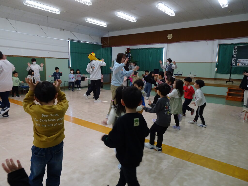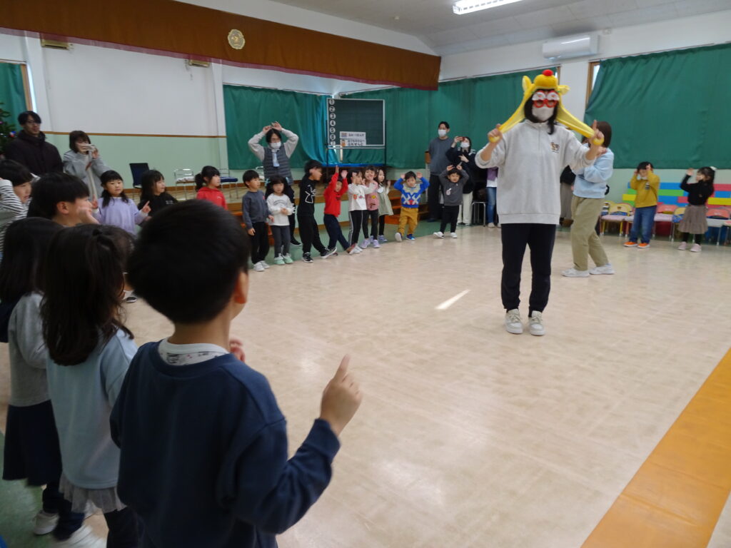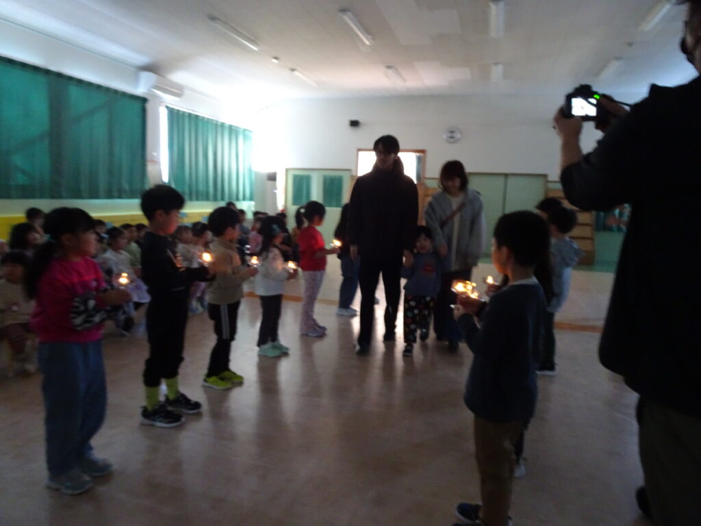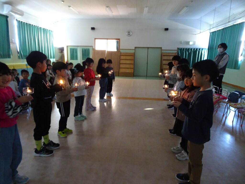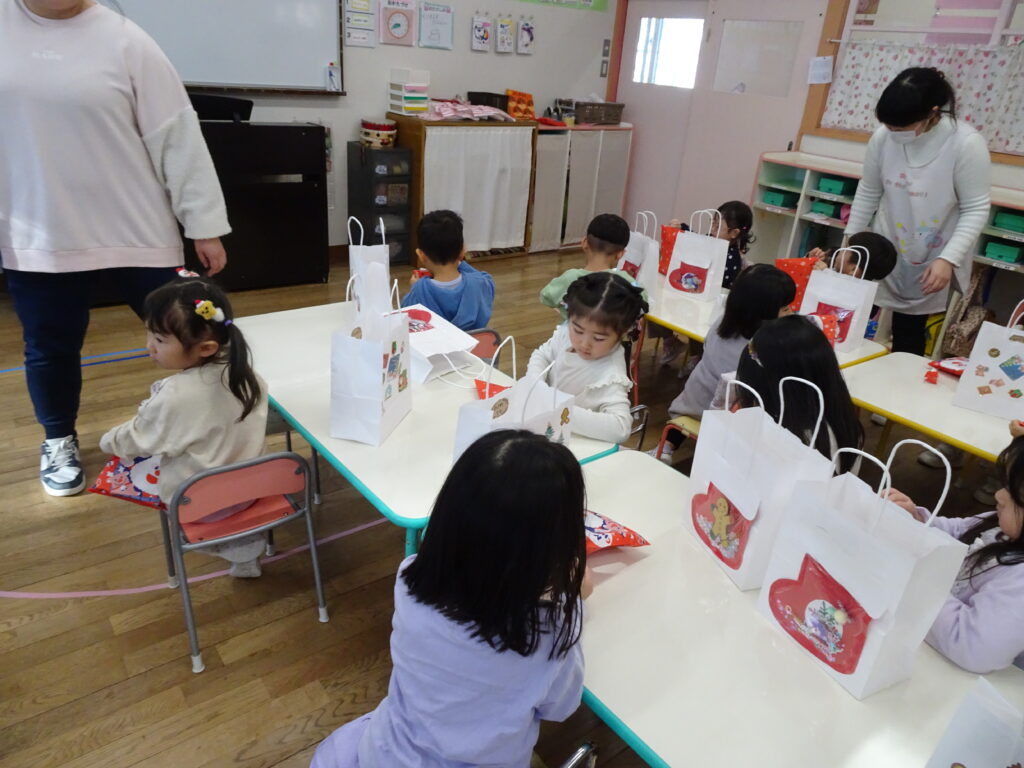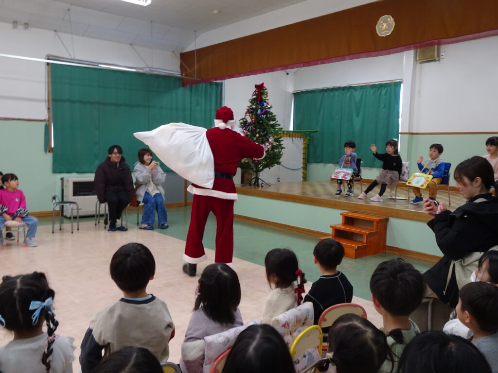 今日は、クリスマスお誕生会でした。12月生まれのお友達は5人ですが、1人お休みで4人のお祝いをしました。クリスマスお誕生会は、年長きりん組さんのキャンドルライトで入場します。ろうそくを持って火をつけてもらったきりん組さんは、とっても嬉しそうでした。12月生まれのお友達は、お父さん・お母さんと一緒に入場しました。いつもと同じ「ごきげんいかが」の歌、「自己紹介」では4人のお友達の好きなキャラクタークイズもありました。お誕生日のプレゼントを首にかけて、「ハッピーフレンズ」の歌のプレゼントの後、司会の先生がクリスマスについてのお話をしてくれました。サンタさんが来る時には鈴の音が聞こえる…、とお話をしてくれると鈴の音が聞こえてきて、なんと!サンタさんが「Merry Christmas!」とお遊戯室に来てくれました。喜んだ子、驚いている子、怖がっている子…。各クラスで考えたサンタさんへの質問「どうして寝ないとサンタさんは来てくれないの?」「どんなお家に住んでいるの?」「大人はどうしてプレゼントをもらえないの?」の質問にも、「子ども達に会ってお礼を言われると恥ずかしいからだよ。」「暖炉がある素敵なお家で、おもちゃ工場もあるよ。」「大人は子どもの時に沢山プレゼントをもらったからだよ。」と英語で答えてくれました。サンタさんには、もっと長くいて欲しかったのですが、次のところに行かなければならないから…、と帰って行かれました。カンガルーさんのお部屋もちょっと覗いてくれました。カンガルーさんも、喜んだり、驚いたり…。その後お遊戯室ではフォークダンス「赤鼻のトナカイ」を楽しく踊りました。お誕生会の最後は、お家の人へのプレゼントを渡しました。お部屋に戻ると、サンタさんのくれたプレゼント、クリスマスケーキに大喜びの子ども達でした。カンガルーさんは、お部屋でサンタさんになって、寝ているアンパンマンにプレゼントを届けました。