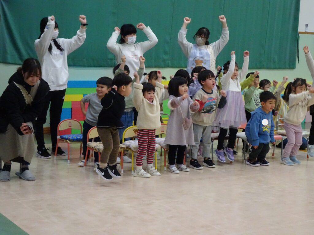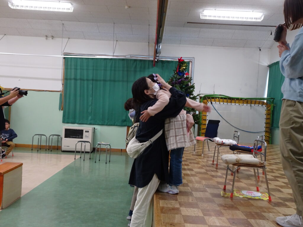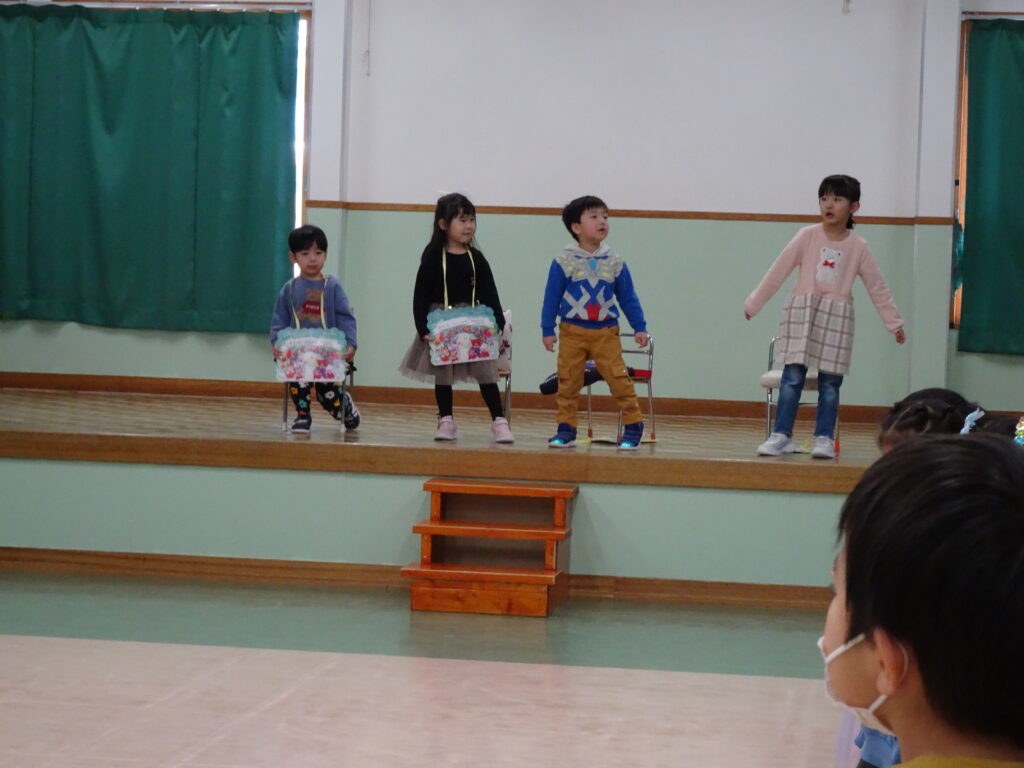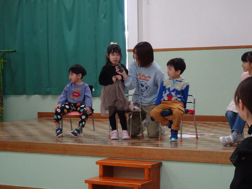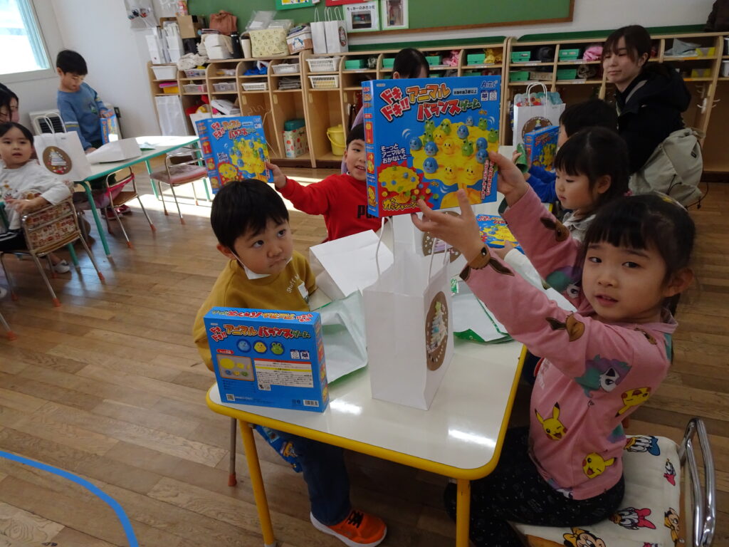 今日は、クリスマスお誕生会でした。12月生まれのお友達は5人ですが、1人お休みで4人のお祝いをしました。クリスマスお誕生会は、年長きりん組さんのキャンドルライトで入場します。ろうそくを持って火をつけてもらったきりん組さんは、とっても嬉しそうでした。12月生まれのお友達は、お父さん・お母さんと一緒に入場しました。いつもと同じ「ごきげんいかが」の歌、「自己紹介」では4人のお友達の好きなキャラクタークイズもありました。お誕生日のプレゼントを首にかけて、「ハッピーフレンズ」の歌のプレゼントの後、司会の先生がクリスマスについてのお話をしてくれました。サンタさんが来る時には鈴の音が聞こえる…、とお話をしてくれると鈴の音が聞こえてきて、なんと!サンタさんが「Merry Christmas!」とお遊戯室に来てくれました。喜んだ子、驚いている子、怖がっている子…。各クラスで考えたサンタさんへの質問「どうして寝ないとサンタさんは来てくれないの?」「どんなお家に住んでいるの?」「大人はどうしてプレゼントをもらえないの?」の質問にも、「子ども達に会ってお礼を言われると恥ずかしいからだよ。」「暖炉がある素敵なお家で、おもちゃ工場もあるよ。」「大人は子どもの時に沢山プレゼントをもらったからだよ。」と英語で答えてくれました。サンタさんには、もっと長くいて欲しかったのですが、次のところに行かなければならないから…、と帰って行かれました。カンガルーさんのお部屋もちょっと覗いてくれました。カンガルーさんも、喜んだり、驚いたり…。その後お遊戯室ではフォークダンス「赤鼻のトナカイ」を楽しく踊りました。お誕生会の最後は、お家の人へのプレゼントを渡しました。お部屋に戻ると、サンタさんのくれたプレゼント、クリスマスケーキに大喜びの子ども達でした。カンガルーさんは、お部屋でサンタさんになって、寝ているアンパンマンにプレゼントを届けました。