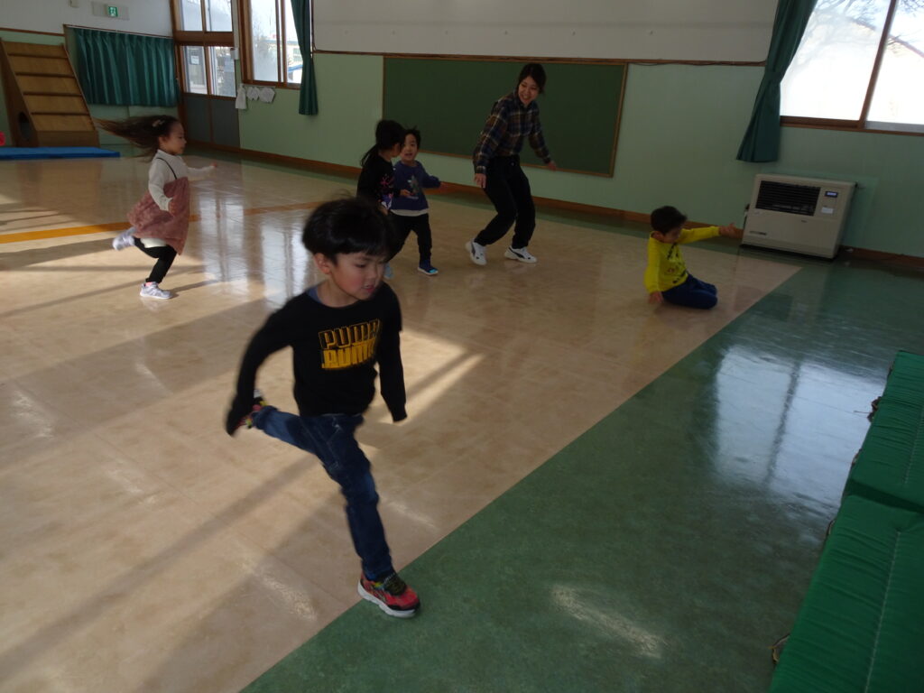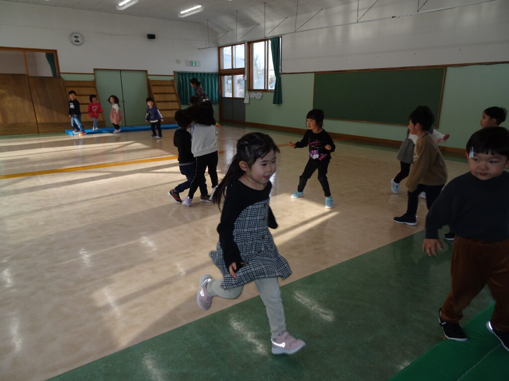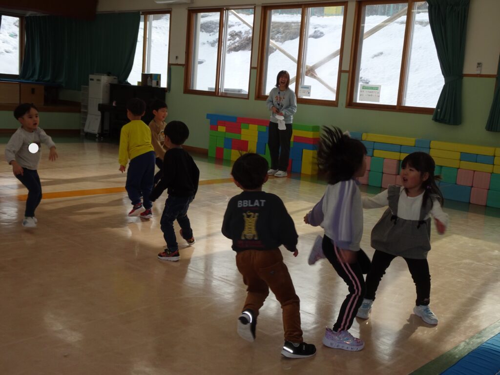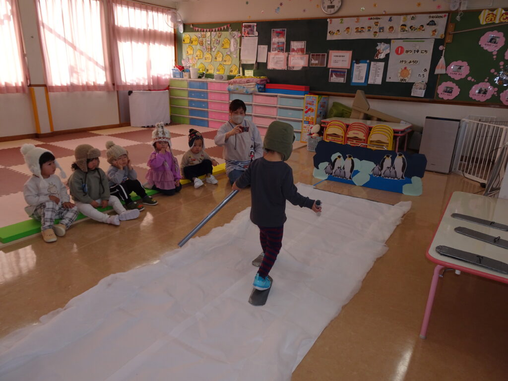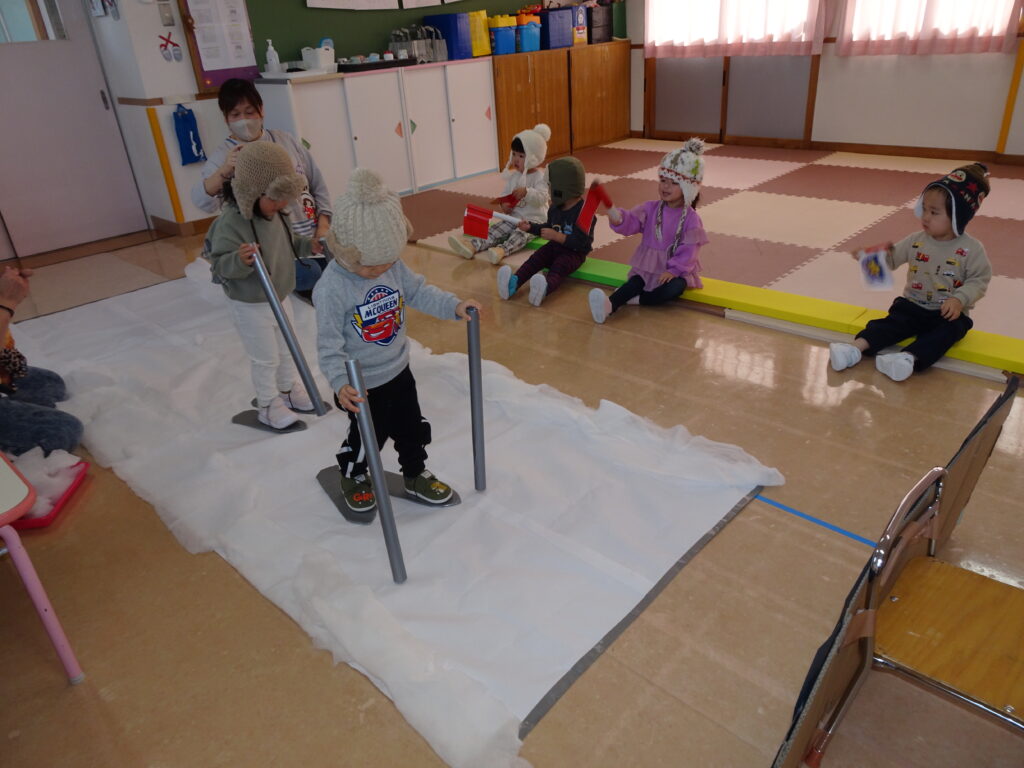 きりん組さんは、「鬼のお面」を作りました。折り紙を自分で千切って貼り付けました。節分が楽しみです。ぱんだ組さんは、お遊戯室で集団遊び「丸鬼ごっこ」「ねことねずみ」をしました。「疲れた!」「喉乾いたよ!」と走り回っていました。うさぎ組さんは節分のオニのお面作りで、2本の鬼の角の周りにお花紙を丸めて貼っていました。いろいろな色のお花紙でカラフルに仕上げていました。カンガルークラブさんは、お部屋で「歩くスキーごっこ」をしていました。歩くスキーコースの上を、帽子をかぶってスキーを履いて、ポールを持ってすべりました。