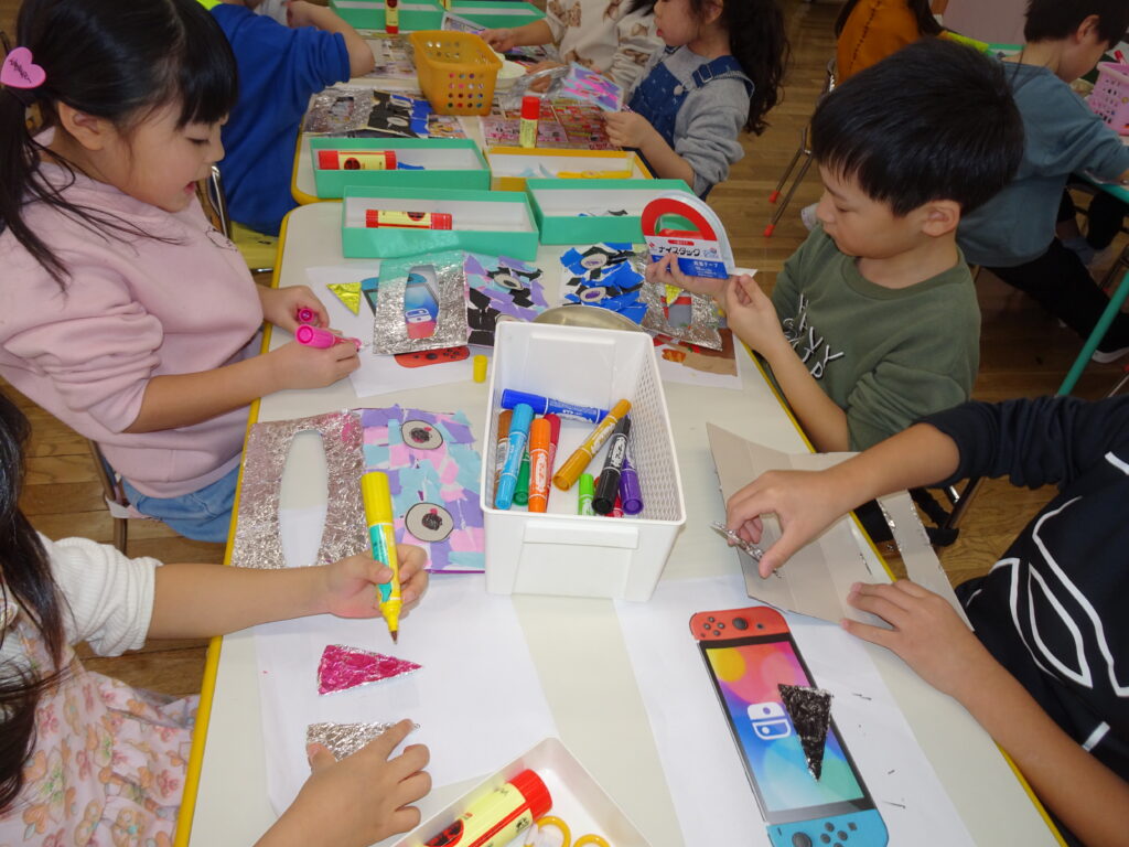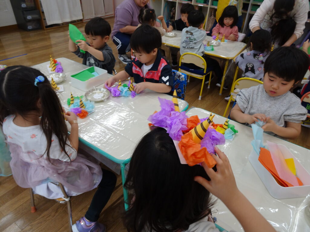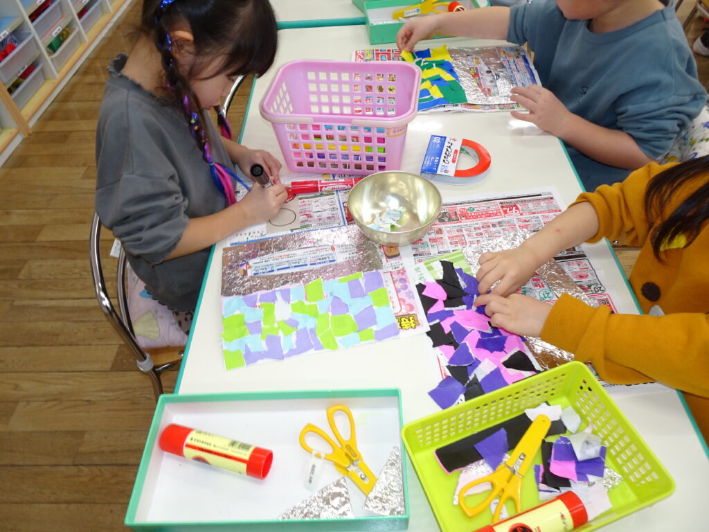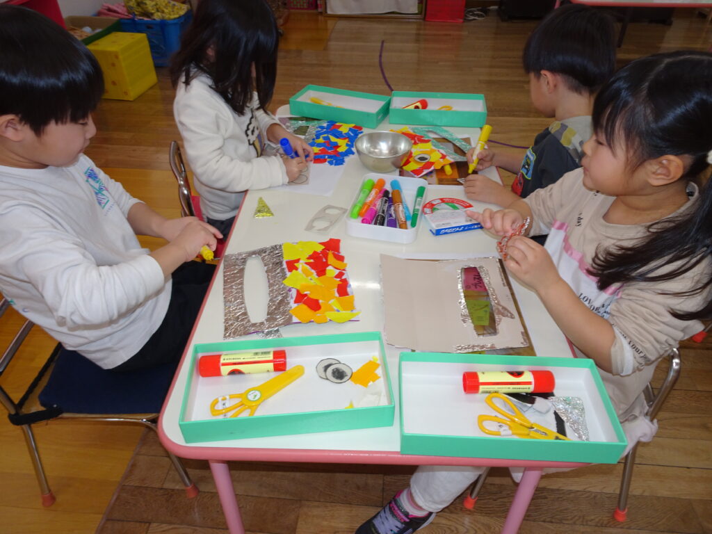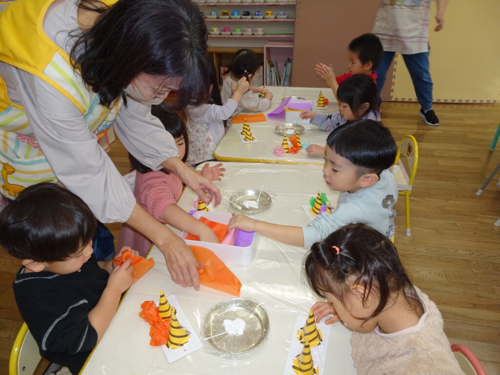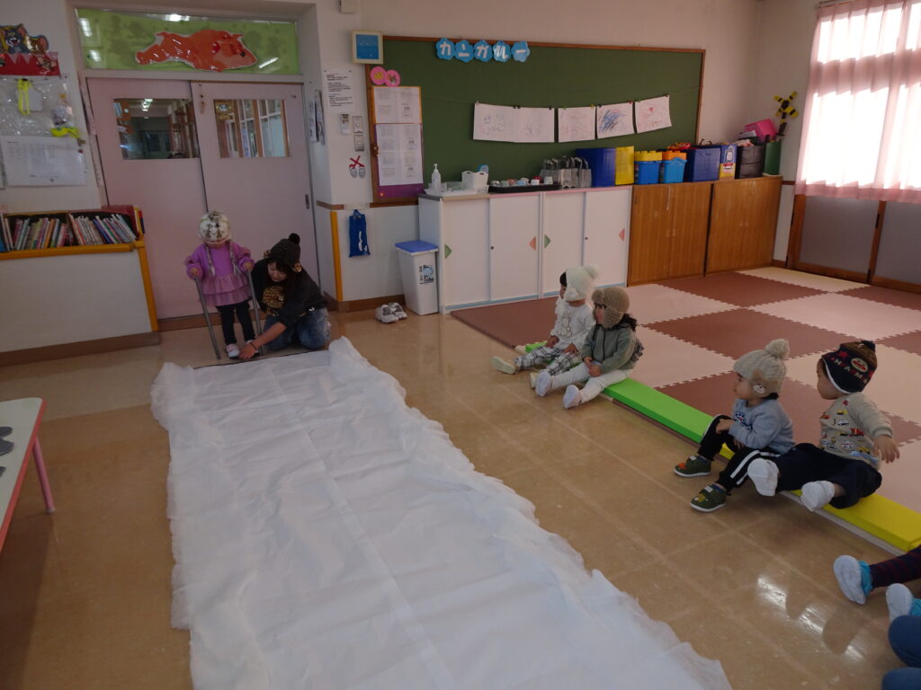 きりん組さんは、「鬼のお面」を作りました。折り紙を自分で千切って貼り付けました。節分が楽しみです。ぱんだ組さんは、お遊戯室で集団遊び「丸鬼ごっこ」「ねことねずみ」をしました。「疲れた!」「喉乾いたよ!」と走り回っていました。うさぎ組さんは節分のオニのお面作りで、2本の鬼の角の周りにお花紙を丸めて貼っていました。いろいろな色のお花紙でカラフルに仕上げていました。カンガルークラブさんは、お部屋で「歩くスキーごっこ」をしていました。歩くスキーコースの上を、帽子をかぶってスキーを履いて、ポールを持ってすべりました。