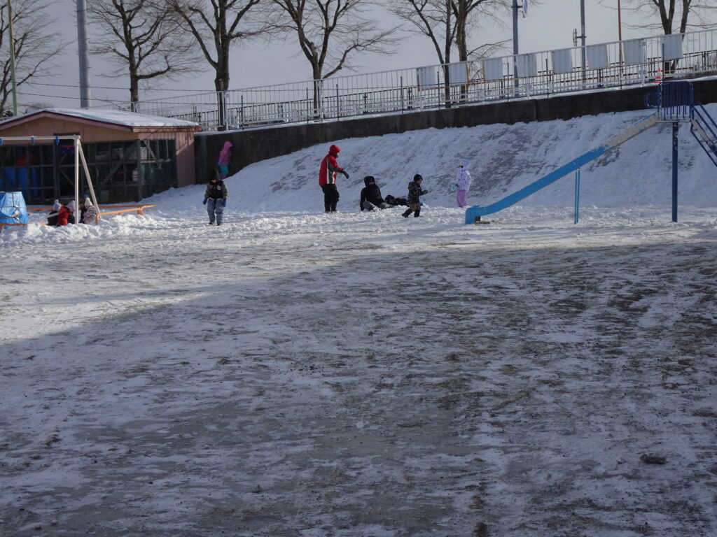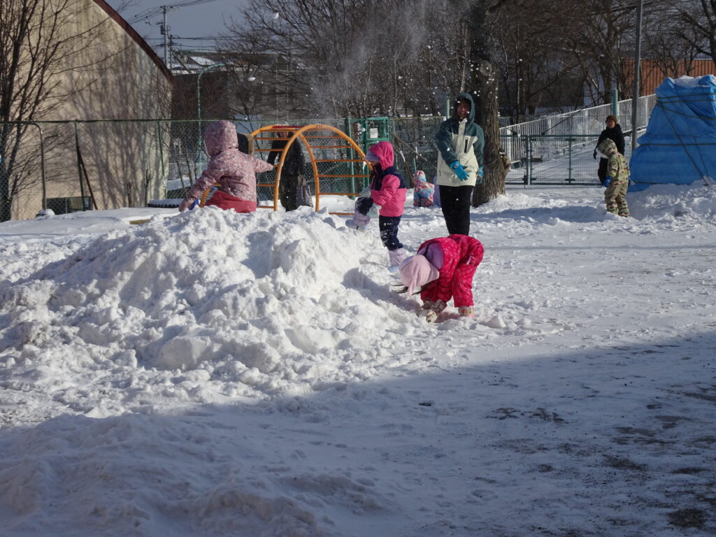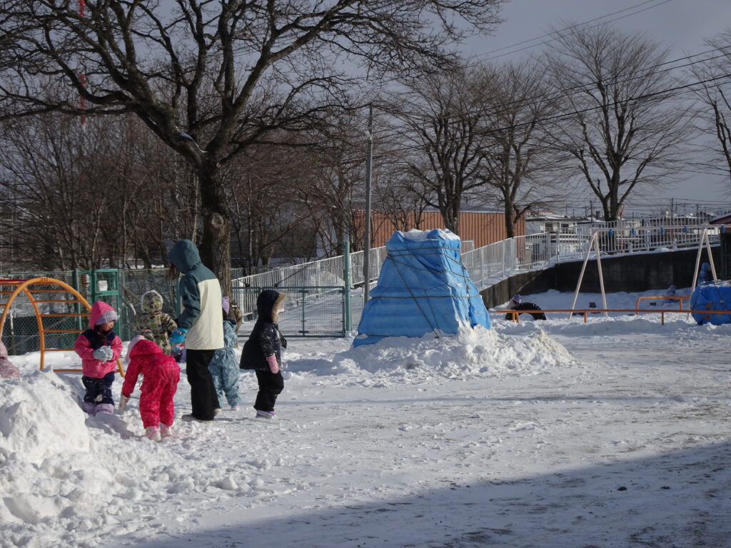 冷たい風の中でしたが、子ども達は園庭で雪遊びを楽しみました。お尻で滑ったり、雪で形を作ったり…、園庭はすぐに土が出てきてしまいました。雪中運動会には、雪がまだ少し足りないですね。