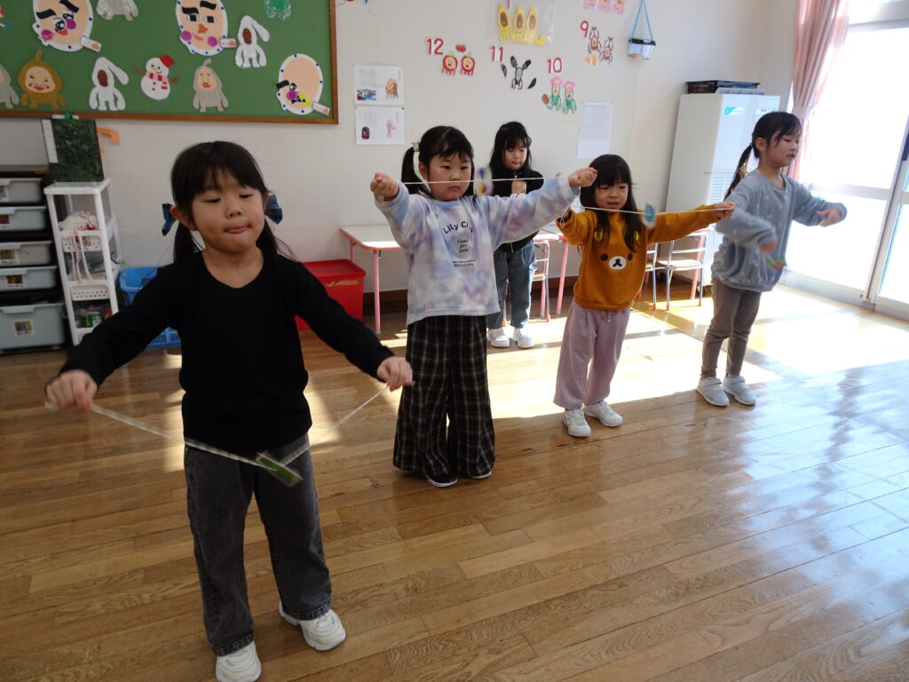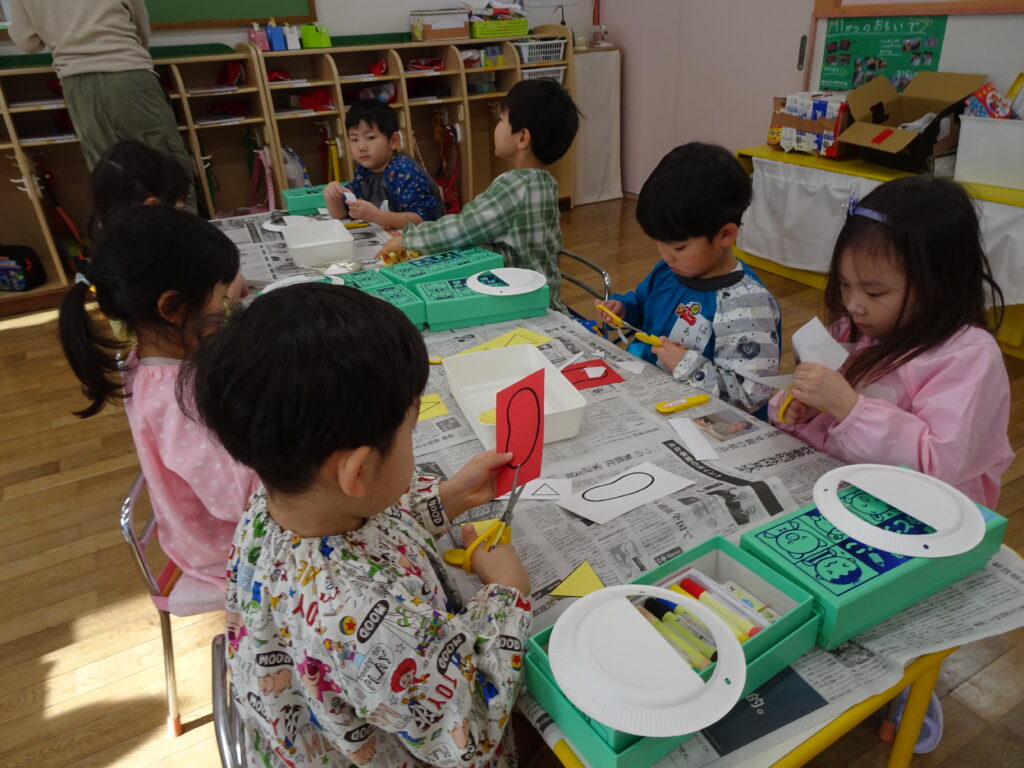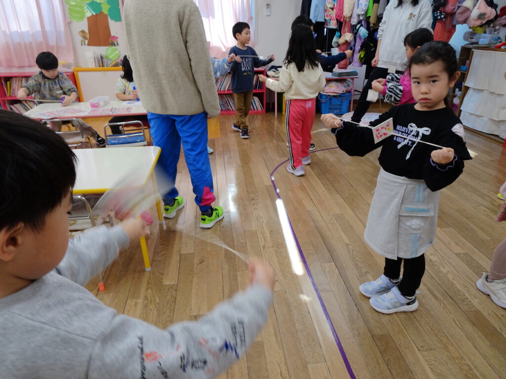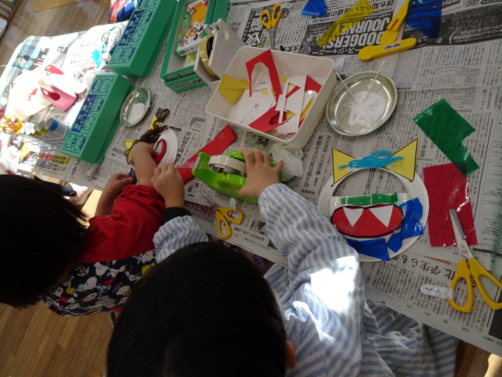 きりん組さんは「ぶんぶんゴマ」を作りました。絵を描いて、ひもを通して、クルクルねじって引っ張って…、ぶんぶんゴマの名人になれそうです。ぱんだ組さんは、節分の鬼のお面を作っていました。紙皿のお面に角や歯を貼って、あとは自分の使いたい素材で完成させました。ストロー、カラーセロファン、毛糸、色画用紙、シールなどを使って楽しい鬼ができました。うさぎ組さんはお遊戯室で「おおかみさん、おおかみさん、今何時?」を楽しみました。「おおかみさん、おおかみさん、今何時?」でおおかみさんが「12時!」と答えたら逃げるのですが「10時!」と言われてもワラワラ逃げるうさぎさんが可愛らしかったです。カンガルークラブさんはお部屋で「ジェットコースター」をしていました。プロジェクターで映したジェットコースターの景色を見ながら、先生に段ボール箱ジェットコースターを動かしてもらいました。「楽しい!」という子も、「怖い!」「乗らない。」の声も…。クリアのご褒美をもらってニコニコのカンガルーさんでした(森)