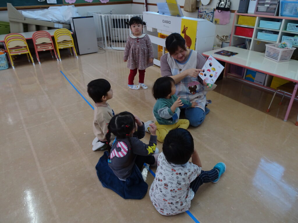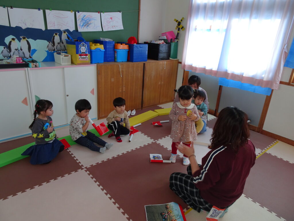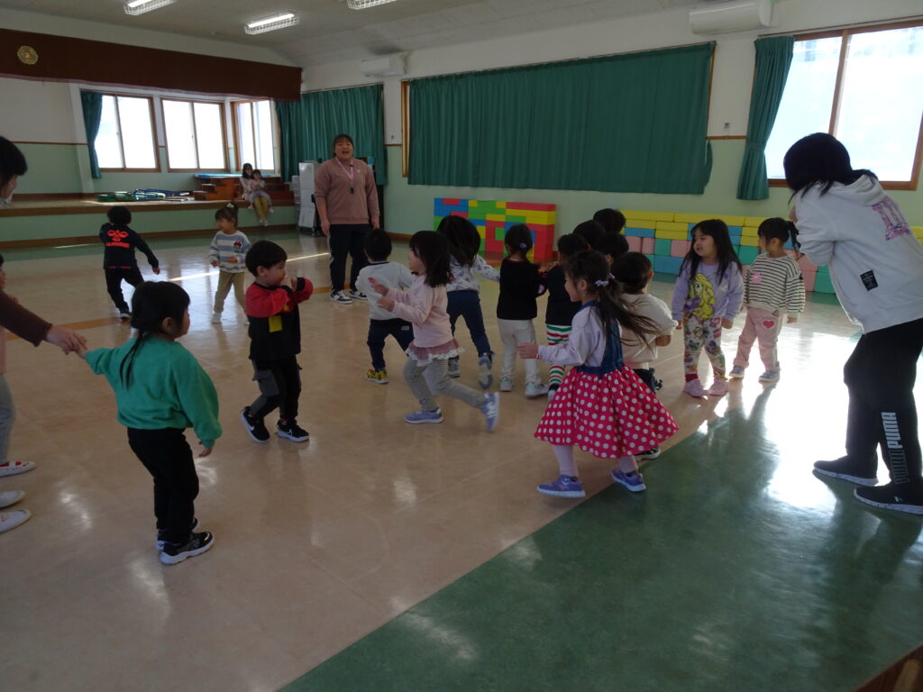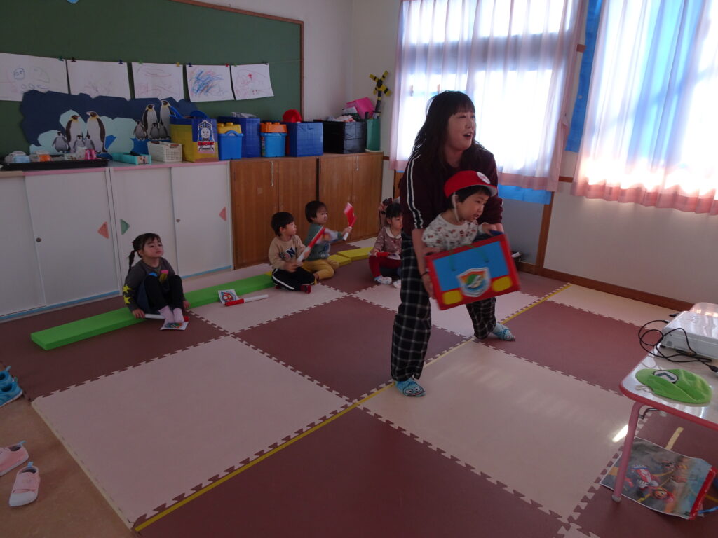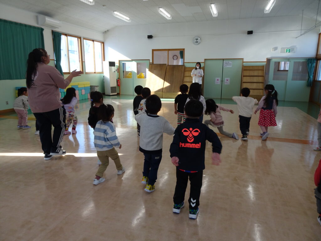 きりん組さんは「ぶんぶんゴマ」を作りました。絵を描いて、ひもを通して、クルクルねじって引っ張って…、ぶんぶんゴマの名人になれそうです。ぱんだ組さんは、節分の鬼のお面を作っていました。紙皿のお面に角や歯を貼って、あとは自分の使いたい素材で完成させました。ストロー、カラーセロファン、毛糸、色画用紙、シールなどを使って楽しい鬼ができました。うさぎ組さんはお遊戯室で「おおかみさん、おおかみさん、今何時?」を楽しみました。「おおかみさん、おおかみさん、今何時?」でおおかみさんが「12時!」と答えたら逃げるのですが「10時!」と言われてもワラワラ逃げるうさぎさんが可愛らしかったです。カンガルークラブさんはお部屋で「ジェットコースター」をしていました。プロジェクターで映したジェットコースターの景色を見ながら、先生に段ボール箱ジェットコースターを動かしてもらいました。「楽しい!」という子も、「怖い!」「乗らない。」の声も…。クリアのご褒美をもらってニコニコのカンガルーさんでした(森)