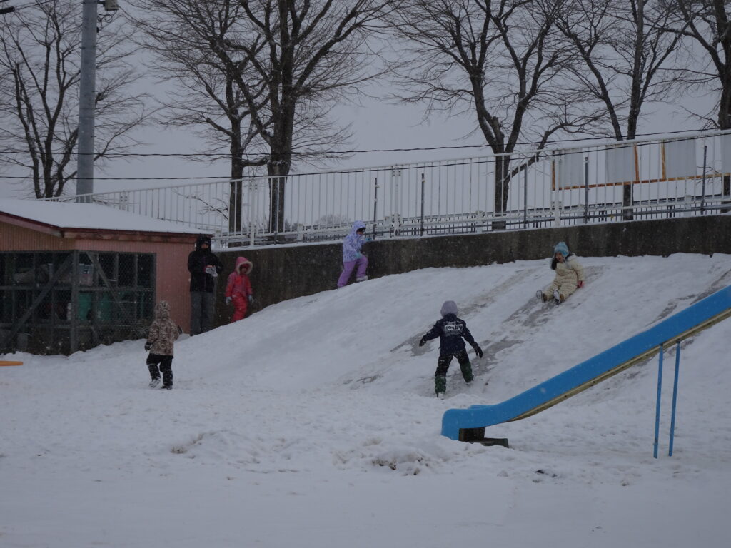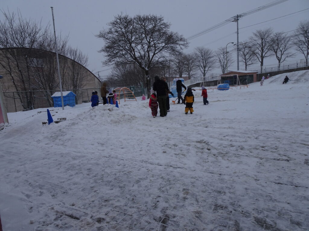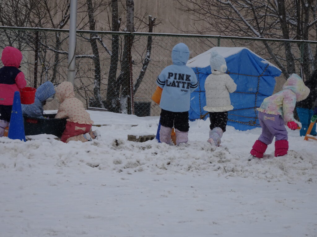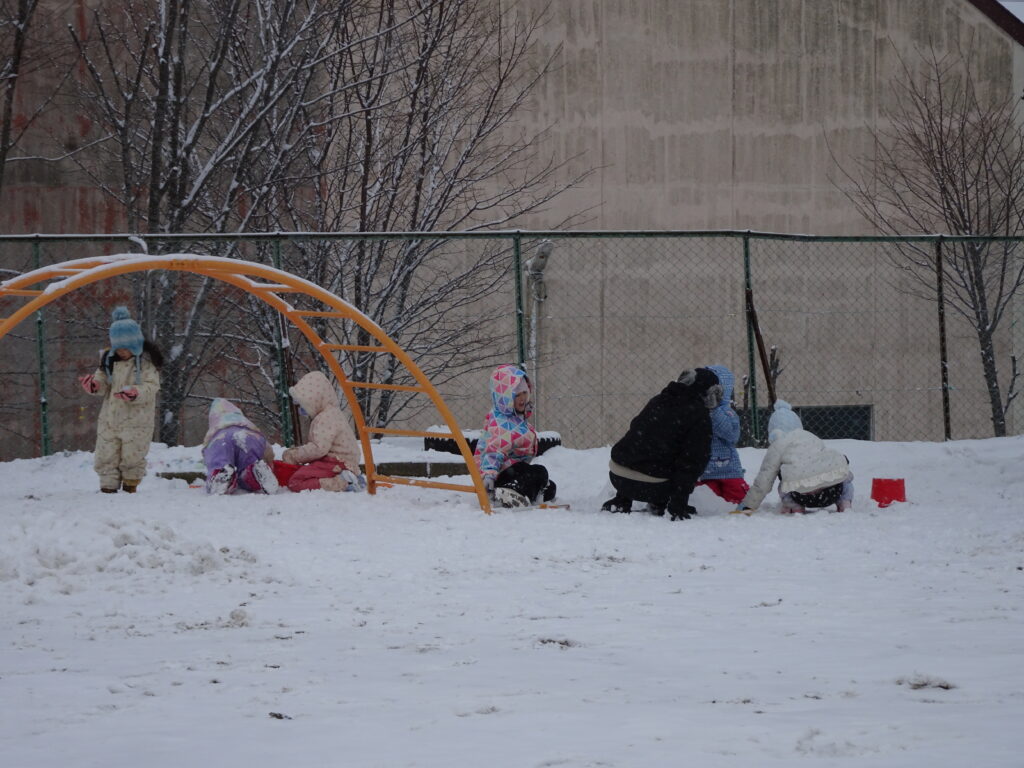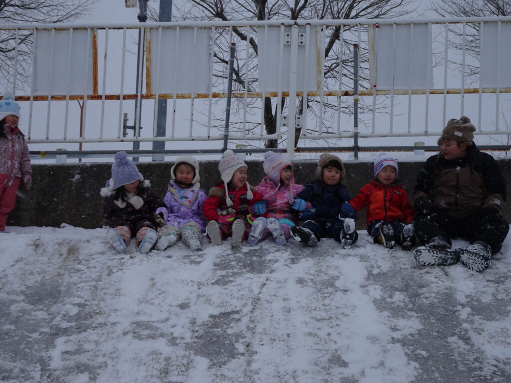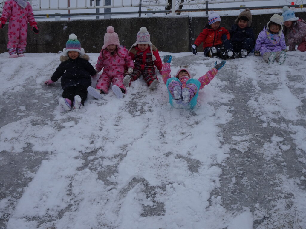 「雪が降らない…。」と言っていた釧路にも、やっと雪が降りました。約10cm?でしょうか…。子ども達は園庭で朝から楽しく雪遊びをしました。雪の下が氷なので「お尻でもすごく滑った!」と坂を滑って楽しんでいました。