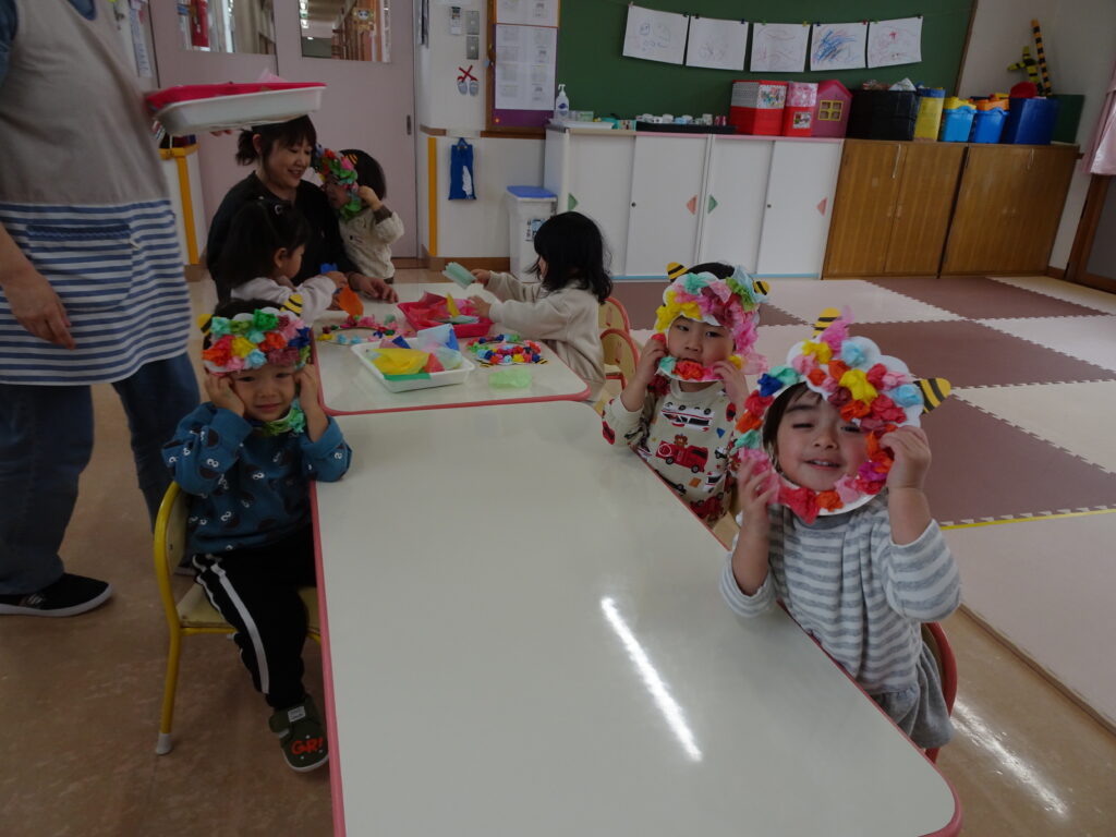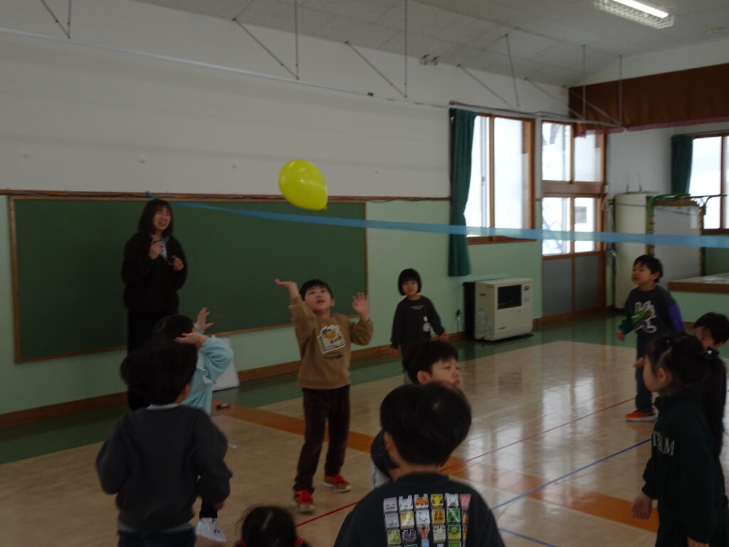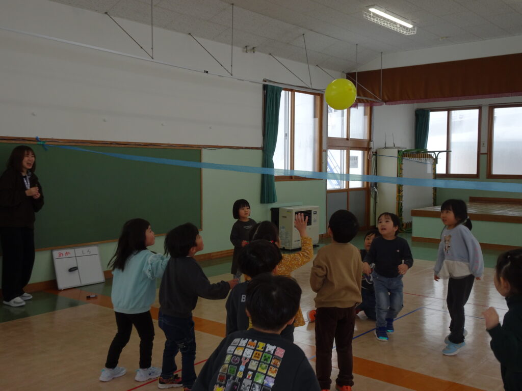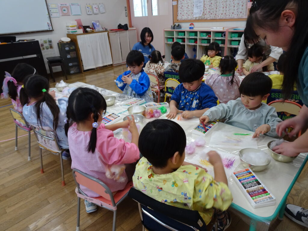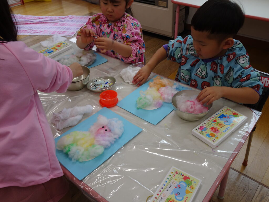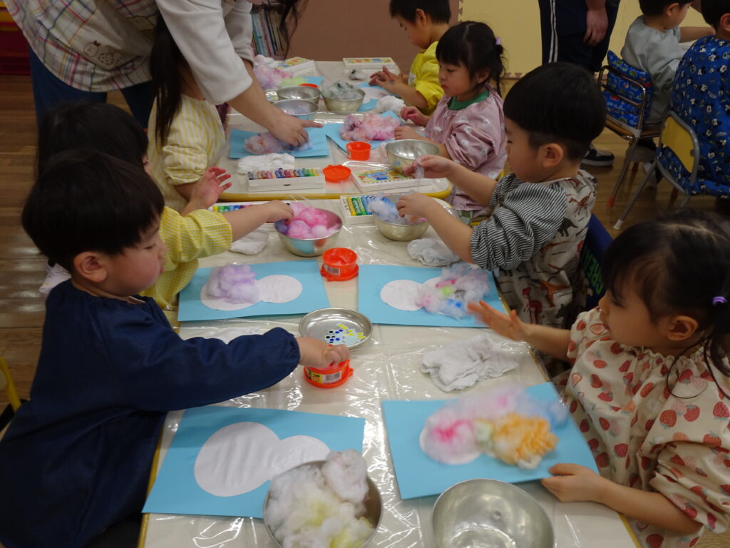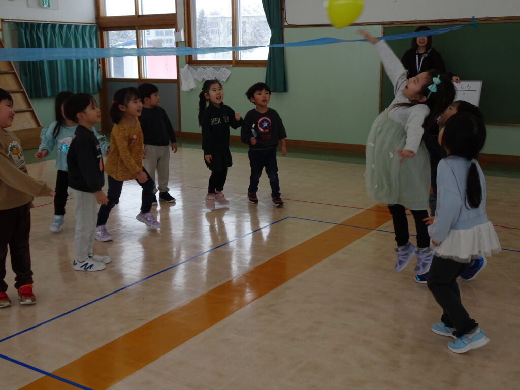 設定保育で、きりん組さんは、園庭で「雪遊び」をしました。滑ったり、掘ったり、雪だるまを作ったり思い思いに楽しみました。ぱんだ組さんは、お遊戯室で「風船バレー」をしました。最初は戸惑っていた子ども達も作戦会議をして、どんどん上手になりました。うさぎ組さんは、あおい先生の保育で綿にクレヨンで色を付けて、雪だるまを作りました。カラフルな雪だるまができました!カンガルークラブさんは「オニのお面」を作りました。土台の両面テープを剥がして、お花紙をクルクル丸めてペタペタ貼りました。可愛い鬼ができました。