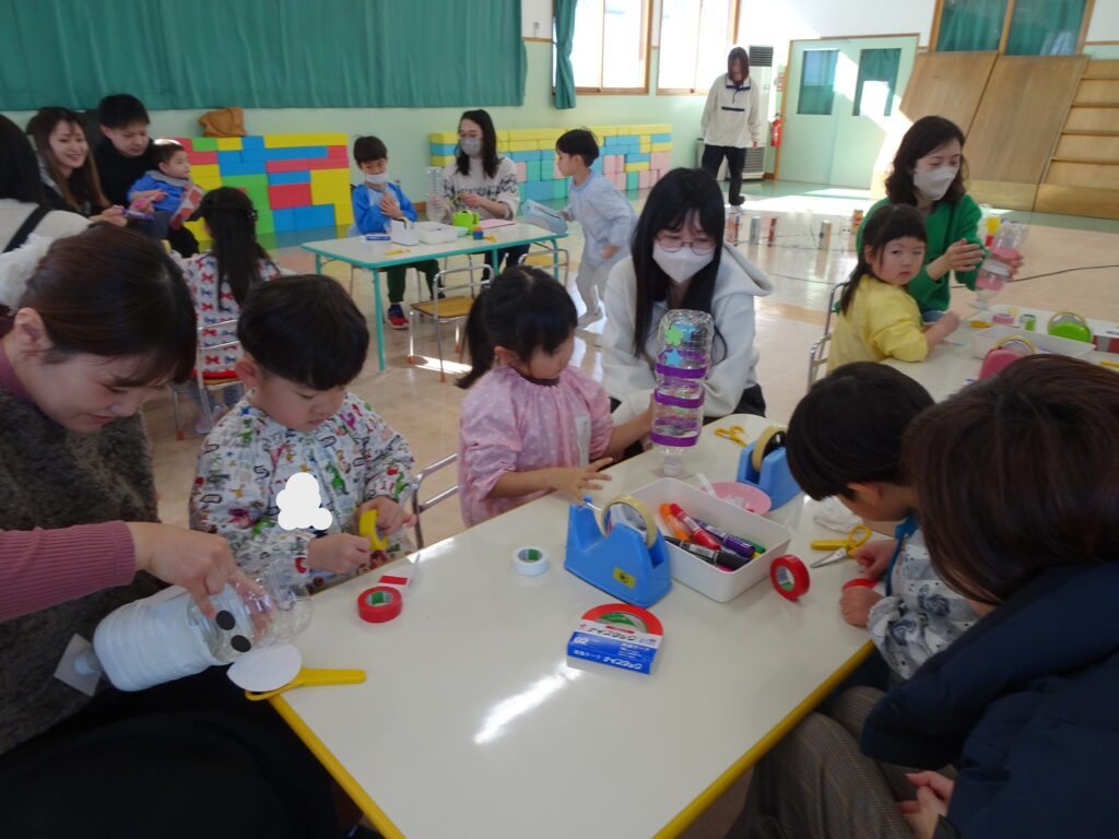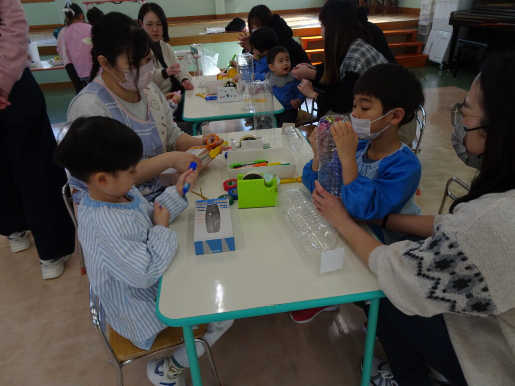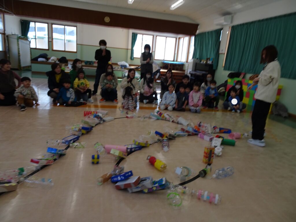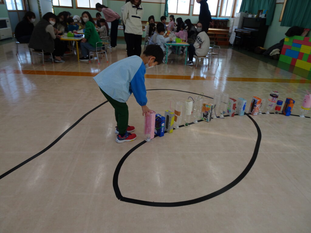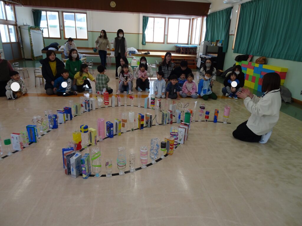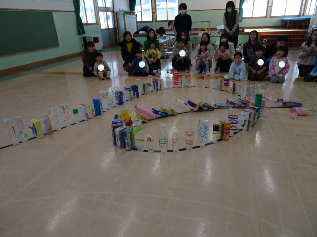 今日はぱんだ組さんの保育参観で、「ドミノ作り」をしました。ティッシュの箱やペットボトルから好きな物を選んで、色を塗ったり、色紙やシール、モールを貼って、保護者と一緒に約80本のドミノを完成させました。動物のドミノや、お花のドミノ、時計のドミノもあってとても素敵でした。最後に皆で「3・2・1!」の掛け声、ゆい先生がつついて(途中で止まることもありましたが…)全部倒れて大拍手でした!お忙しい中ご参観いただいた保護者の皆様、ありがとうございました。