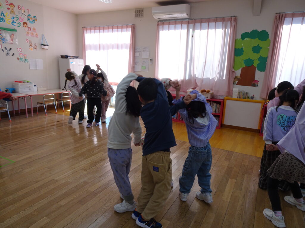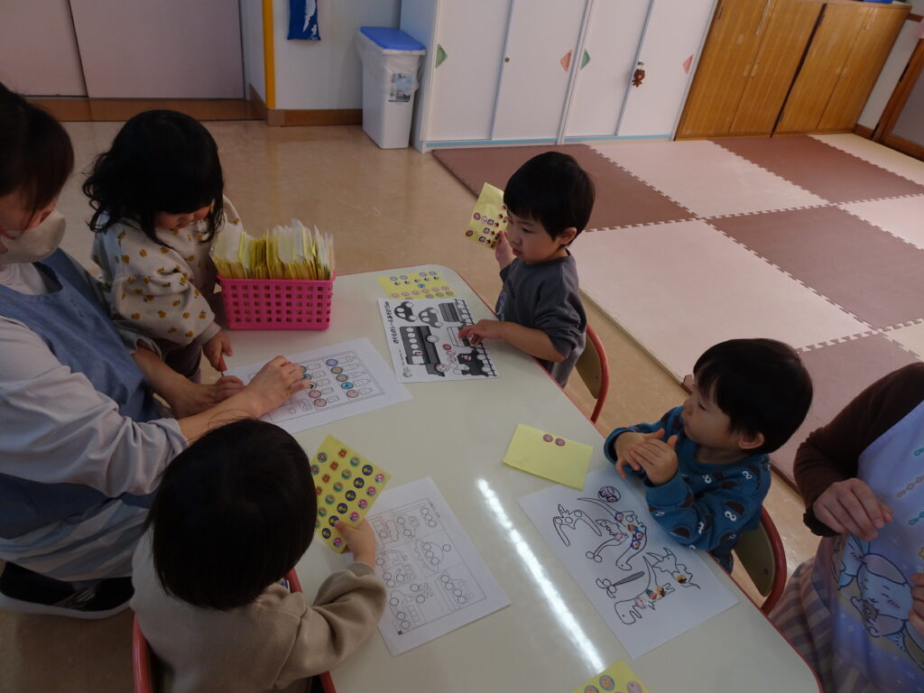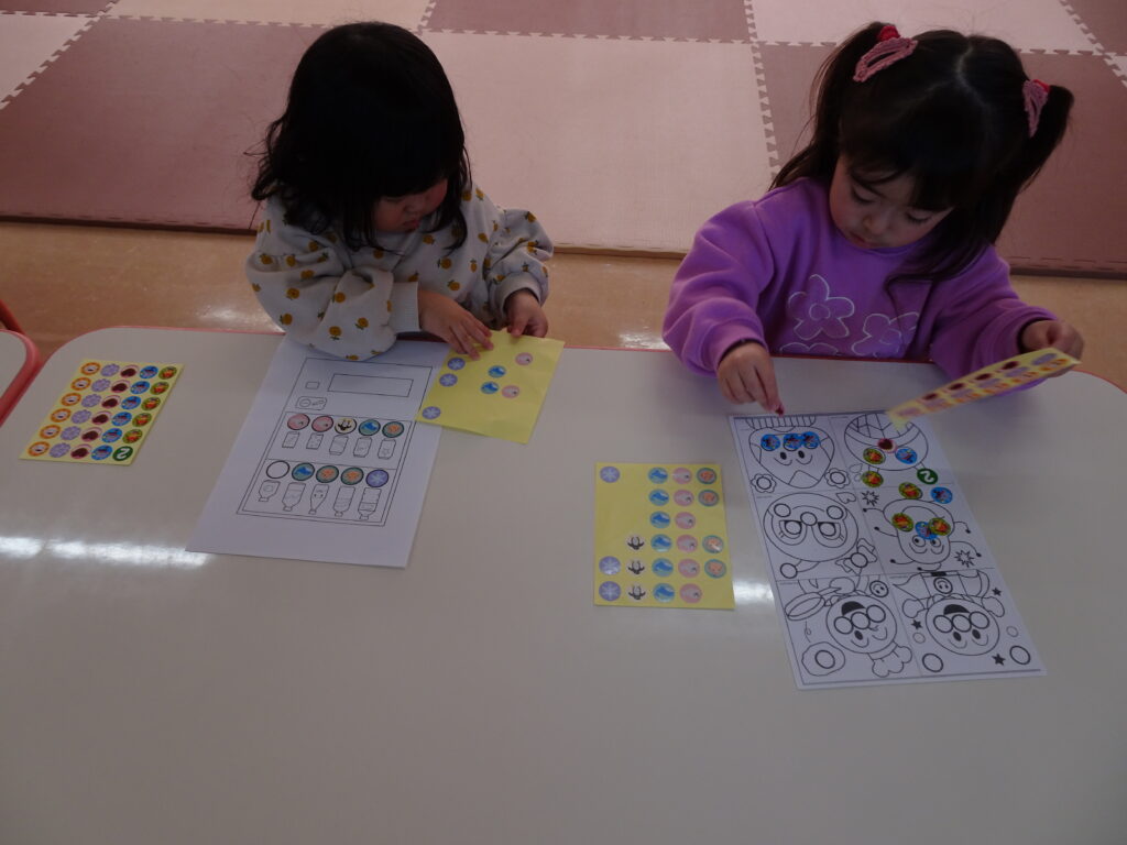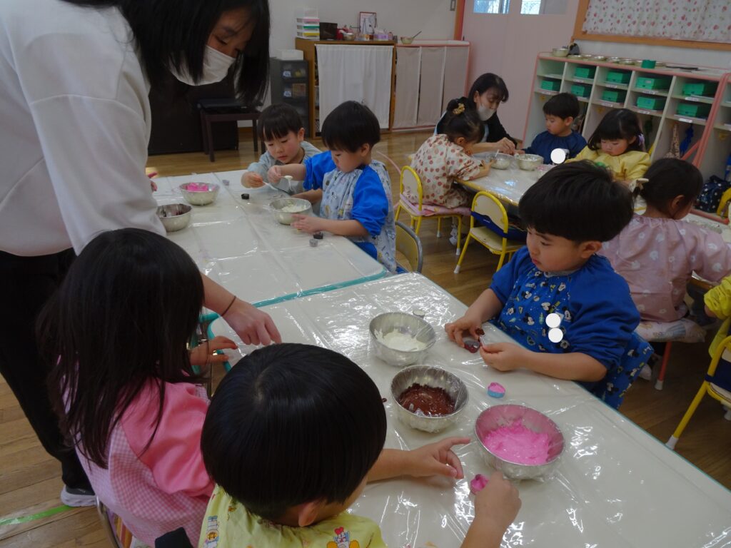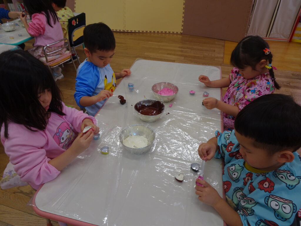 きりん組さんは卒園式の歌の練習をして、お部屋で伝承遊び「なべなべそこぬけ」「花いちもんめ」を楽しみました。うさぎ組さんは3色の「チョコレートづくり」を楽しみました。「間違えて食べないでね!!」という素敵なチョコレートができました。カンガルーさんはシールをペタペタ貼って「シール遊び」を楽しみました。